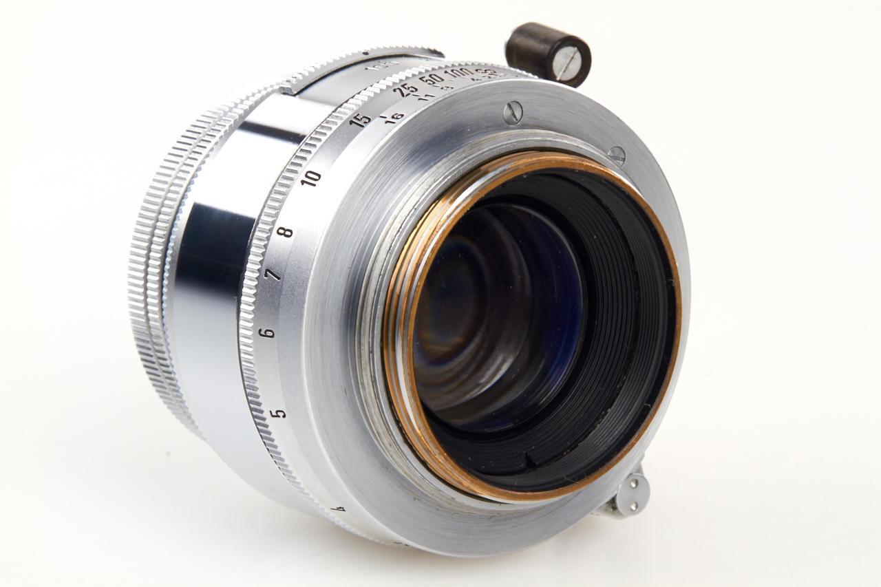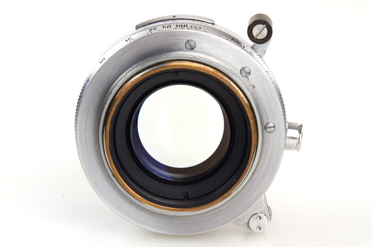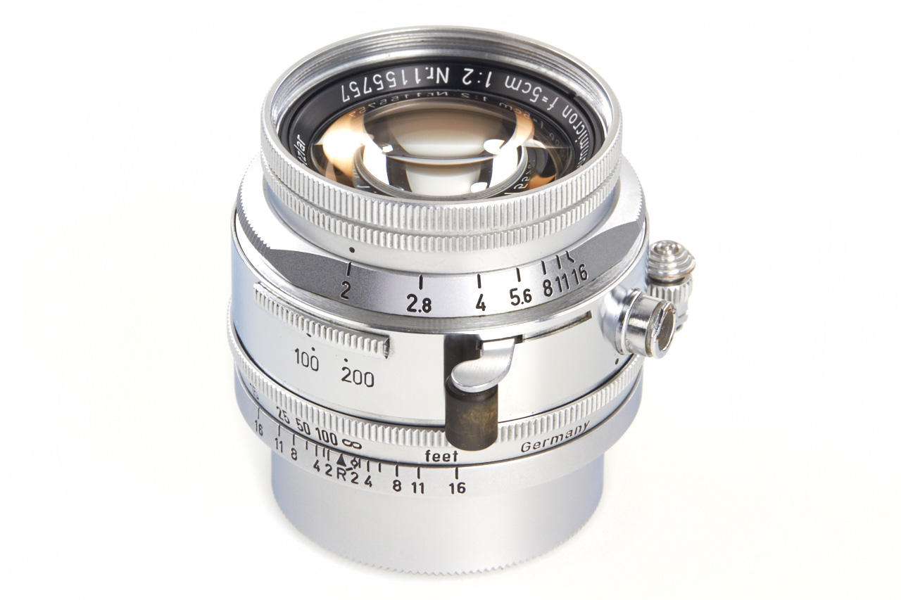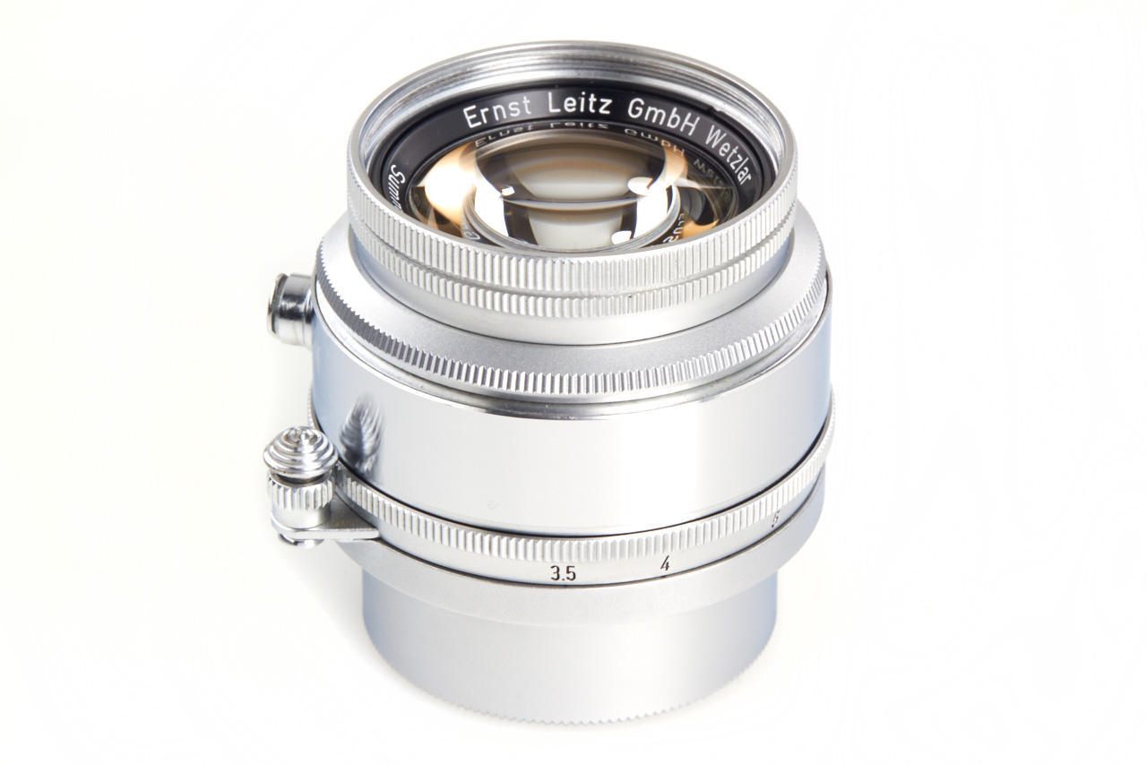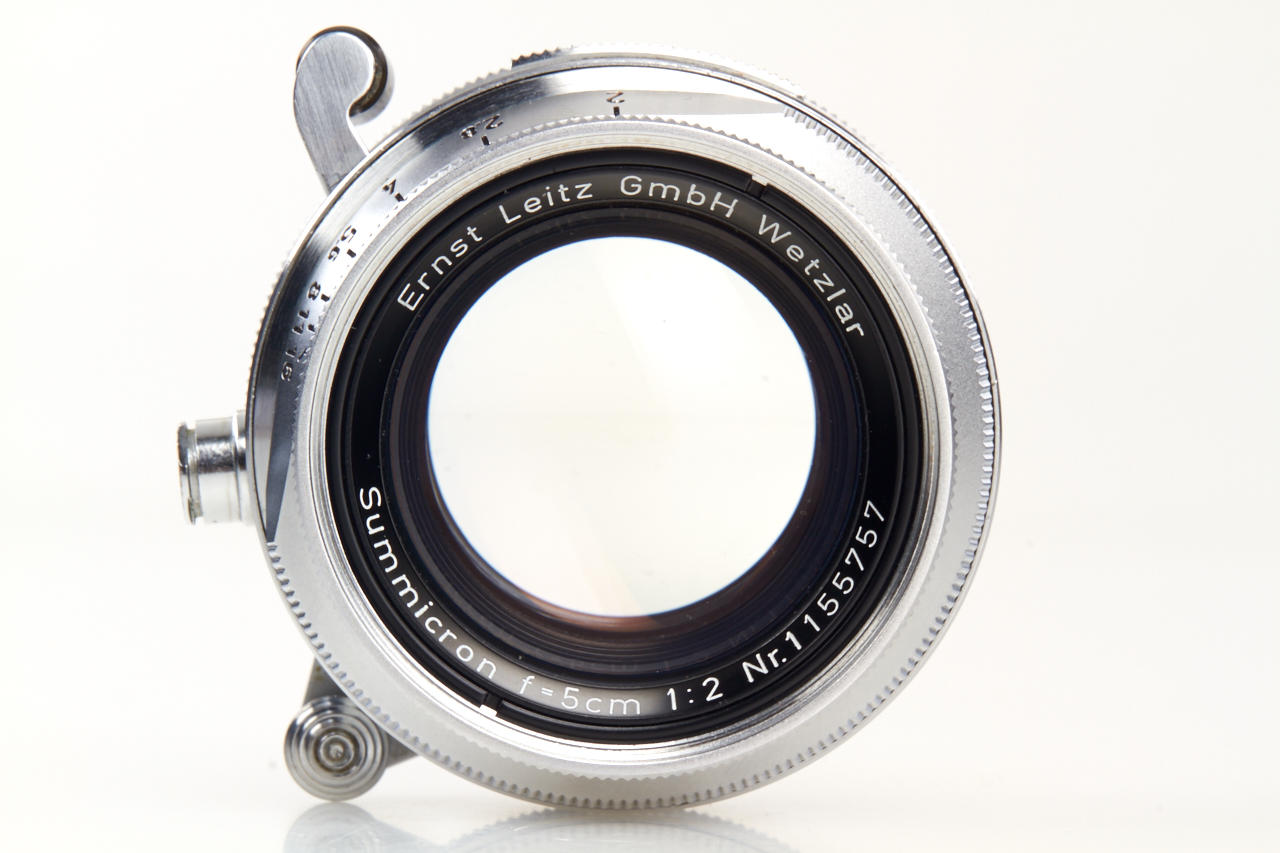 very rare Summicron with built-in Compur shutter, synchronised for 1/100 + 1/200 sec., feet scale, engraved 'Germany', in new condition with perfect clean optics, with the original shutter release linkage and both caps