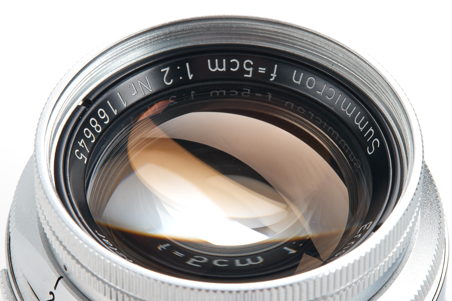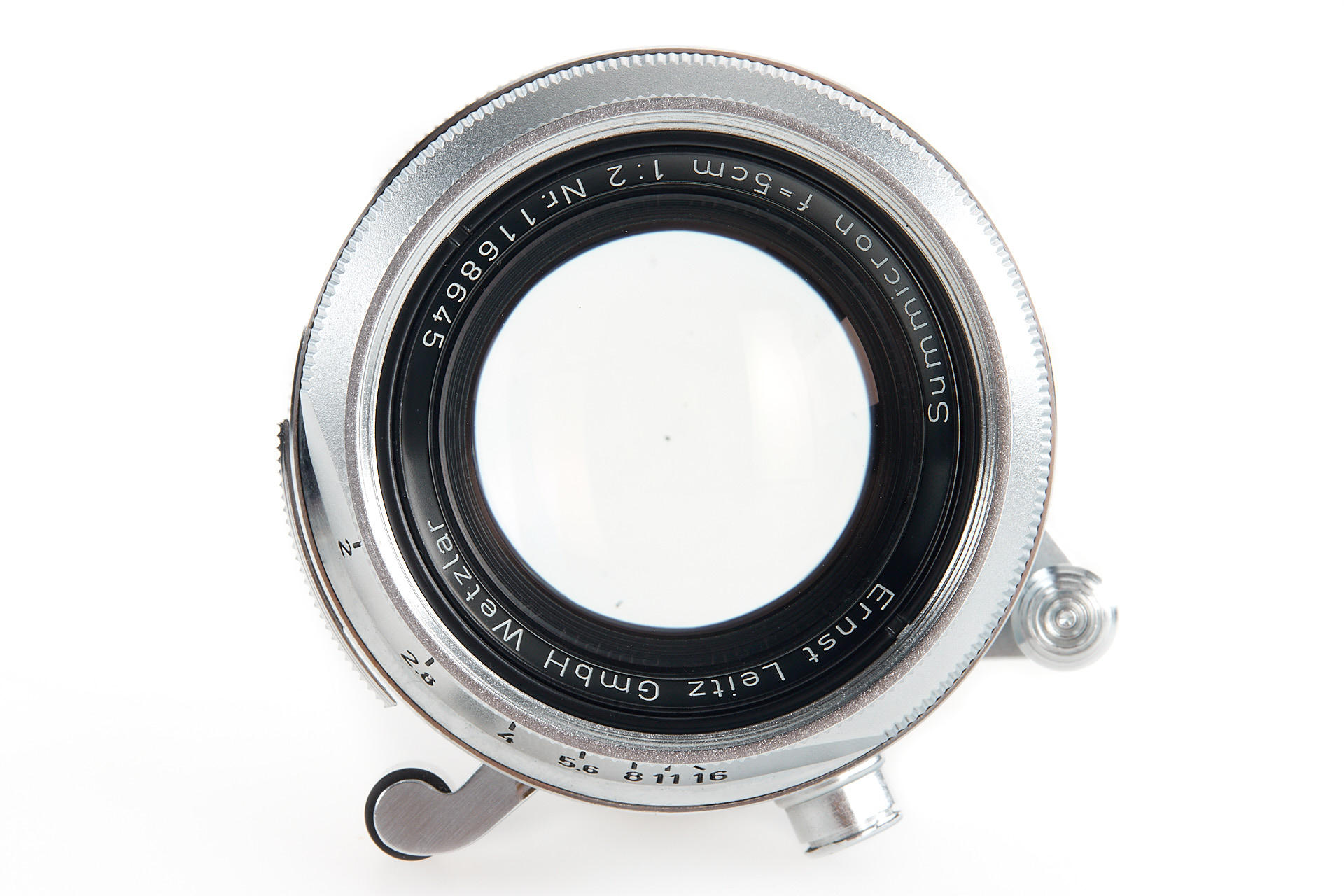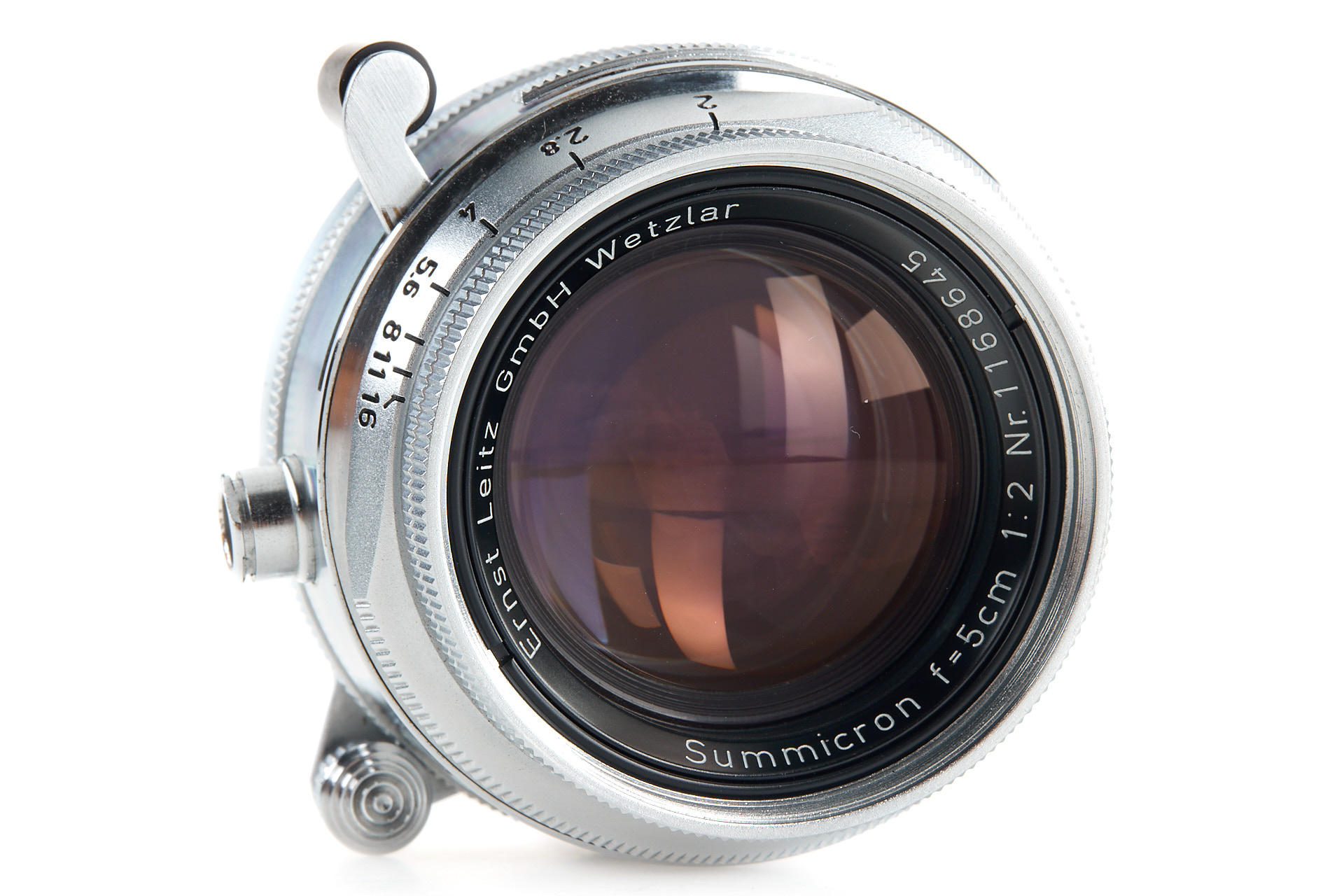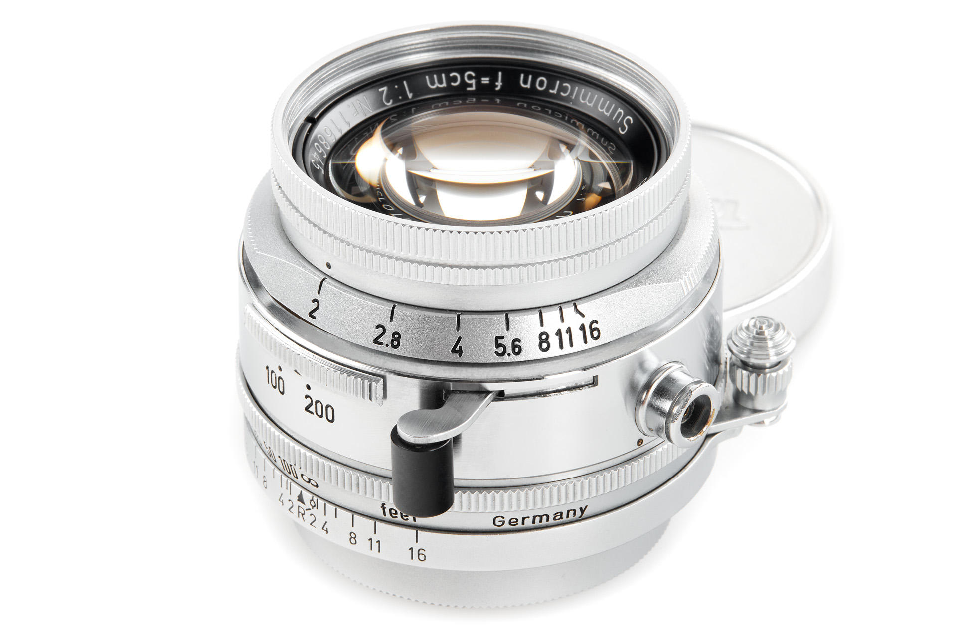Very rare Summicron with built-in Compur shutter, flash-synchronization for 1/100 + 1/200 sec., feet scale, engraved 'Germany', in near mint condition, optics slightly hazy, incl. both caps, only around 150 of these lenses have been made, it is hard to find one in this good condition