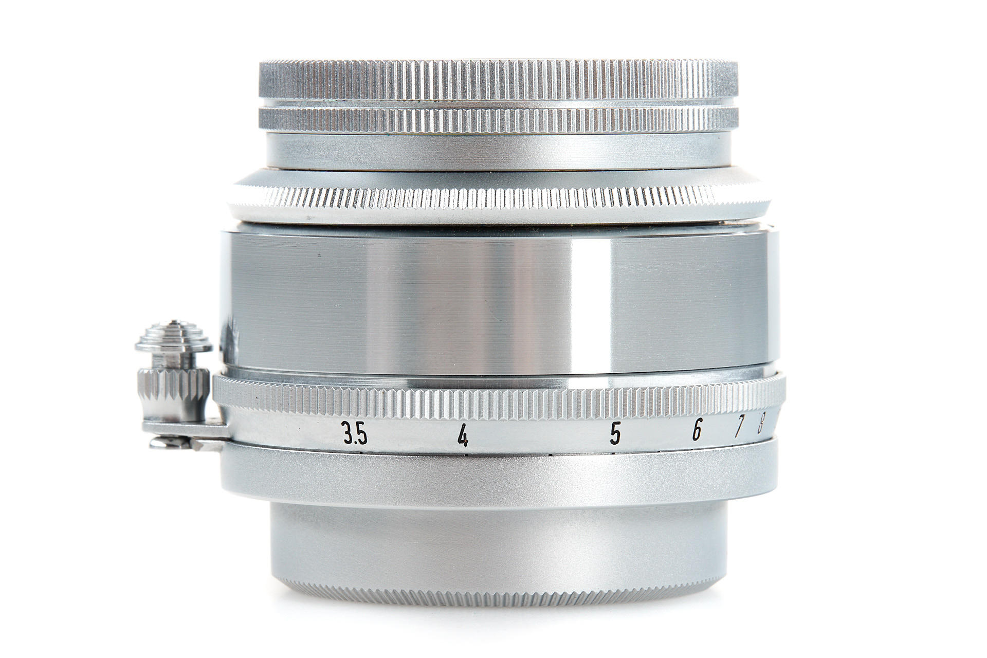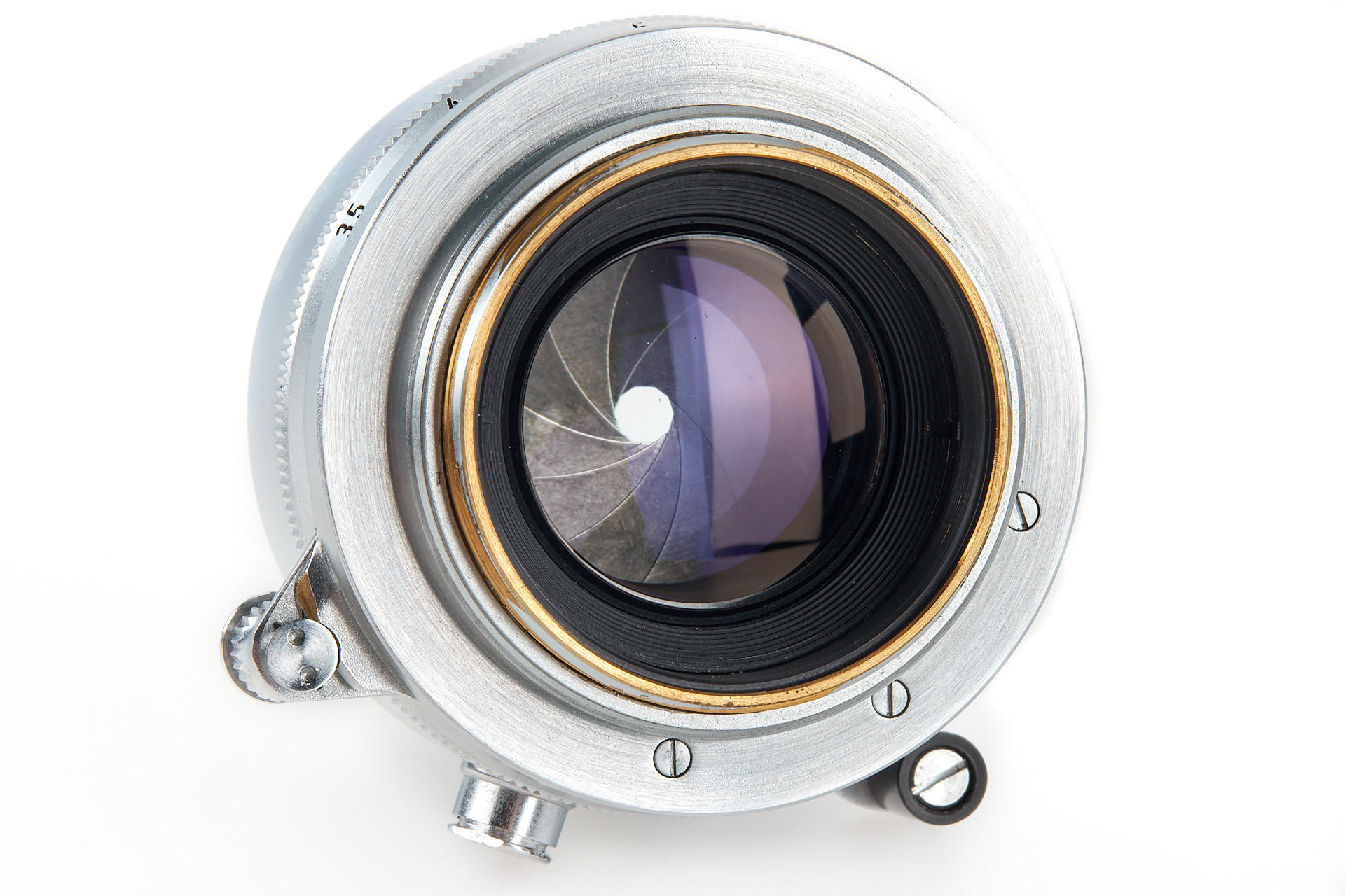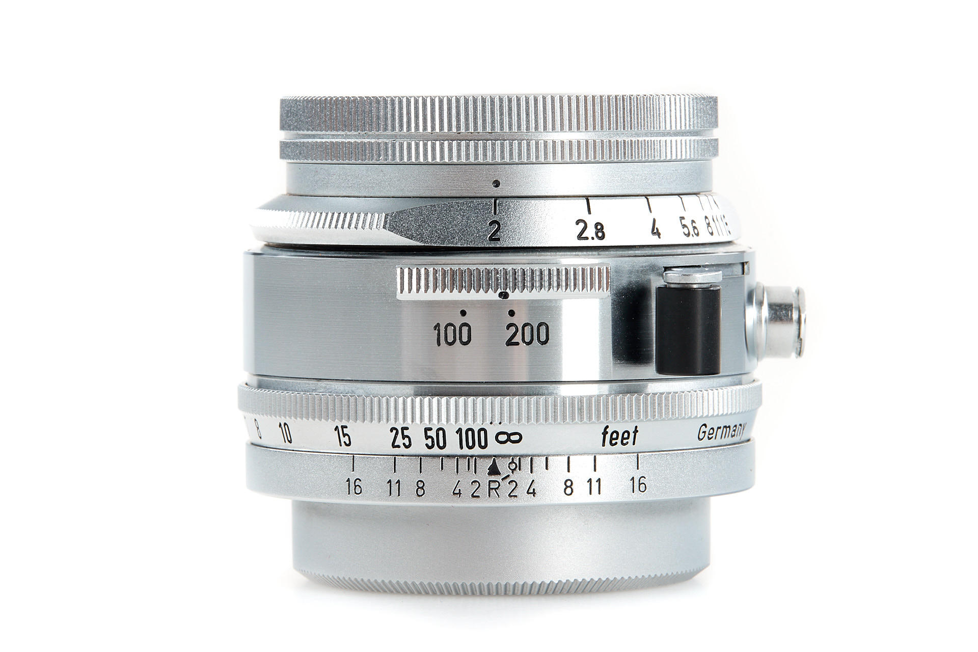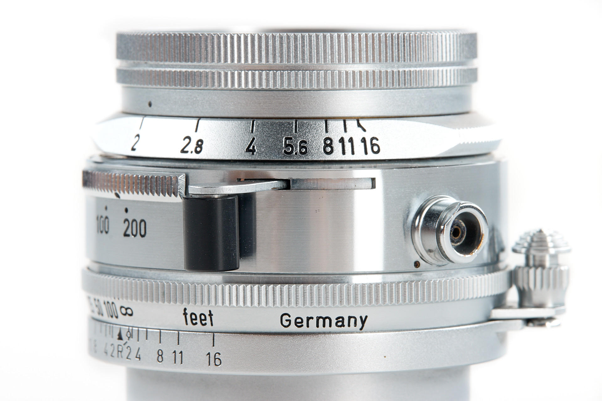 Very rare Summicron with built-in Compur shutter, flash-synchronization for 1/100 + 1/200 sec., feet scale, engraved 'Germany', in near mint condition, optics slightly hazy, incl. both caps, only around 150 of these lenses have been made, it is hard to find one in this good condition