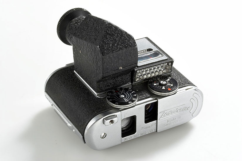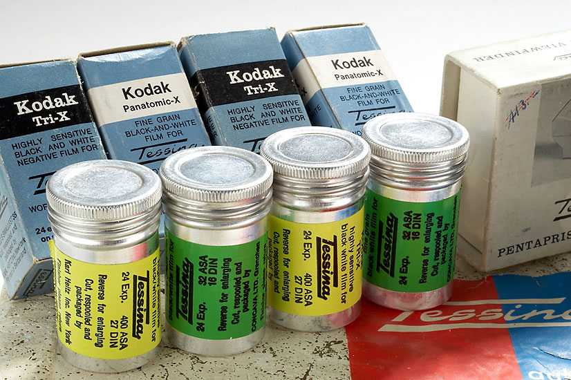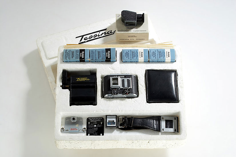 outfit including rare exposure meter (in working order), waist level finder, black ever ready case, tripod plate, black wrist band, 2x Kodak Tri-X films and 2x Kodak Panatomic-X films in maker's boxes, all in matching maker's box, and a Tessina penta-prism viewfinder in maker's box