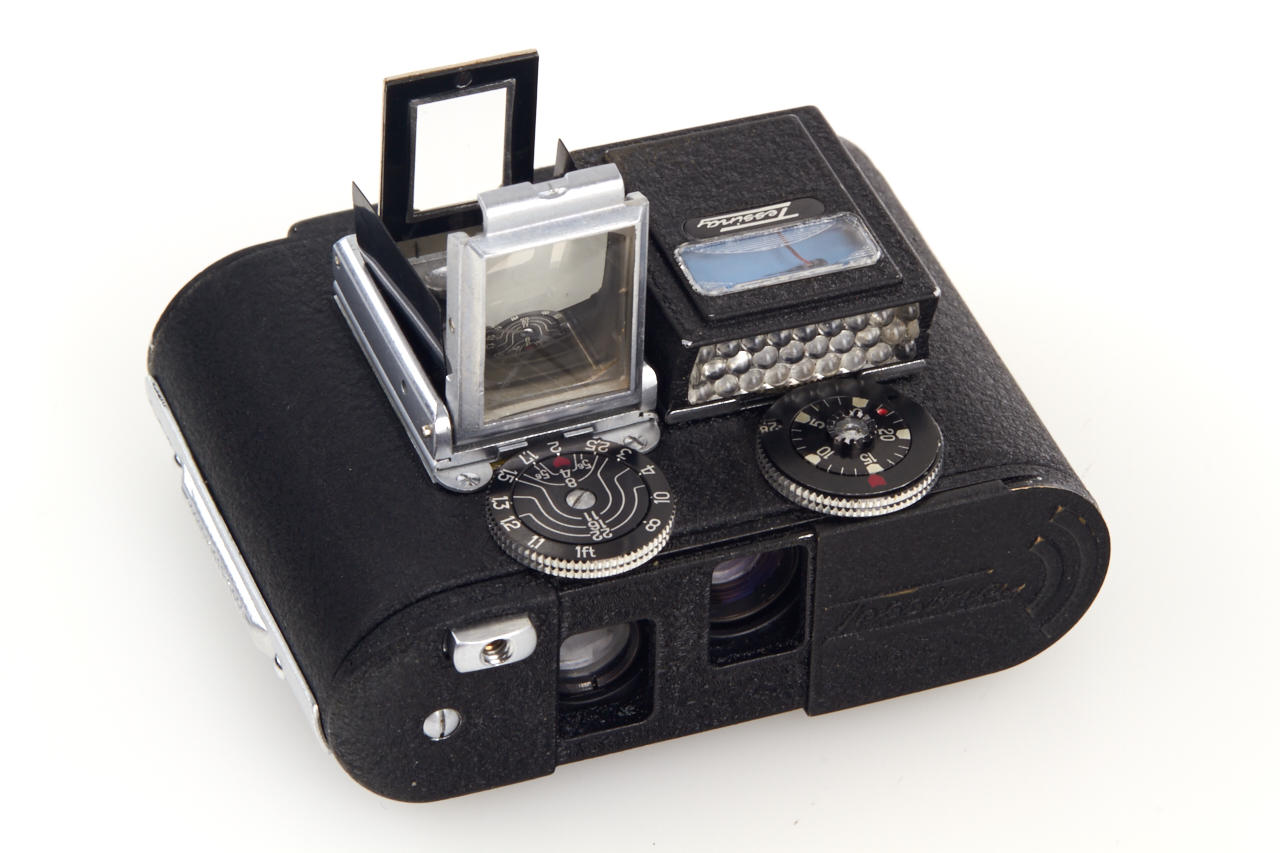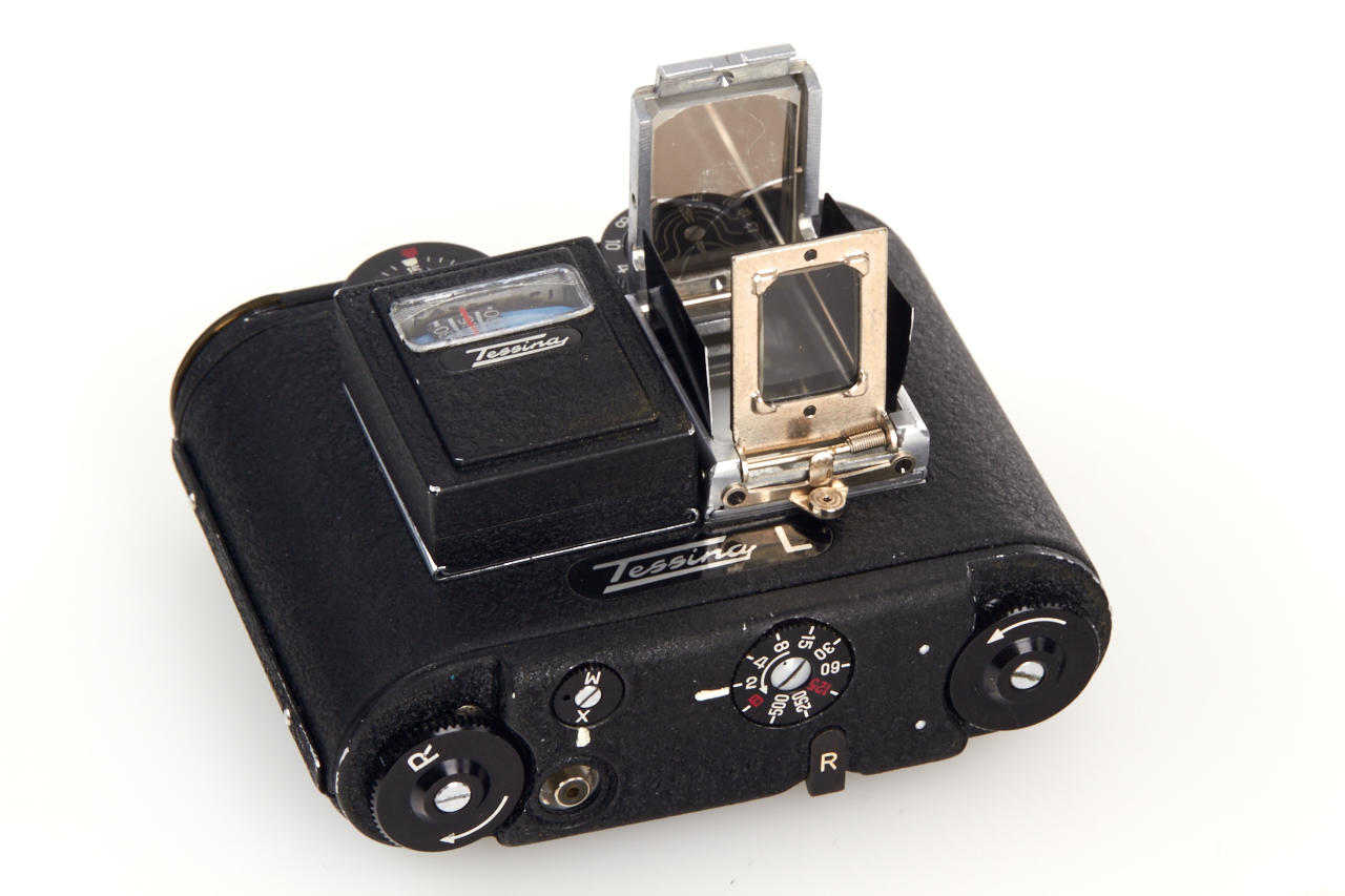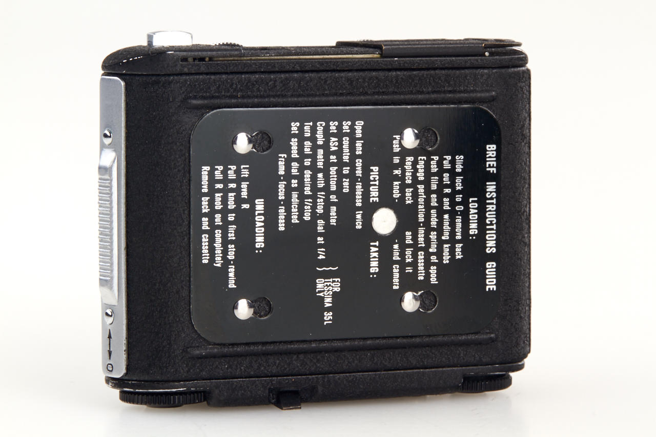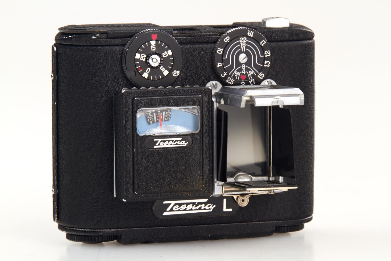 rare all-black Tessina in very good working condition with finder and the rare black meter in working condition, attached metal instructions guide, red/blue presentation box