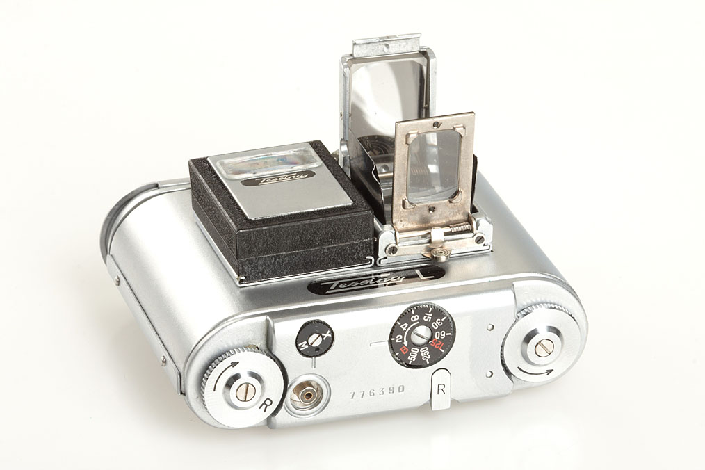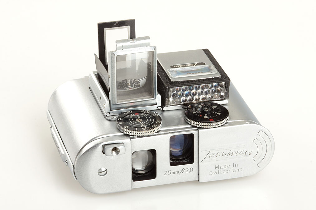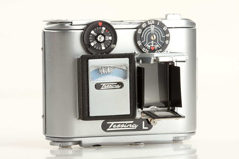 extensive Tessina L outfit including: camera with waist-level finder, DIN/ASA plate, maker's box, everready case, tripod adapter with chain, black wrist strap, black 8x magnifier in maker's box, black pentaprism viewfinder in maker's box, black/chrome exposure meter (working) with instructions in maker's box, film loader in case, 4x metal film containers, 5 spools, brief instruction guide, instruction book, brochure and price list - hard to find such a complete outfit