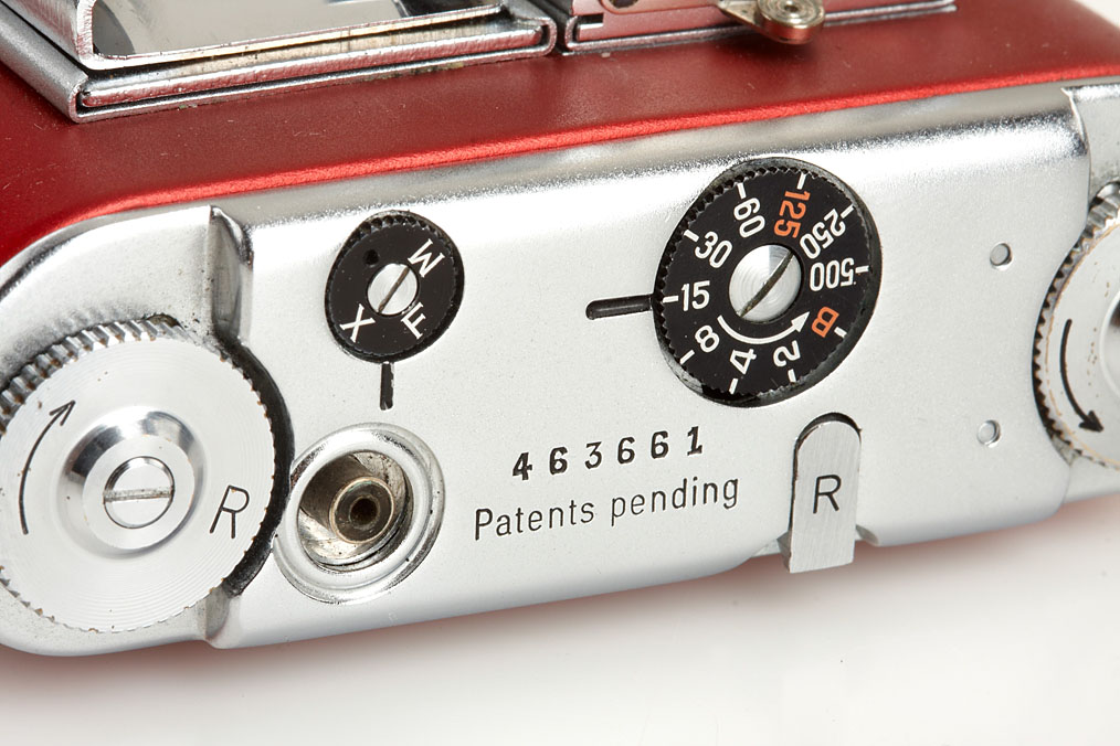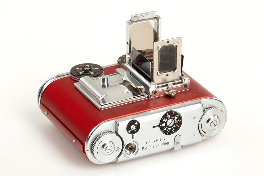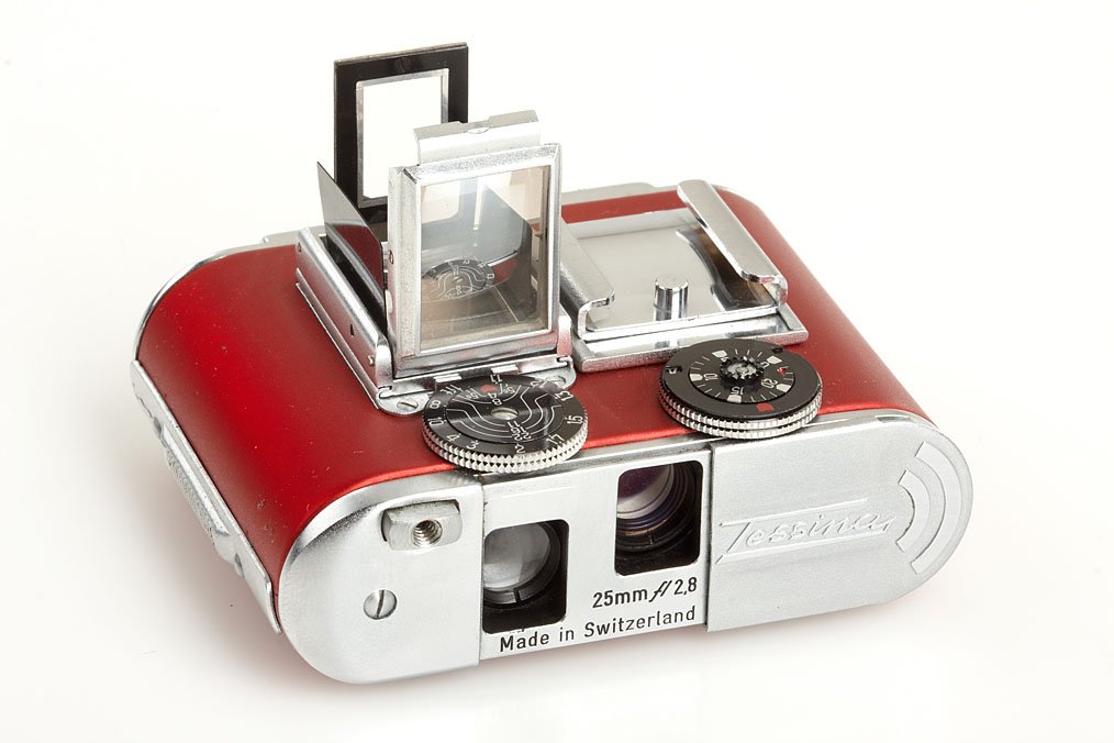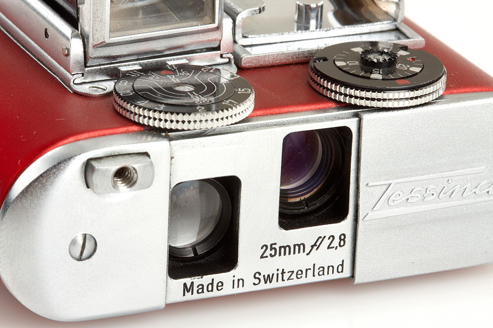 Tessina outfit including rare red camera with waist-level finder, accessory shoe, everready case, brown wrist strap, green filter, film loader, 8x metal film containers, 8 spools