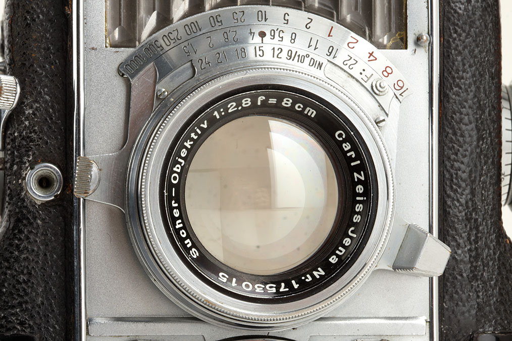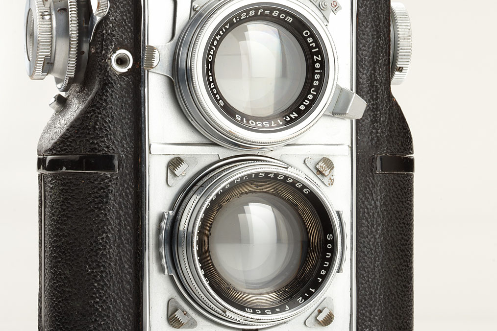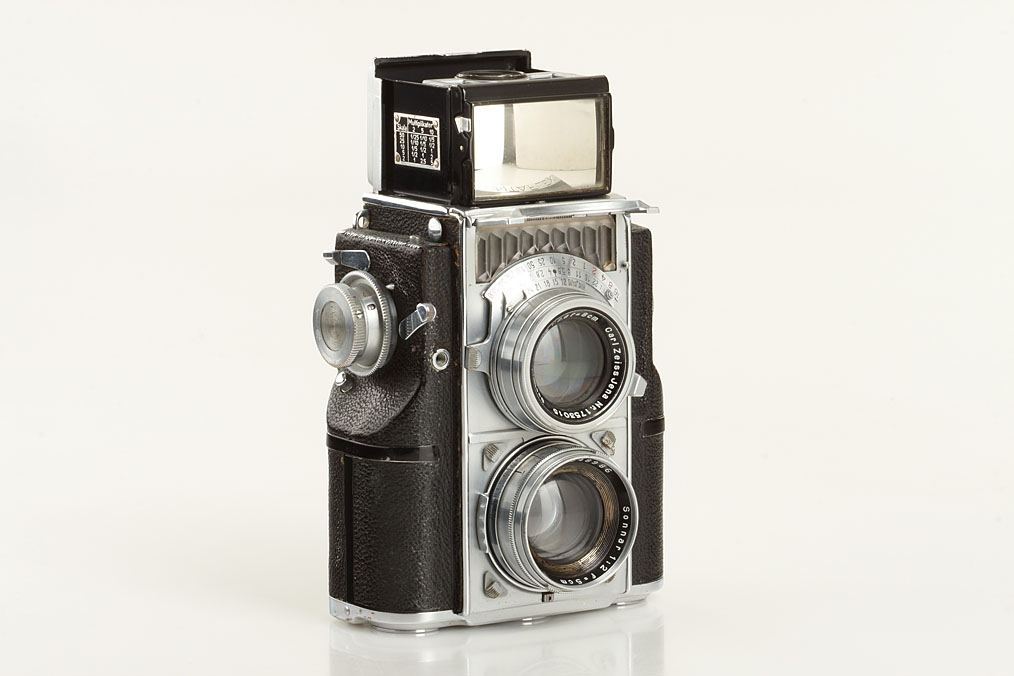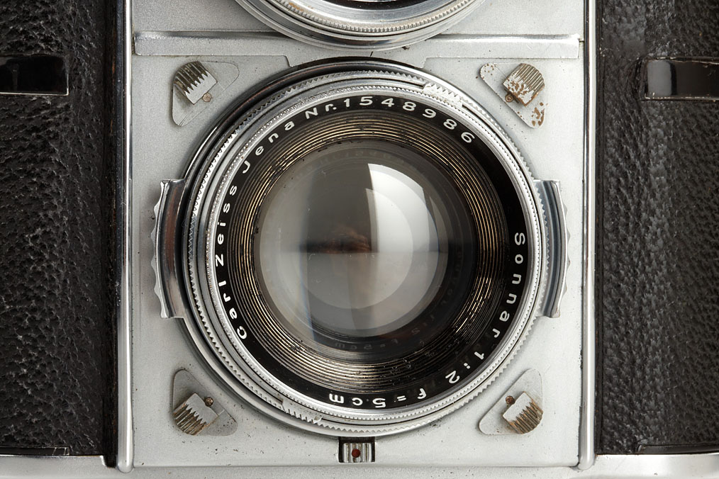 35mm TLR with Sonnar 2/5cm no.1548986 in good working order (meter is not functional), back door with matching serial number, Sonnar 4/13.5cm no.1758943 with cap, feet scale, engraved: Made in Germany, a copy of the instructions book