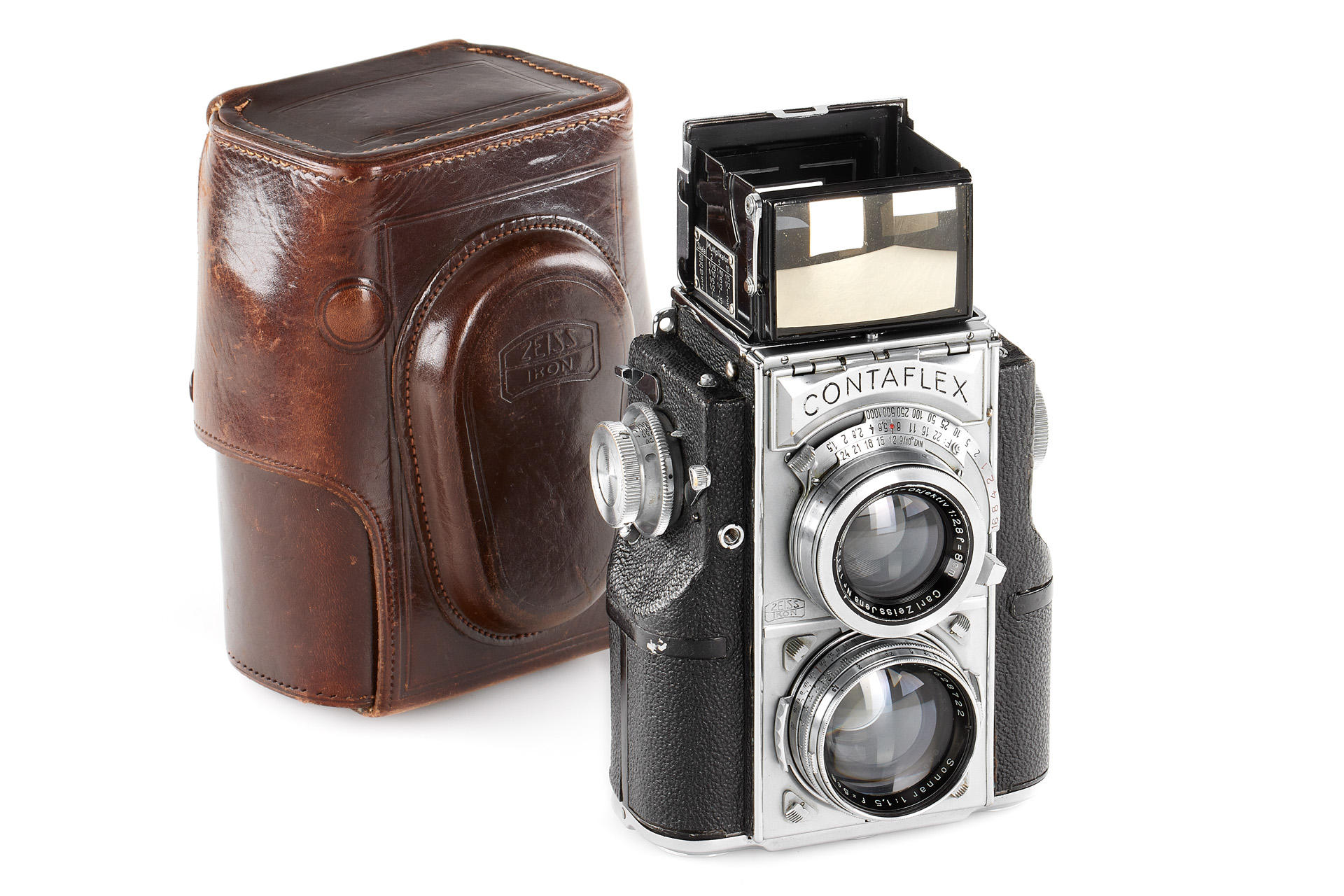 35mm TLR camera in very good condition and working order (light meter not responding), late version with Zeiss Ikon logo on front plate, with Sonnar 1.5/5cm no.1628722, lenses cap and leather case