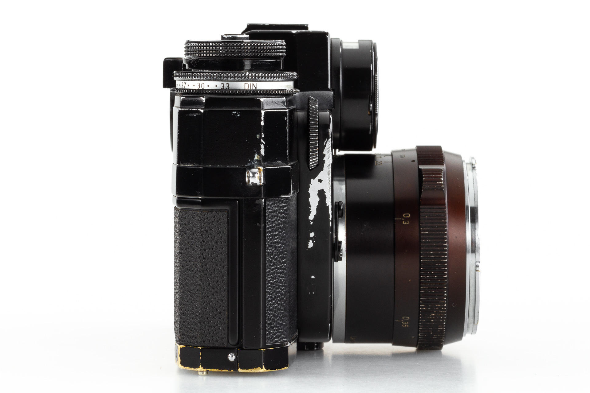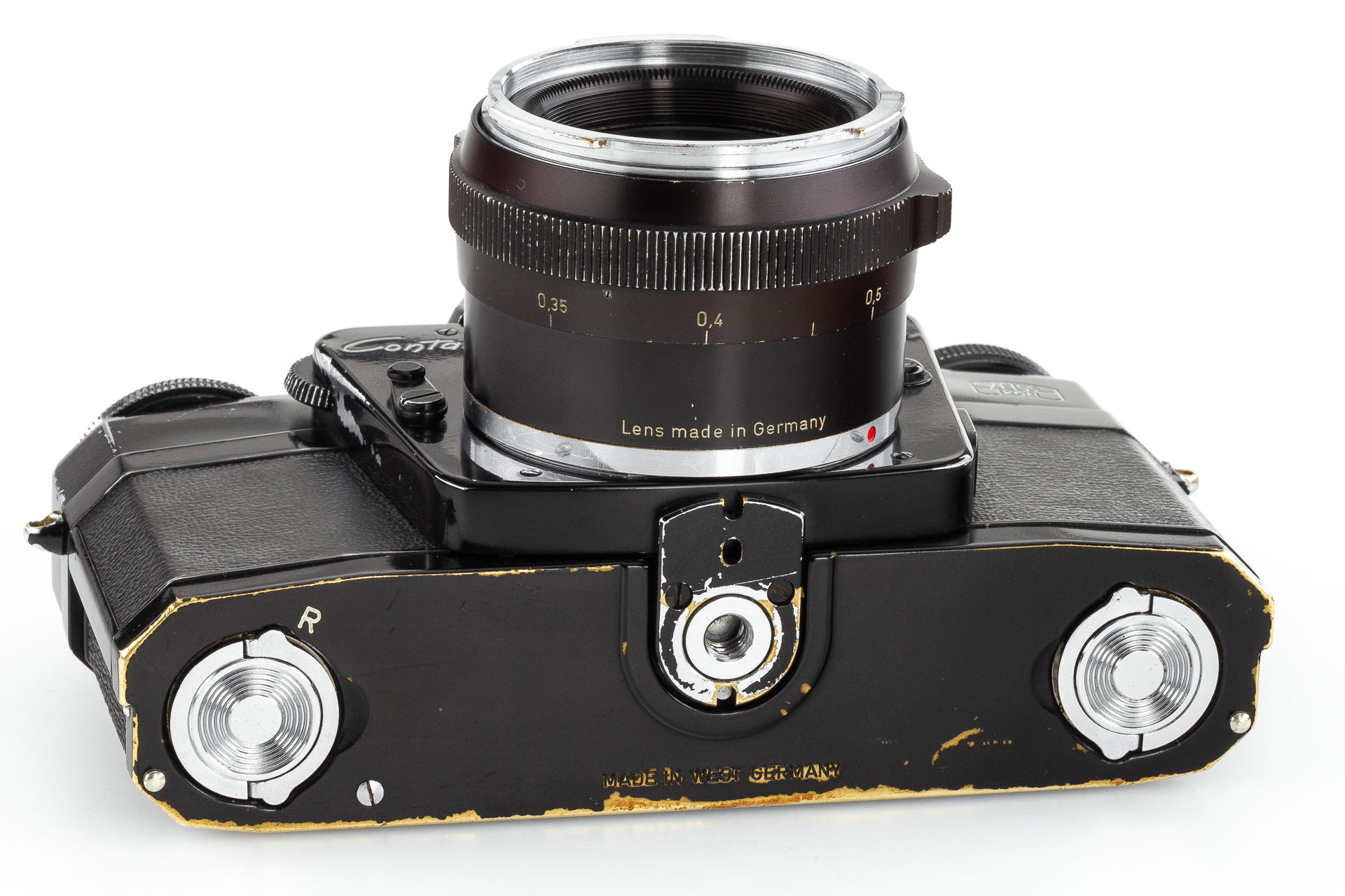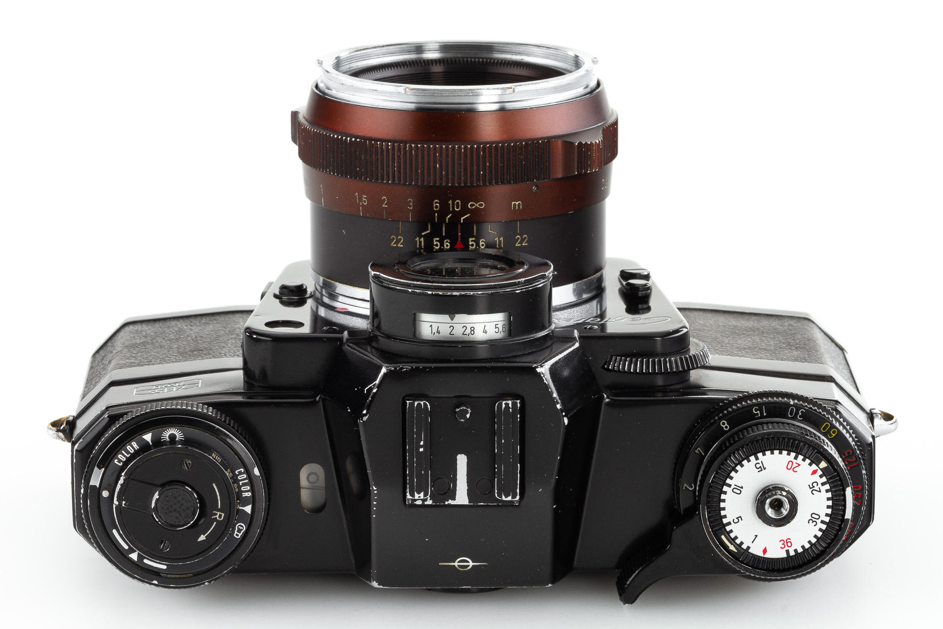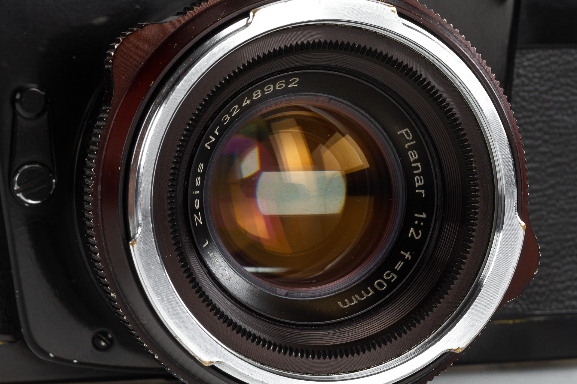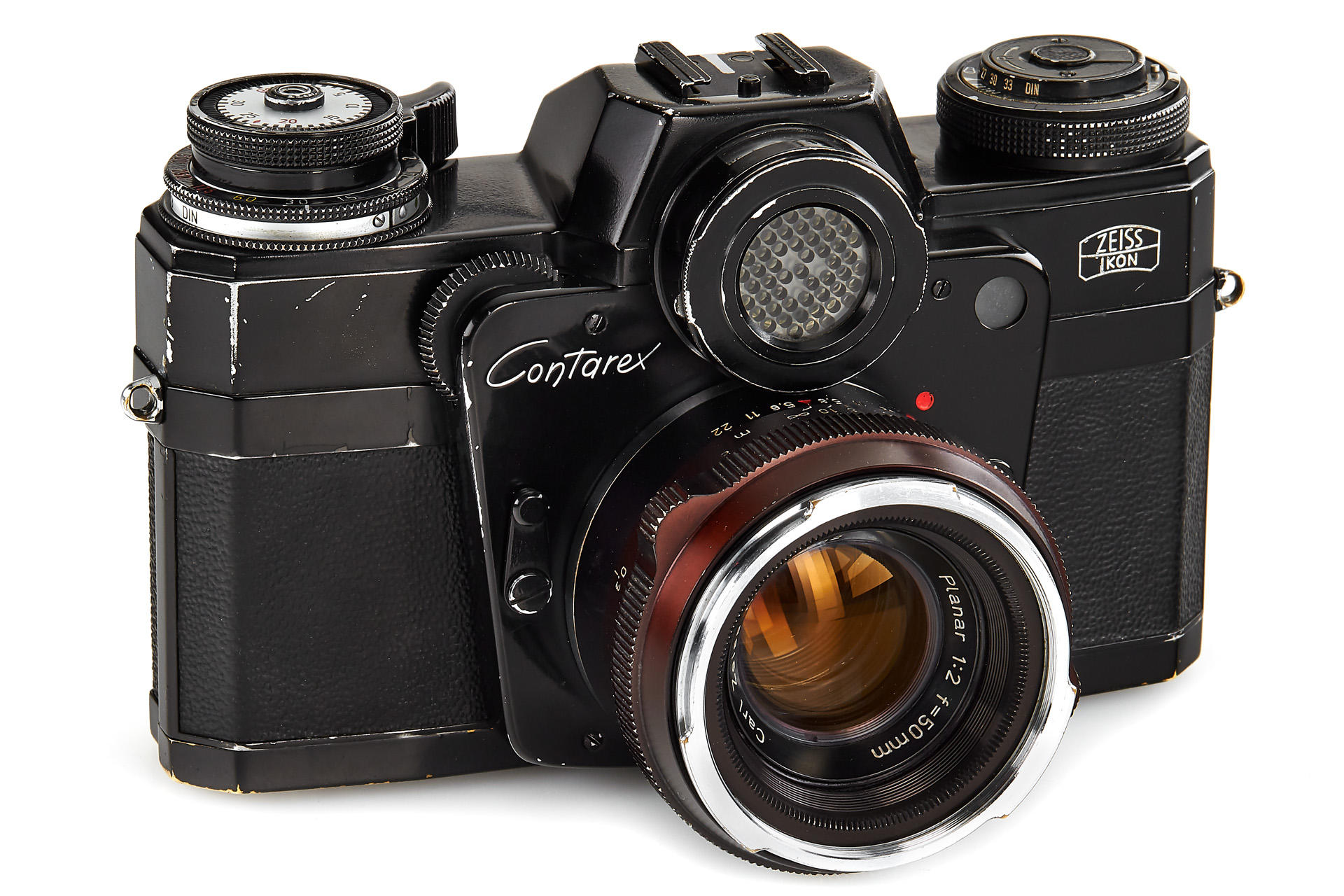 very rare black painted 1st model Contarex Bullseye, an early version without meter baffle release, with Planar 2/50mm no.3248962 in working order, light meter reacting - accuracy not tested, only very few examples had been produced in black finish