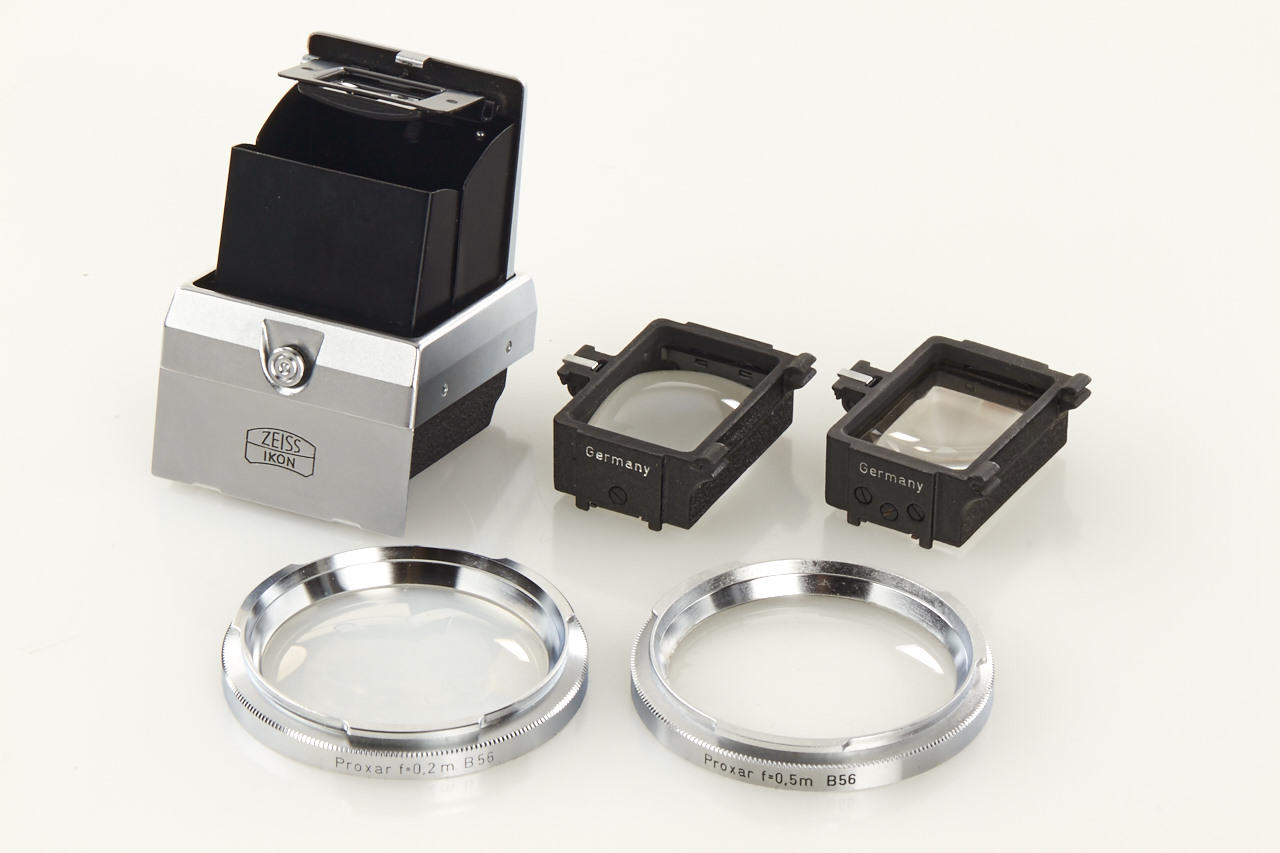 rare body in near mint condition and good working order with waist-level finder and prism finder (case), chrome Planar 2/50mm no.2368318 (cap), chrome Distagon 4/35mm no.2627171 (caps), two focussing screens, two Proxar close-up lenses in keeper, magazine back, film cassette, cable release - all in outfit case 23.0213