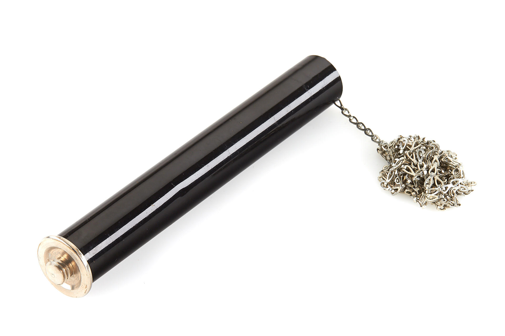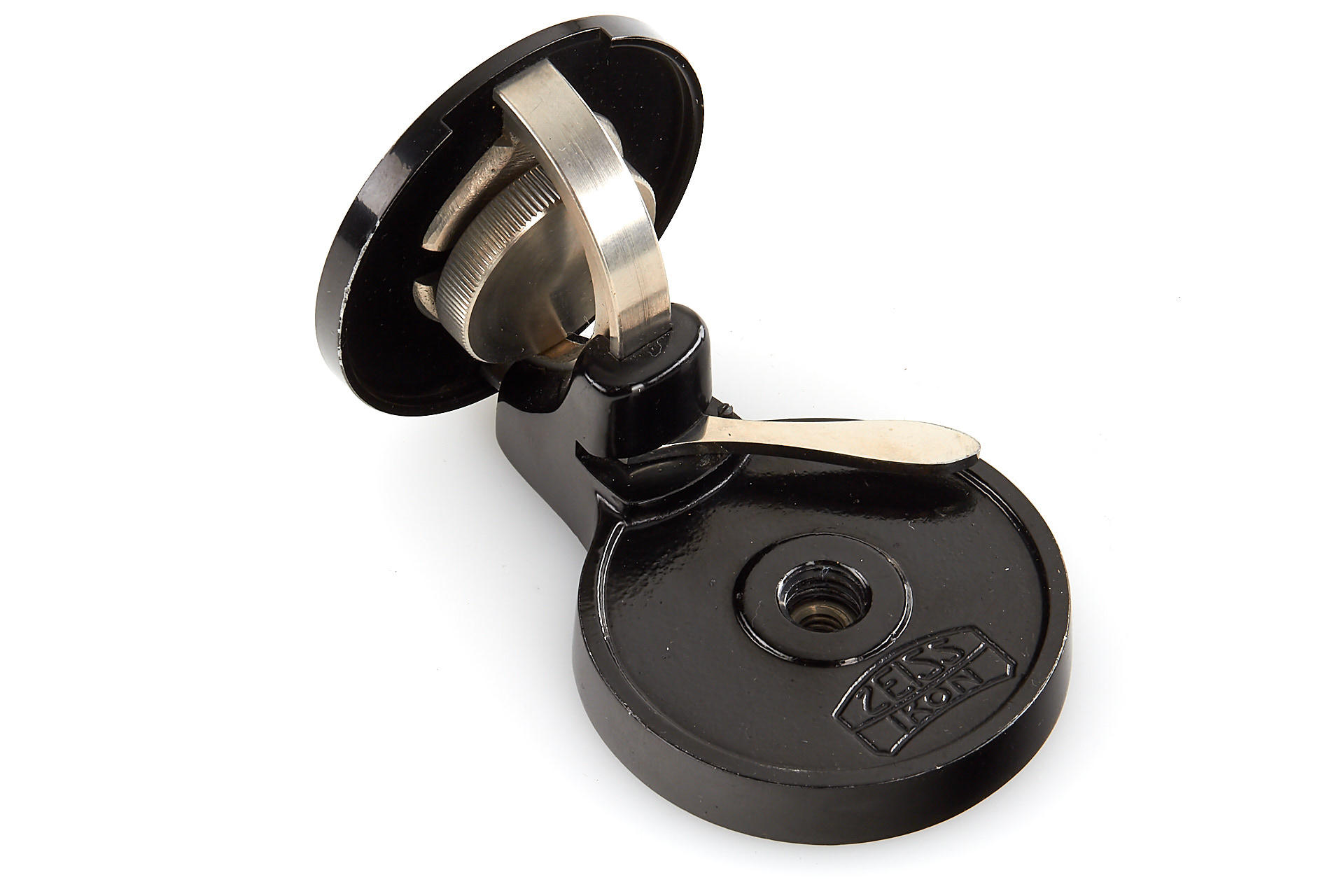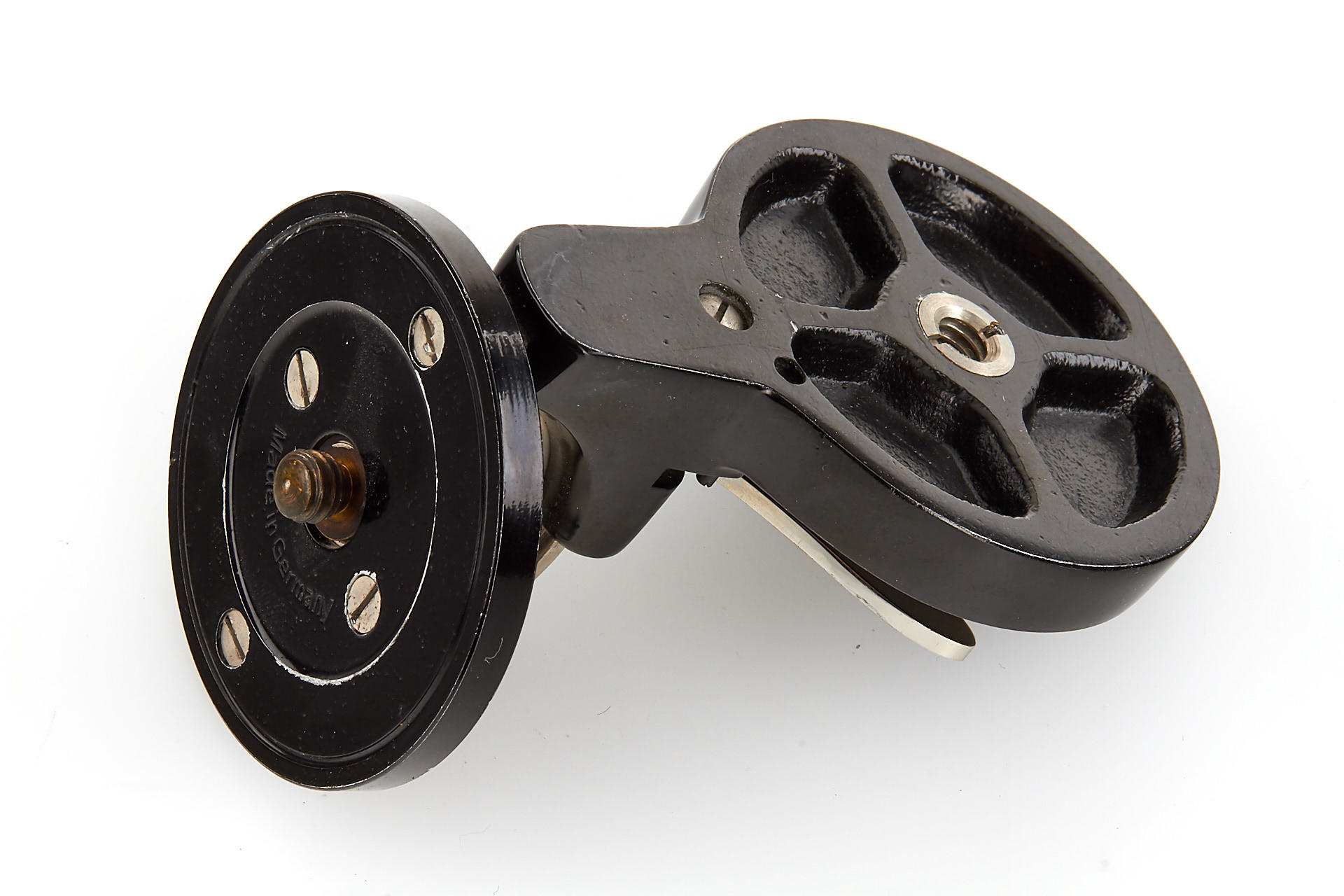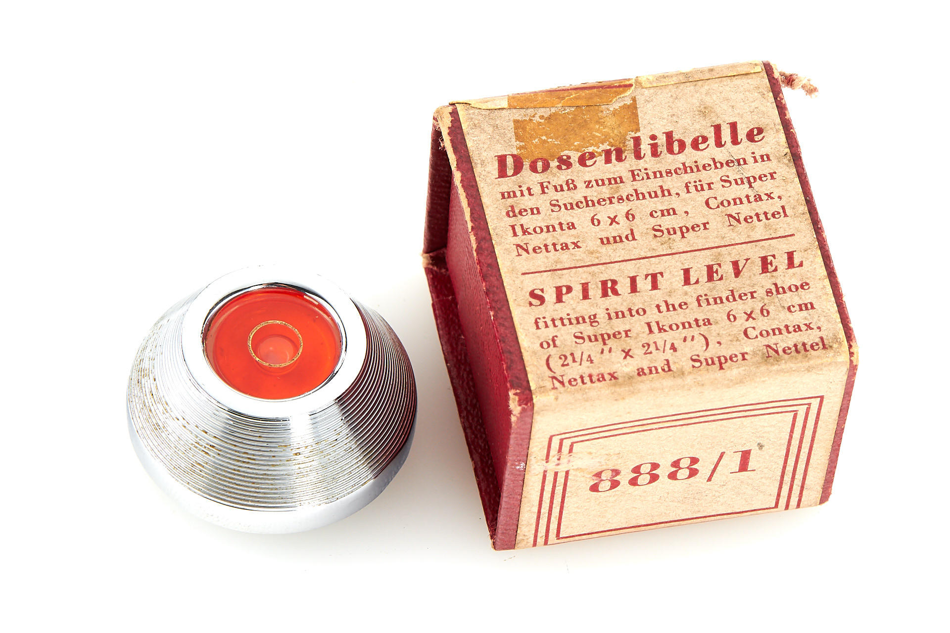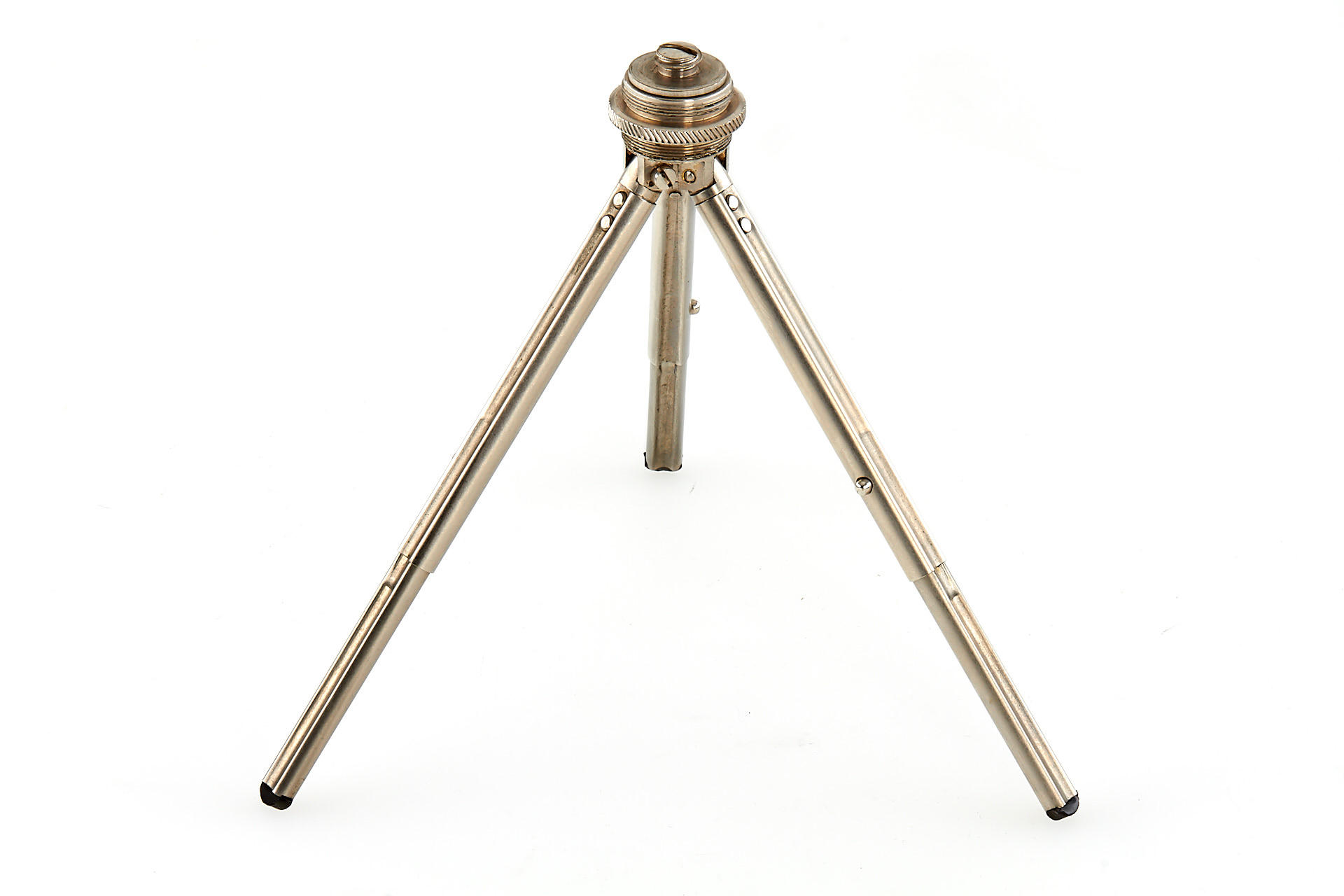 (1) rare black/nickel table tripod with chain in very fine original condition, (2) black/nickel tripod head with tilt, (3) rare chrome bubble level 888/1 in original maker's box