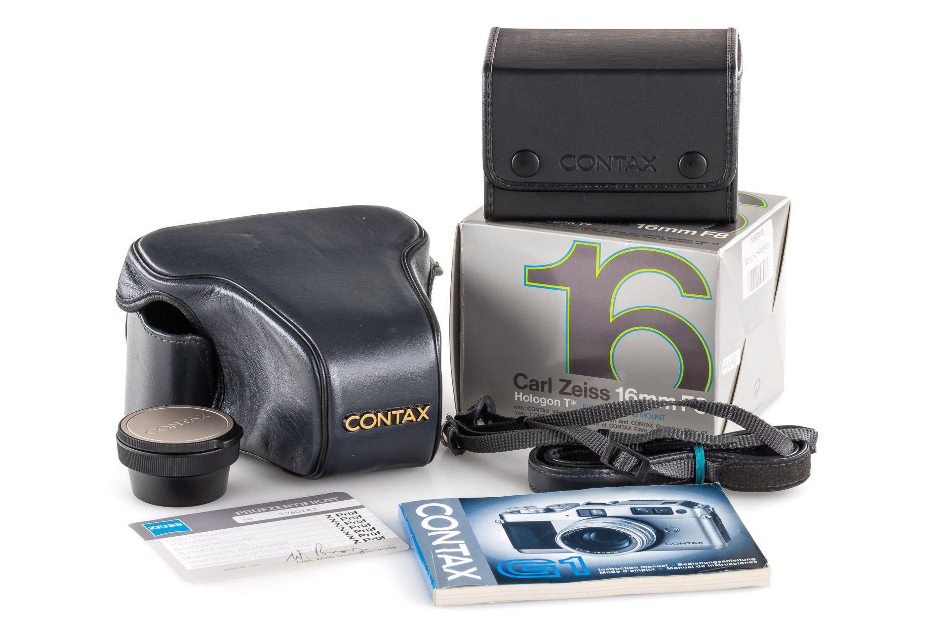 body in mint condition and working order (instructions, strap and ever-ready case) together with a very nice Zeiss Hologon T* 8/16mm no.7760183, complete with finder, special filter, both caps, case and maker's box