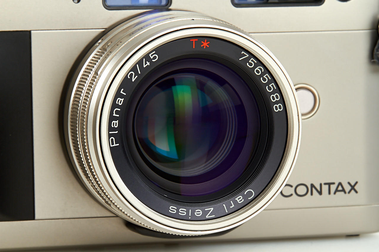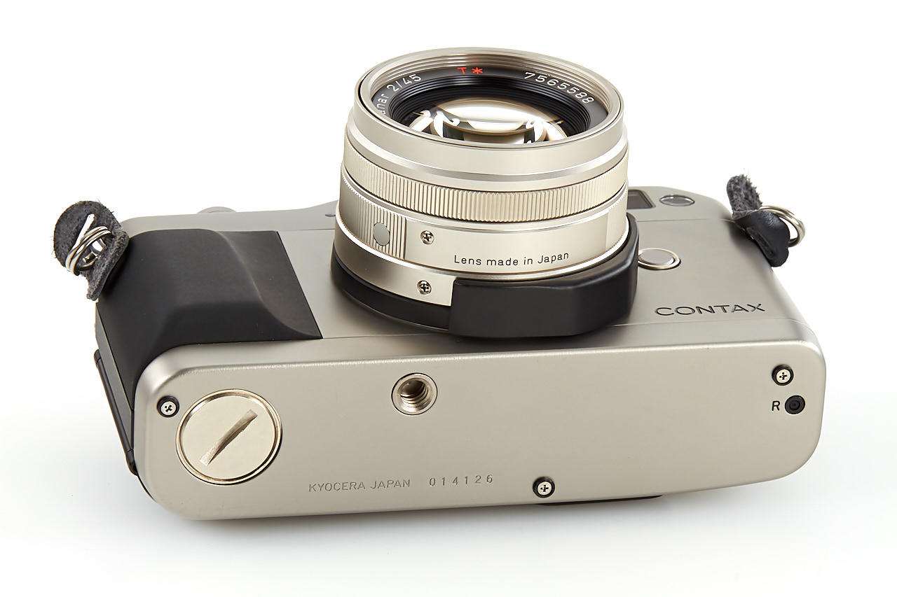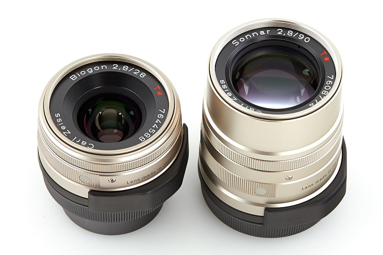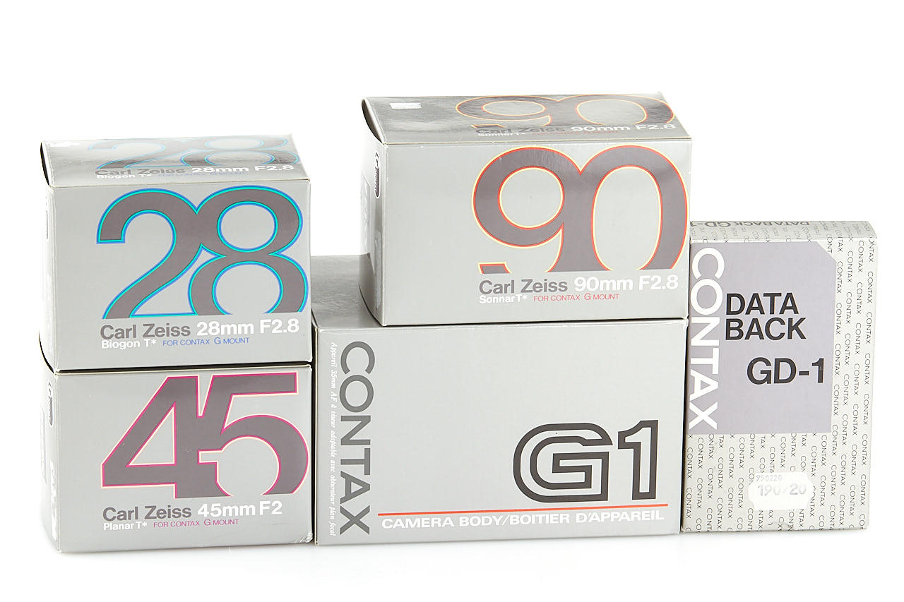 body in almost mint condition (only minimal marks on base plate), with cap, strap, papers, in maker's box, with three near mint and clean lenses: Biogon 2.8/28mm no.7644588, Planar 2/45mm no.7565588, Sonnar 2.8/90mm no.7608774, GD-1 data back, all in maker's boxes with caps and papers