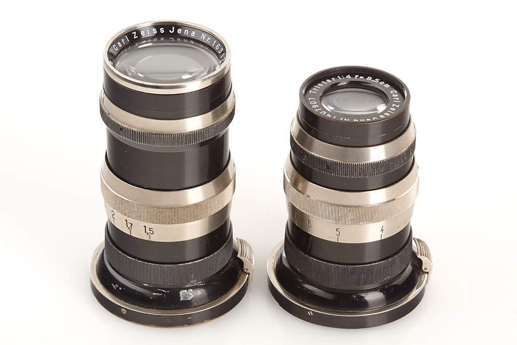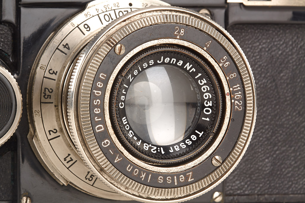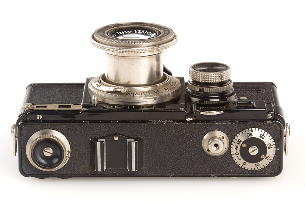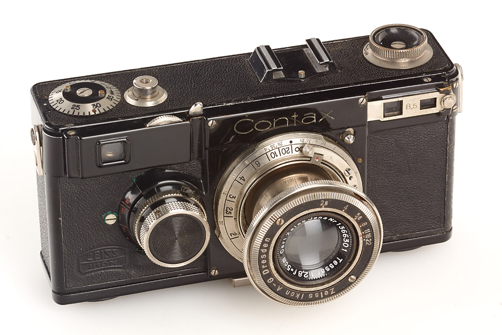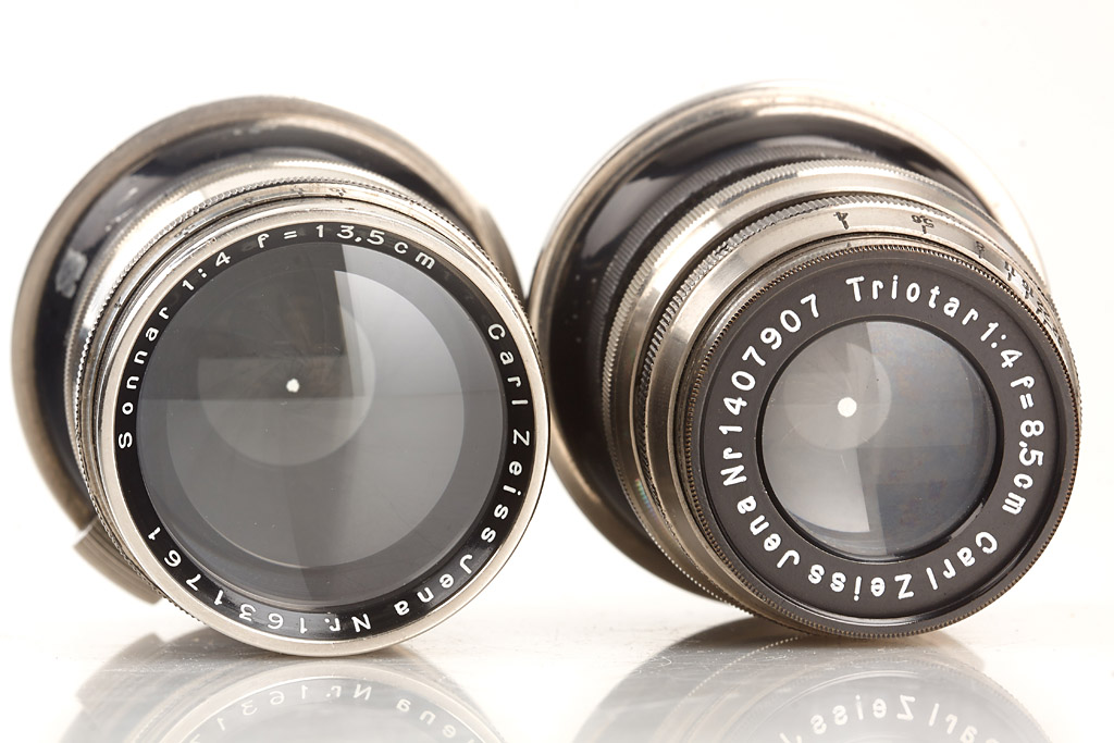 body in fine condition with coll. Tessar 2.8/5cm no.1366301 (cap), matching serial number in back door, black/nickel Triotar 4/8.5cm no.1407907, black/nickel Sonnar 4/13.5cm no.1631761, two spools, two film spools in bakelite keeper, 3 filters, 3 Contax brochures, all in fitted original Zeiss Ikon leather display case (34x25x9cm)