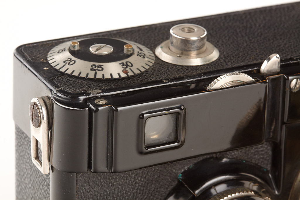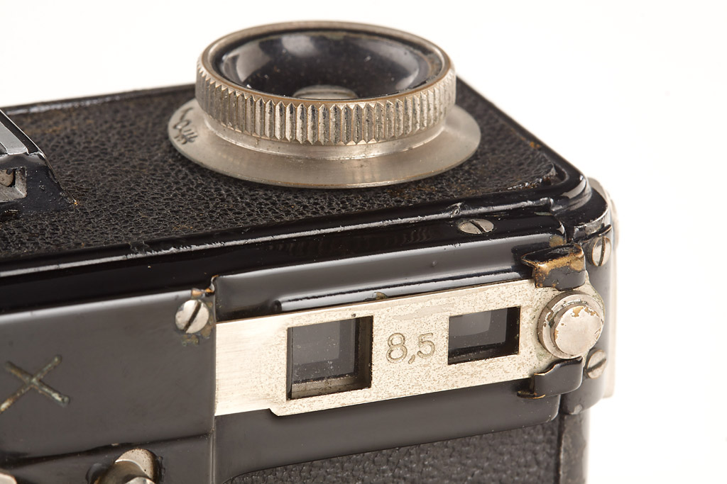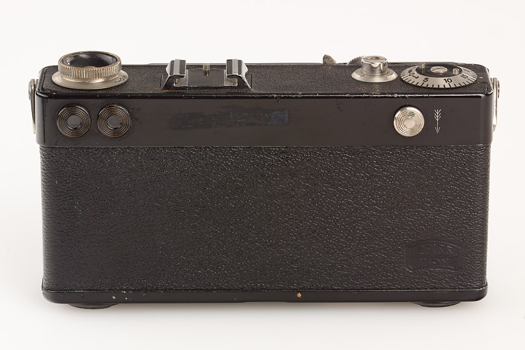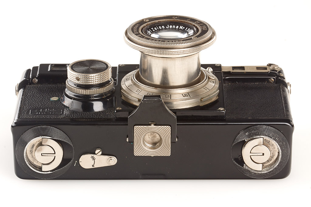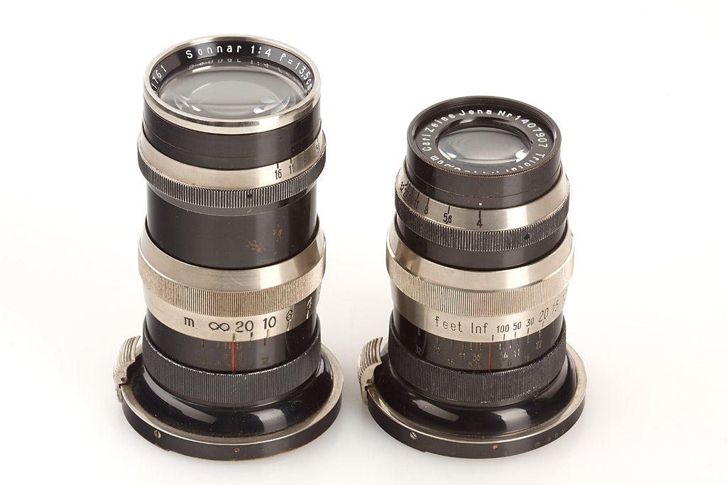 body in fine condition with coll. Tessar 2.8/5cm no.1366301 (cap), matching serial number in back door, black/nickel Triotar 4/8.5cm no.1407907, black/nickel Sonnar 4/13.5cm no.1631761, two spools, two film spools in bakelite keeper, 3 filters, 3 Contax brochures, all in fitted original Zeiss Ikon leather display case (34x25x9cm)