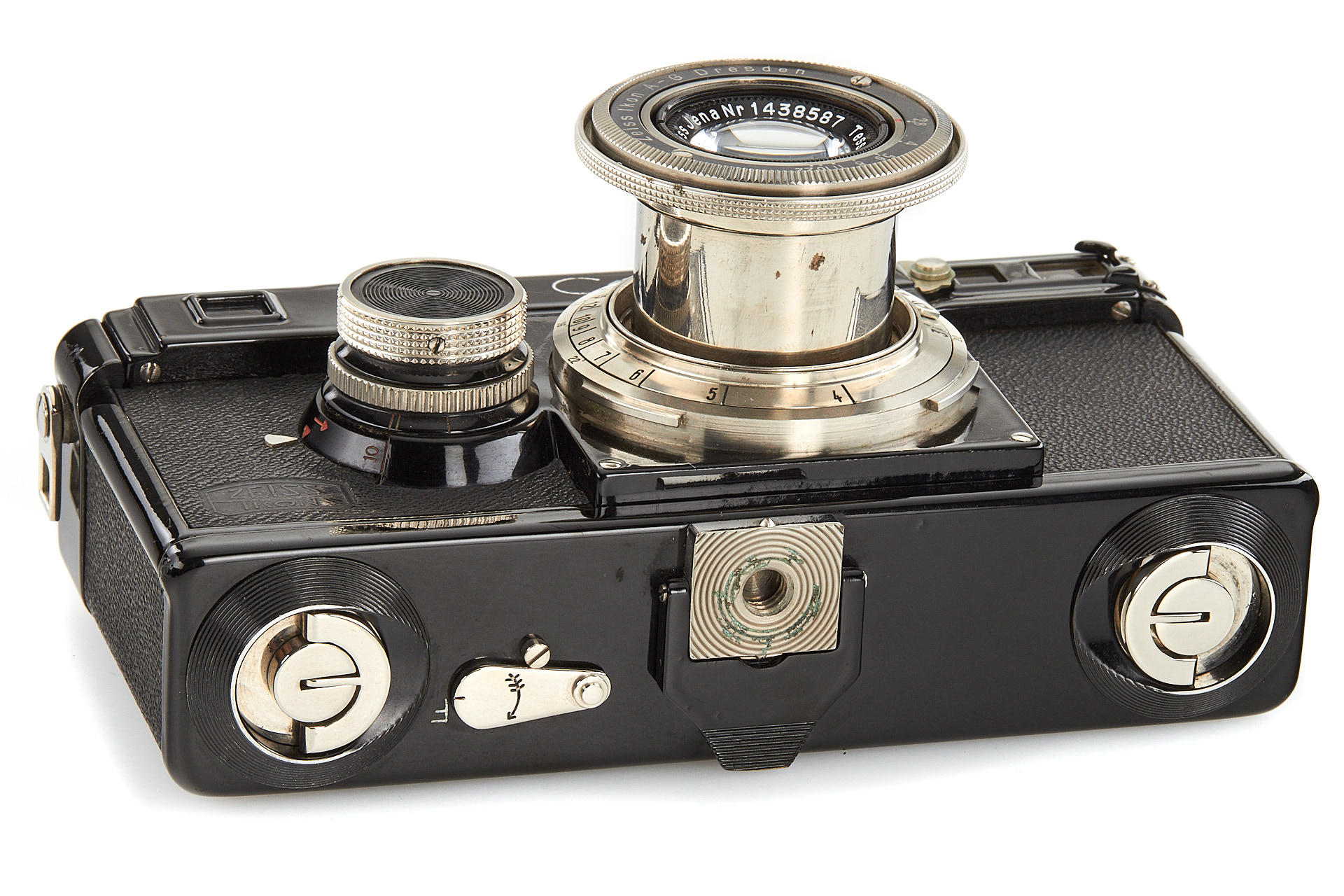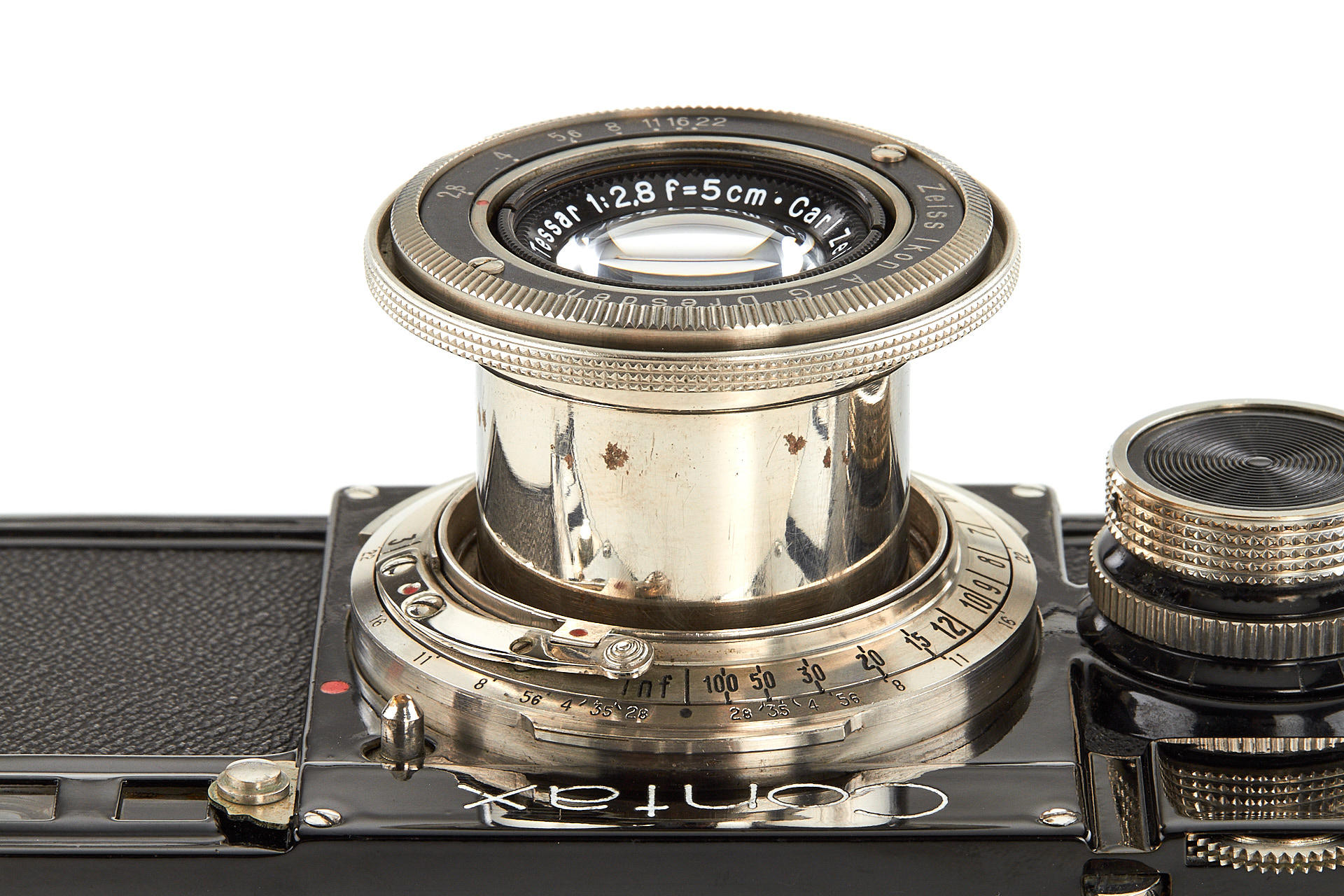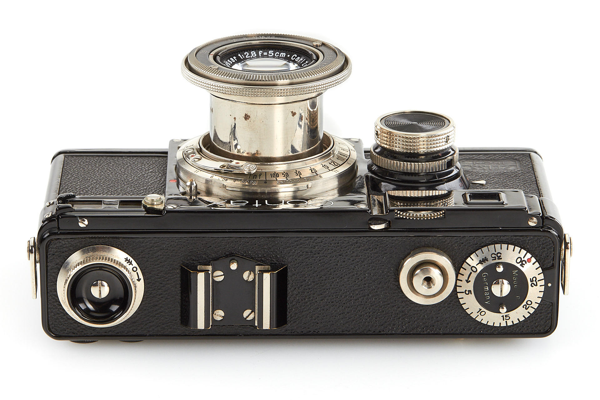 last version Contax I in beautiful condition, uncommon export camera, engraved with 'Made in Germany' on film counter and with focusing scale in feet, with collapsible Tessar 2.8/5cm no.1438587, lens cap