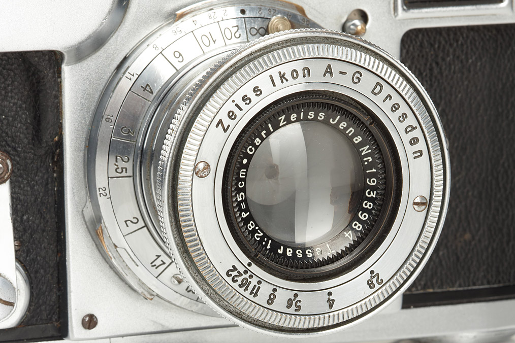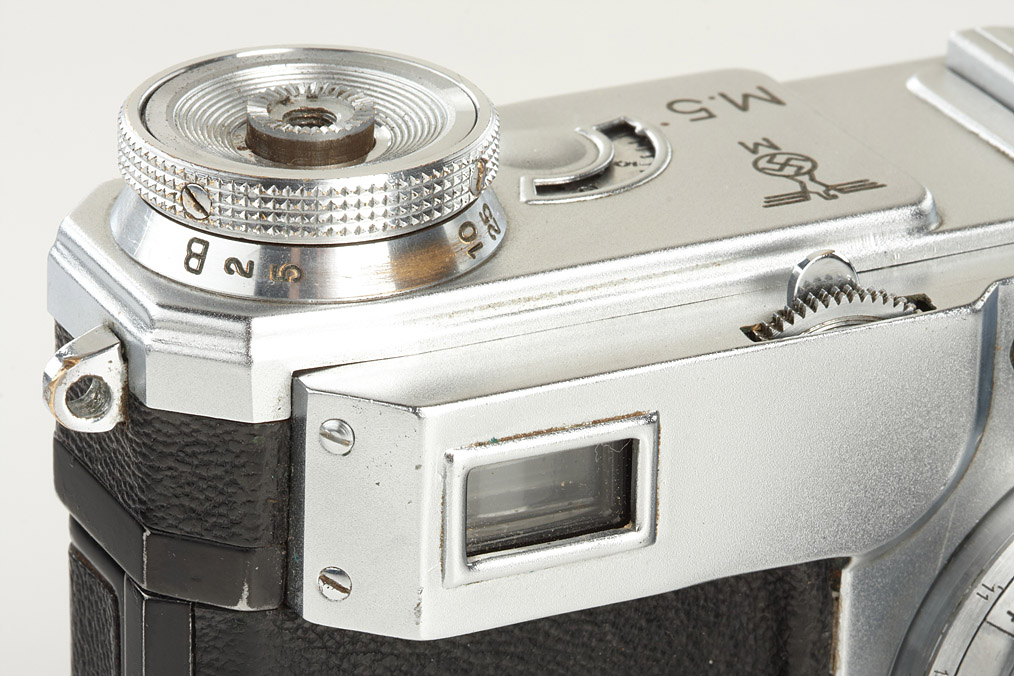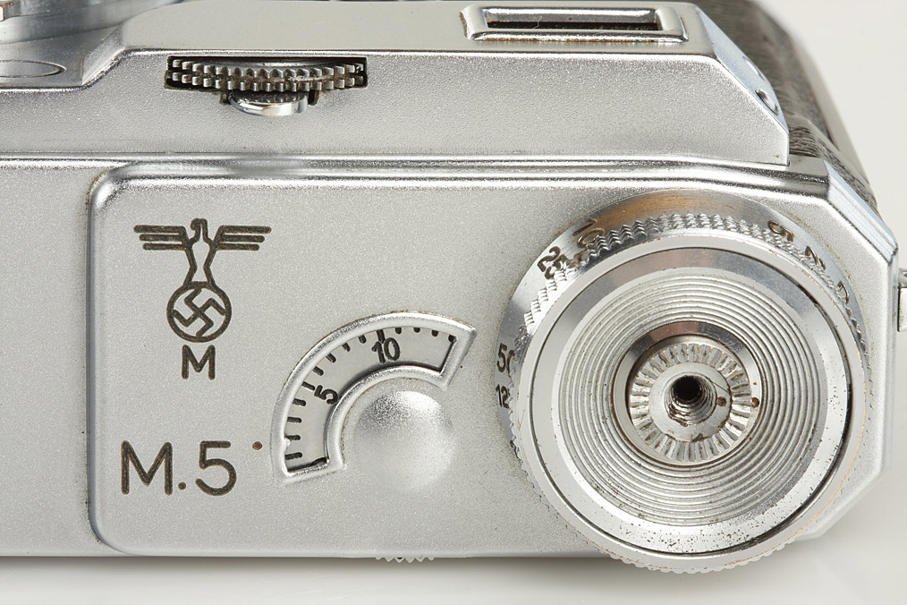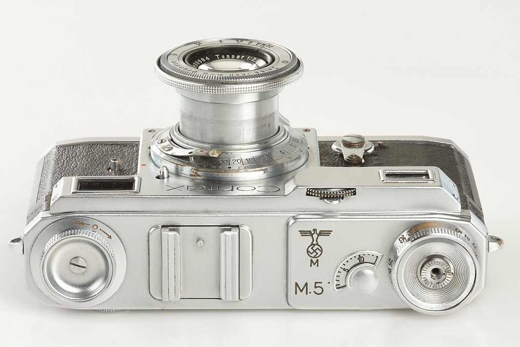 Very rare 'Kriegsmarine' Contax II used by German Navy in WW2 engraved with Reichsadler and M5 on top plate. According to a letter of Jim Lager that to his best knowledge, the markings on the camera are authentic and of the time period of the camera. Serial number only engraved inside the camera and on the back door. With Tessar 2.8/5cm no.1938984. Camera (synchronised) and lens in good condition, everready case