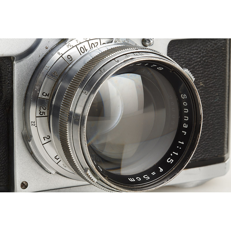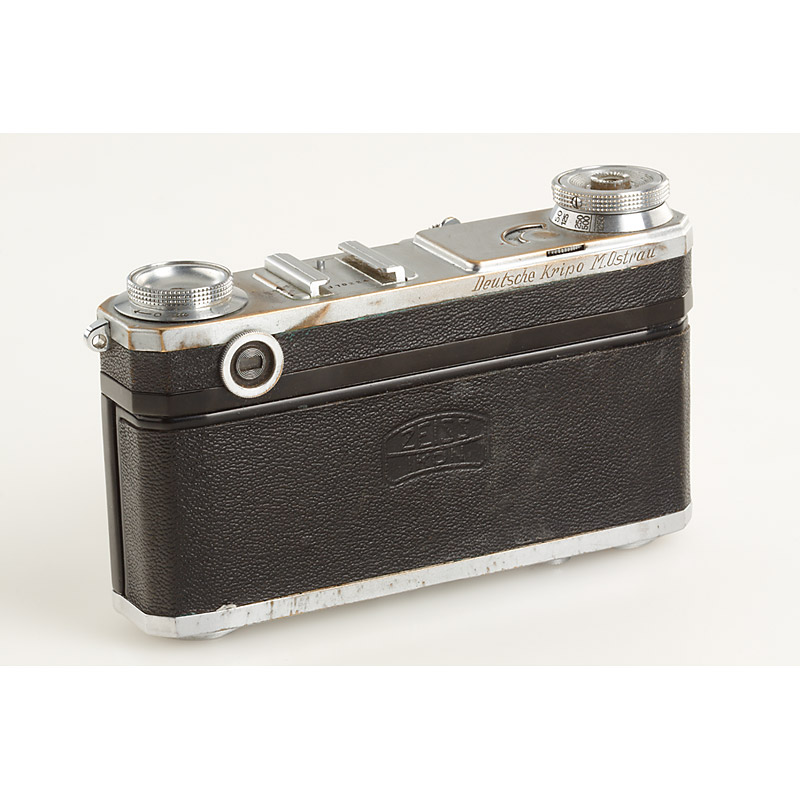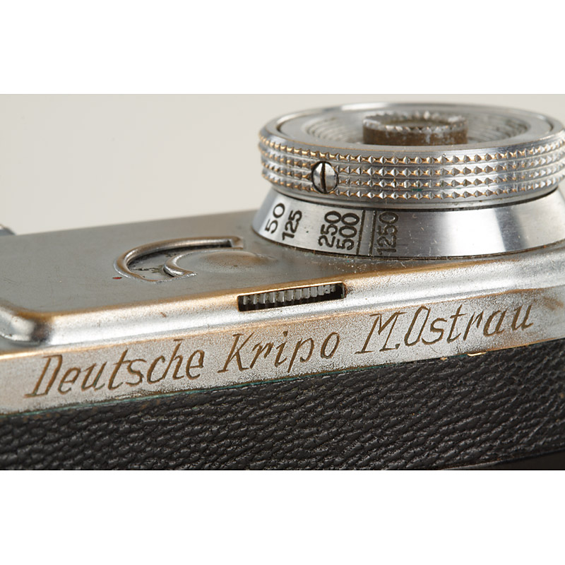 camera in used condition with originally engraved 'Kripo M.Ostrau' (Police in Mährisch Ostrau), matching Sonnar 1.5/5cm no.1754178, everready case