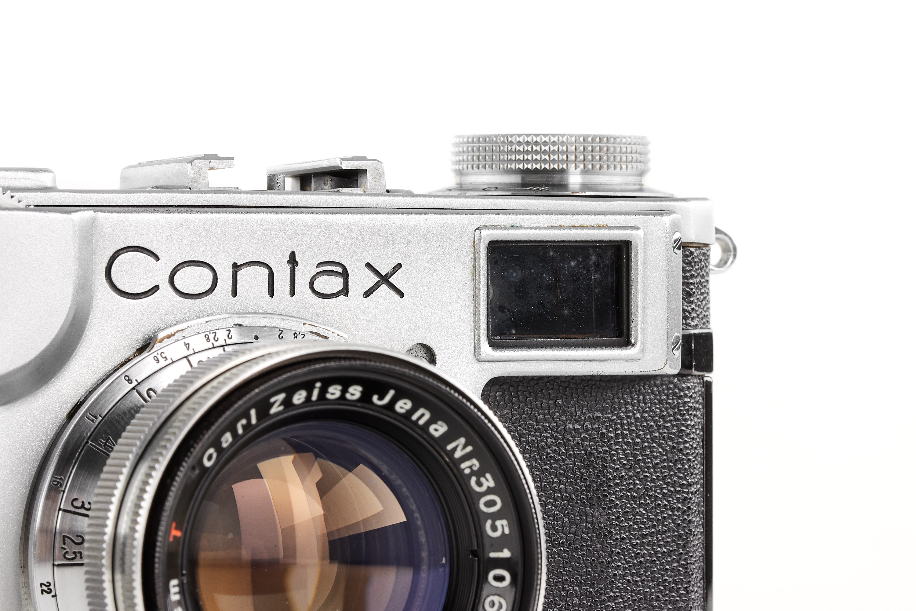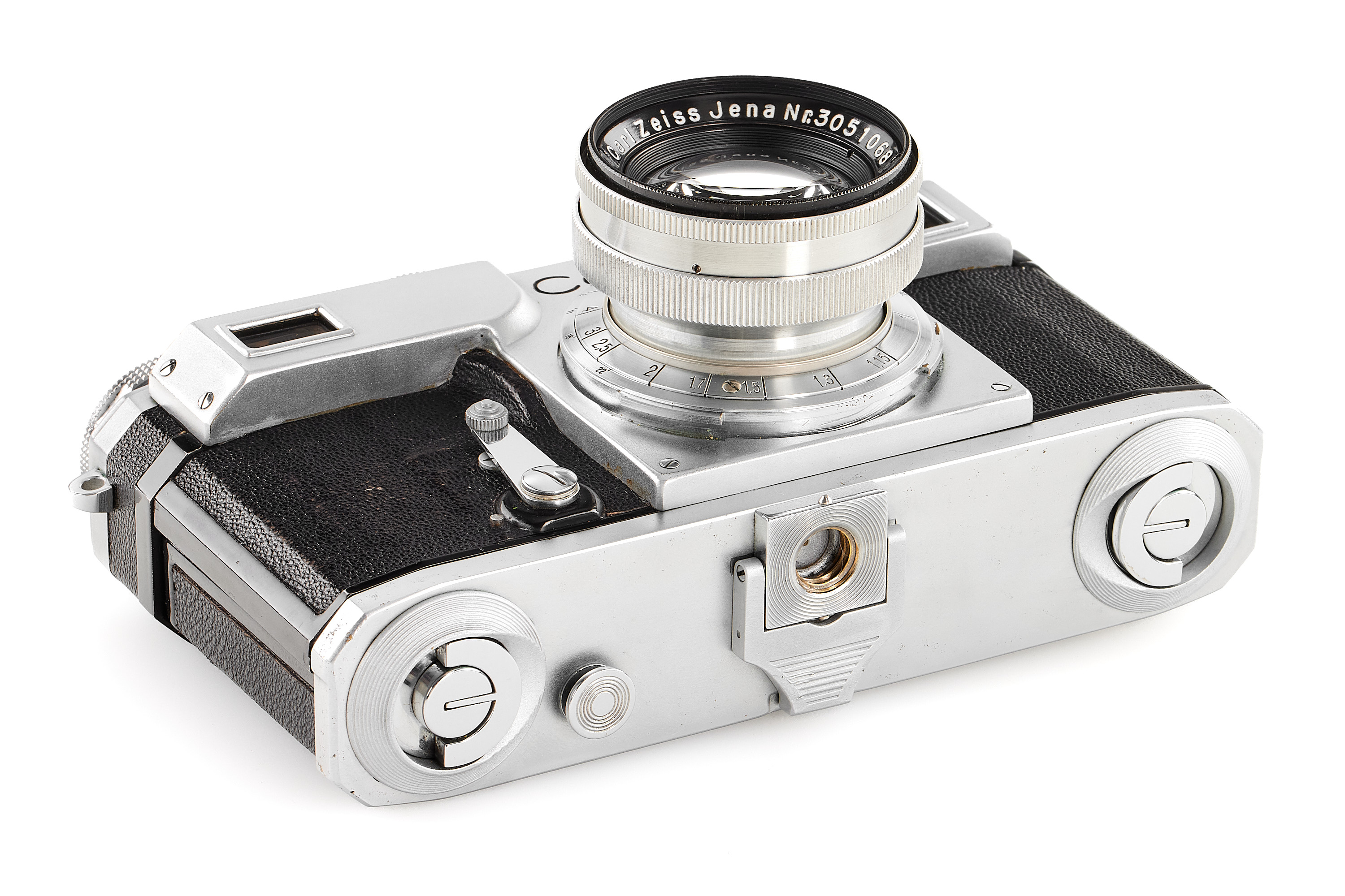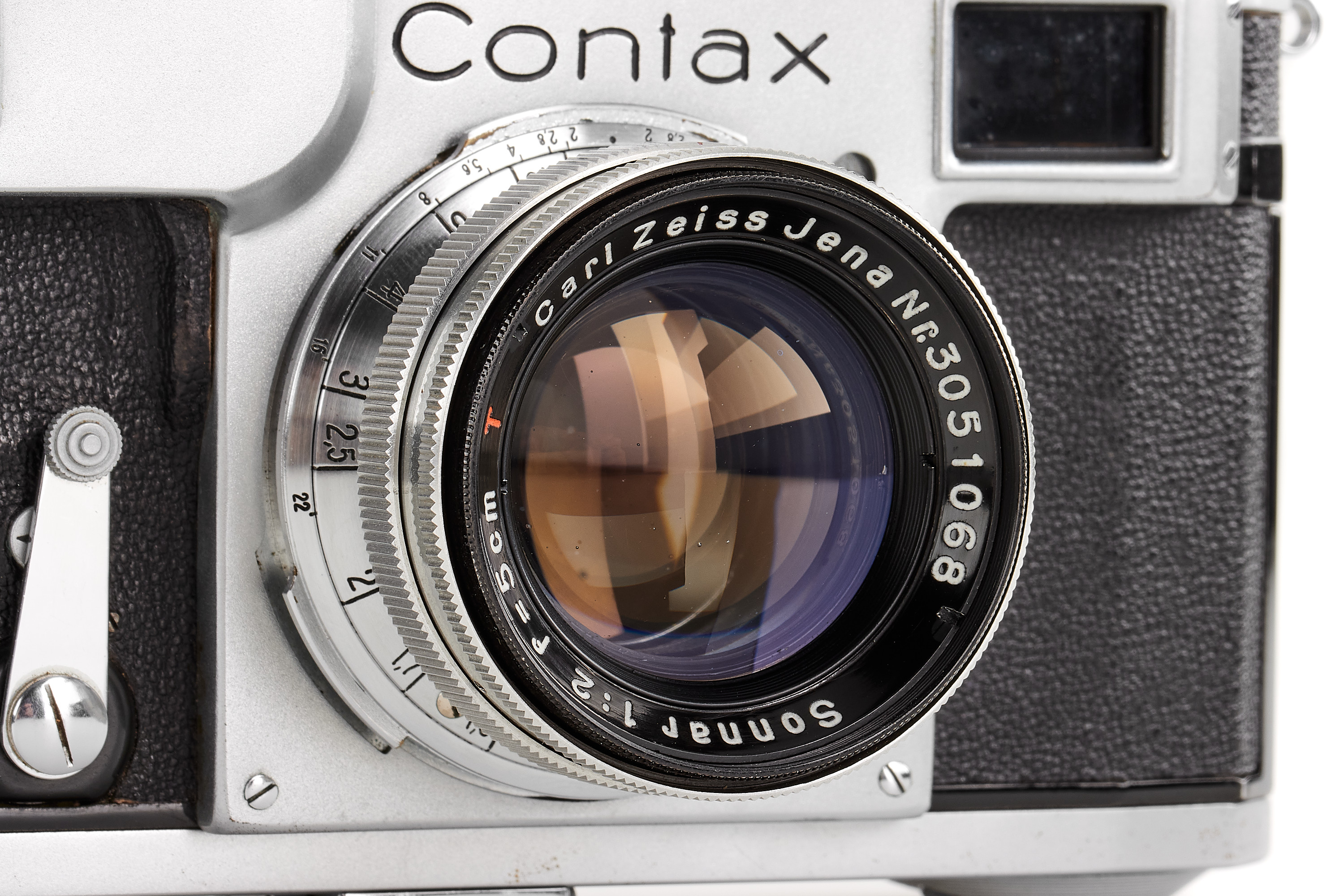 Uncommon Jena Contax II, in almost mint condition and working order, matching back, together with Sonnar 2/5cm no.3051068, coated optics showing some haze (front lens cap), produced the same year, 1947, with leather case (cond. B-) and maker's box.