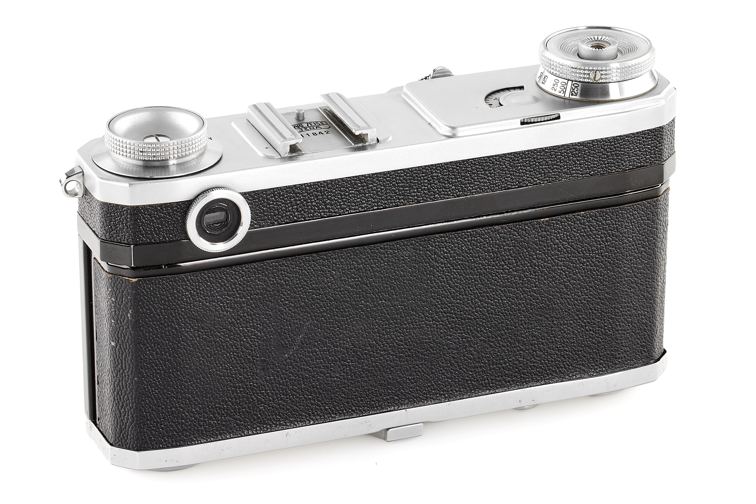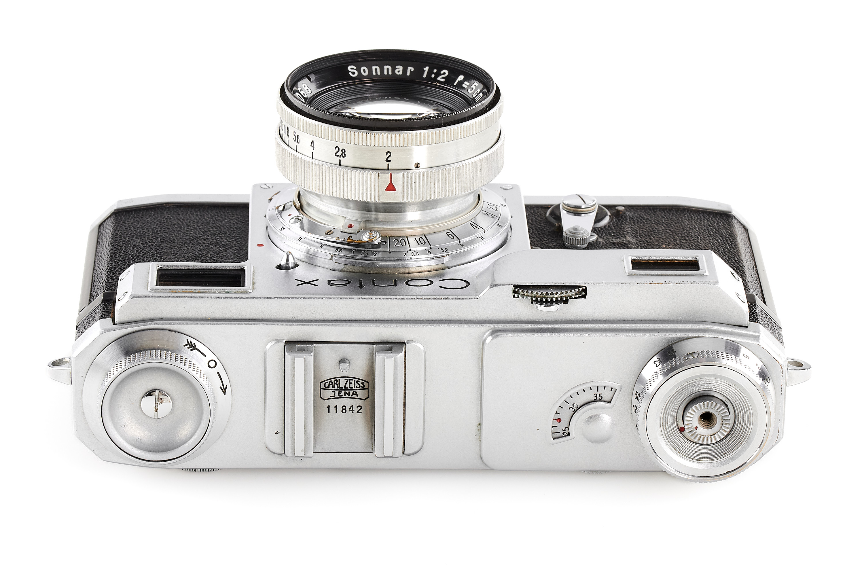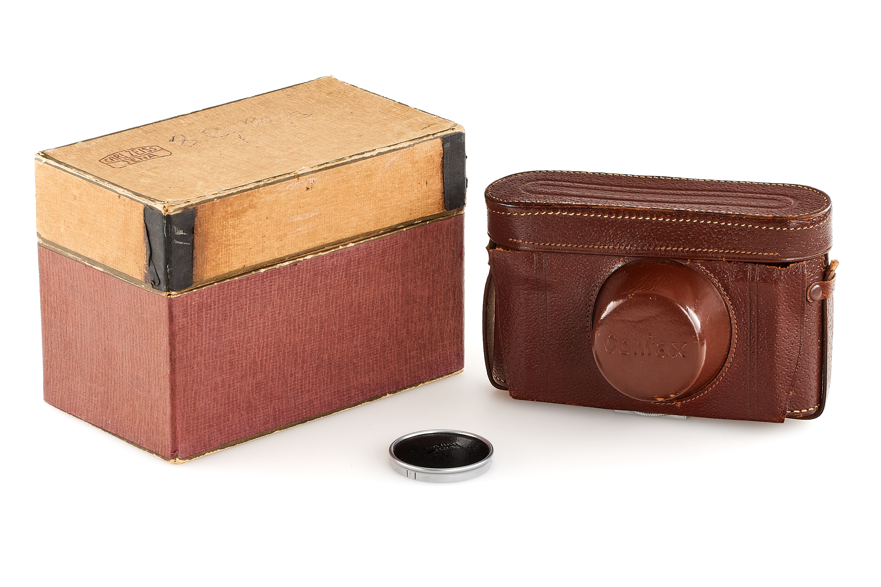 Uncommon Jena Contax II, in almost mint condition and working order, matching back, together with Sonnar 2/5cm no.3051068, coated optics showing some haze (front lens cap), produced the same year, 1947, with leather case (cond. B-) and maker's box.