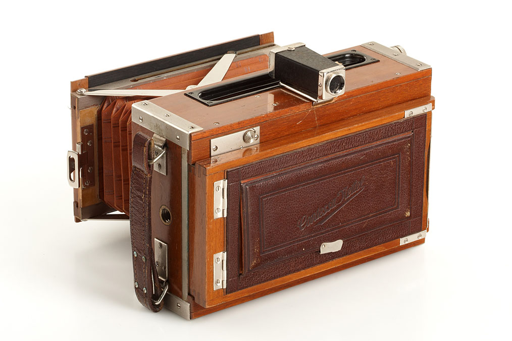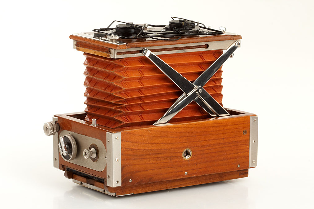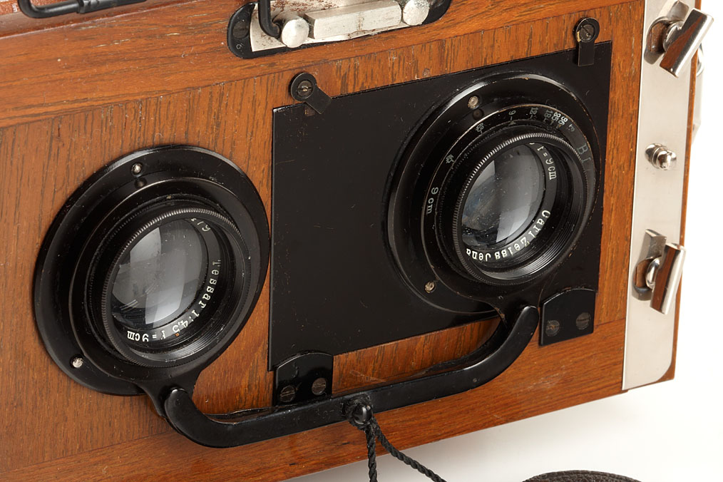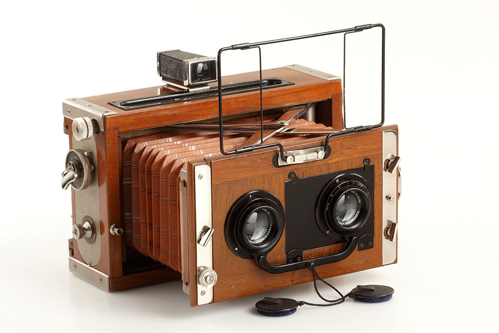 6x13cm, rare tropical stereo camera with focal-plane shutter to 1/1200 (needs attention), Tessar 4.5/9cm lenses nos.530466/479 with both caps, a pair of Schneider Xenar 5.5/7.5cm lenses nos.174364/5 with on lens board with both caps, brown bellows, frame finder for stereo and panoramic exposures, attached Rhaco viewfinder (original missing) in excellent condition with cut film holder