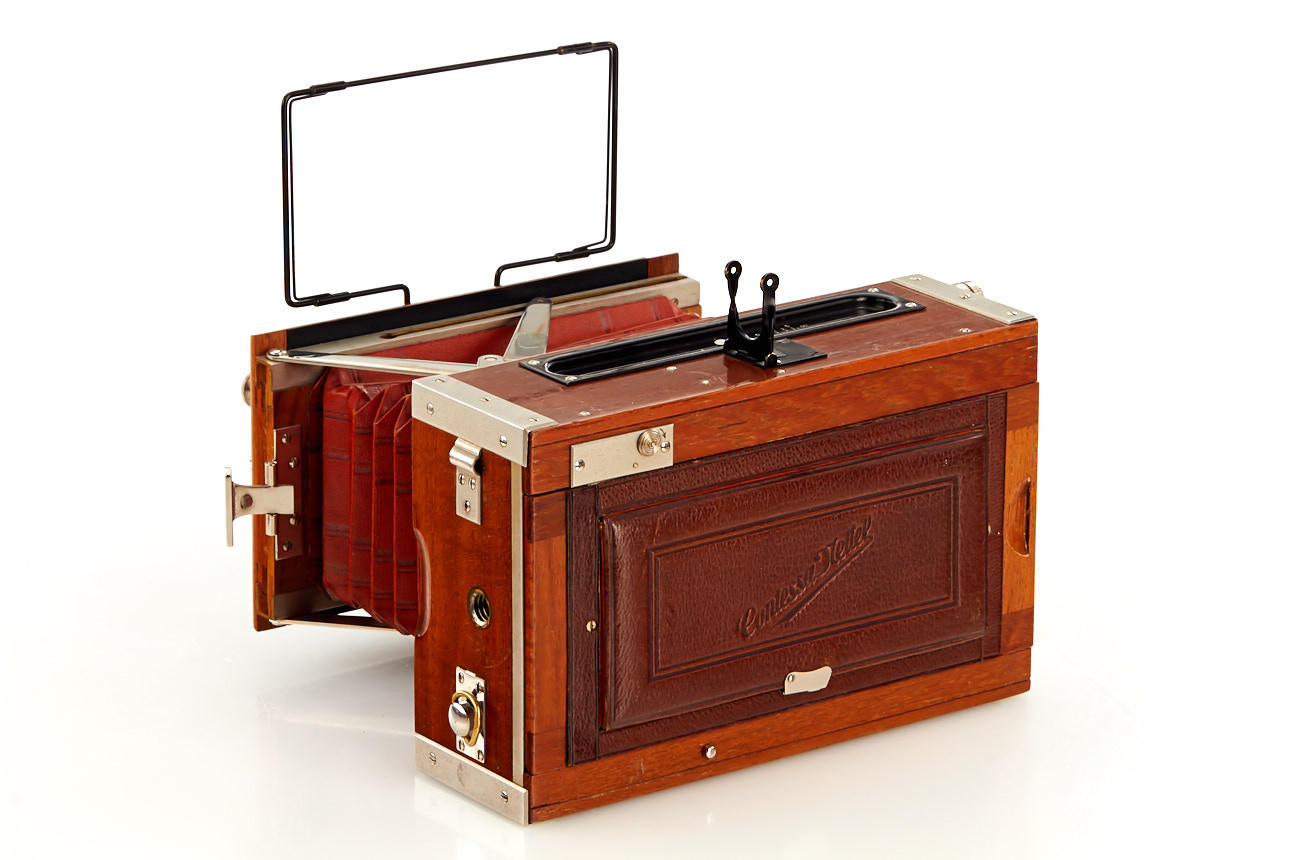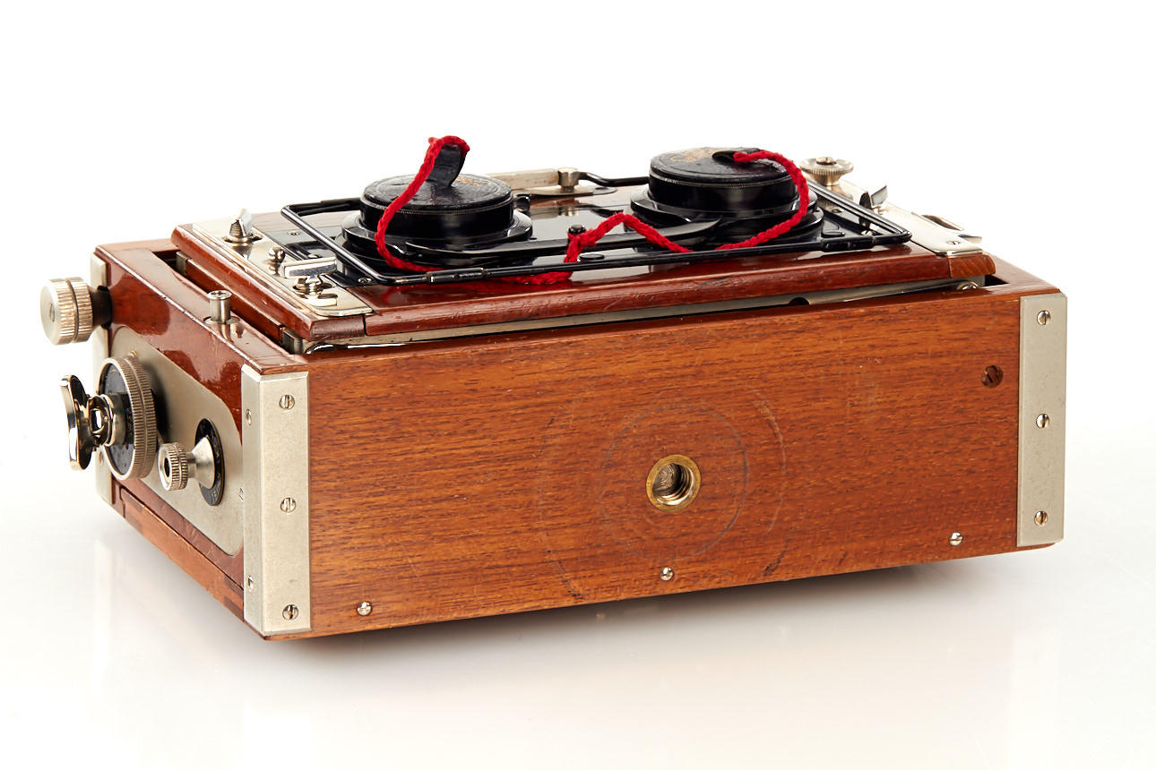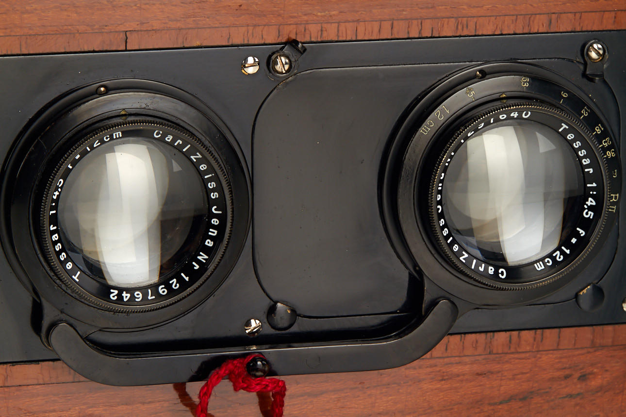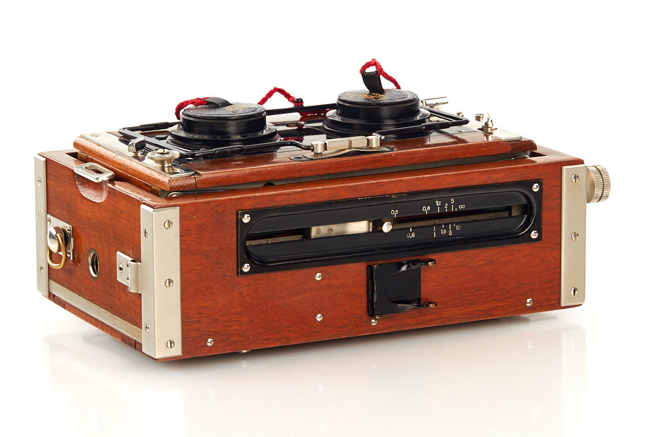 6x13cm, rare tropical stereo camera with focal-plane shutter to 1/1200 (not accurate), Tessar 4.5/12cm lenses nos.1297640 + 1297642 with both caps, brown bellows, frame finder for stereo and panoramic exposures, in beautiful original condition