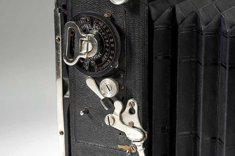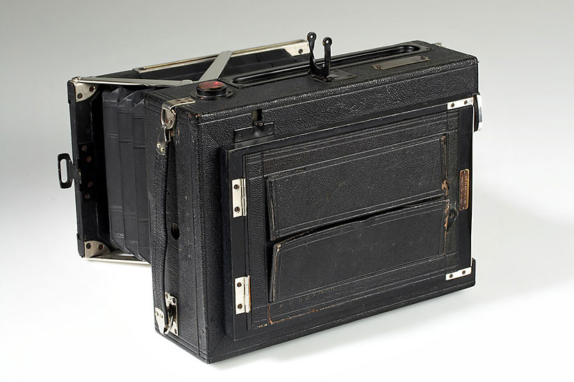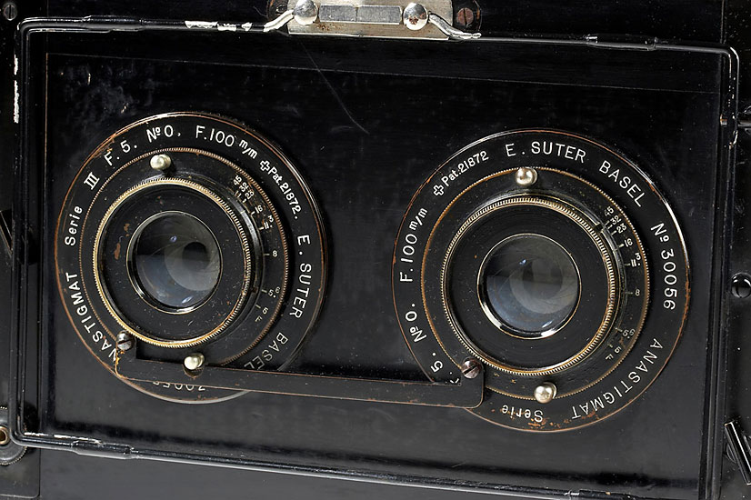 6x13cm, leather covered wooden body, leather bellows with a pair of Sutter Anastigmat Serie III 5/100mm lenses nos.30055/56, focal plane shutter (inoperable), dealers plaque: E.Sutter, Bale, focusing screen adapter, 11 film holders, original leather case