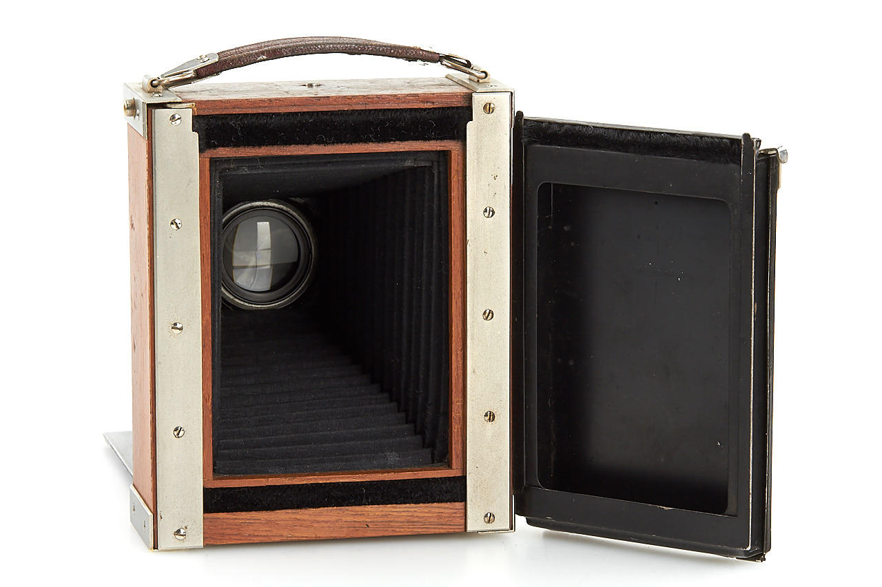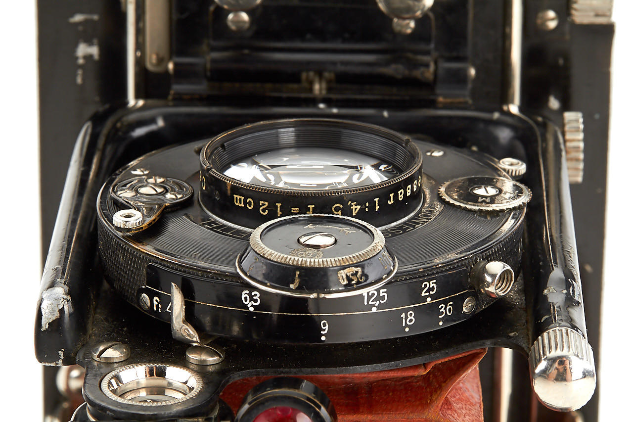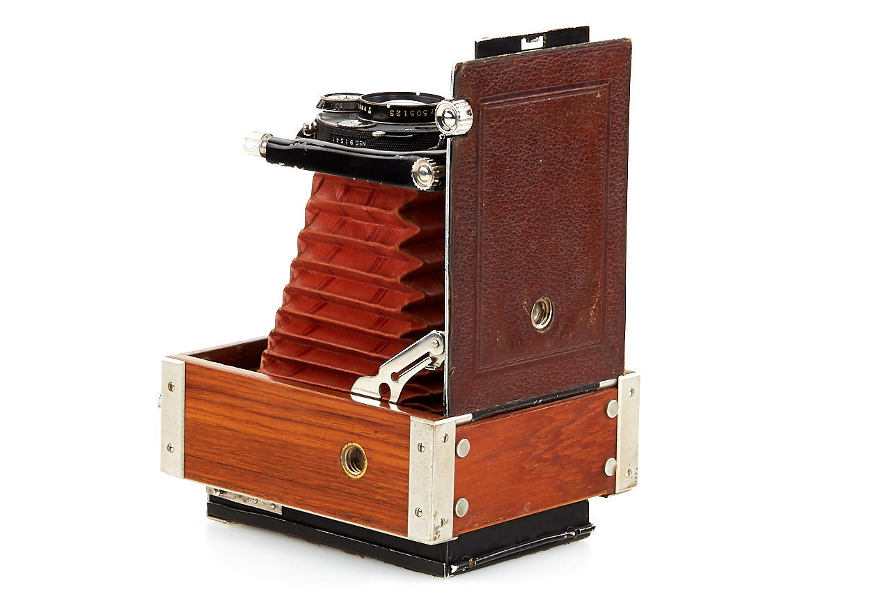 6.5x9cm version in good condition, original brown bellows, with Tessar 4.5/12cm no.505123, carrying case and a wooden tripod