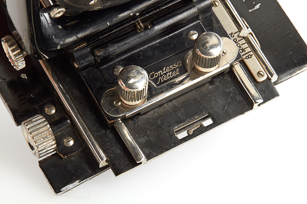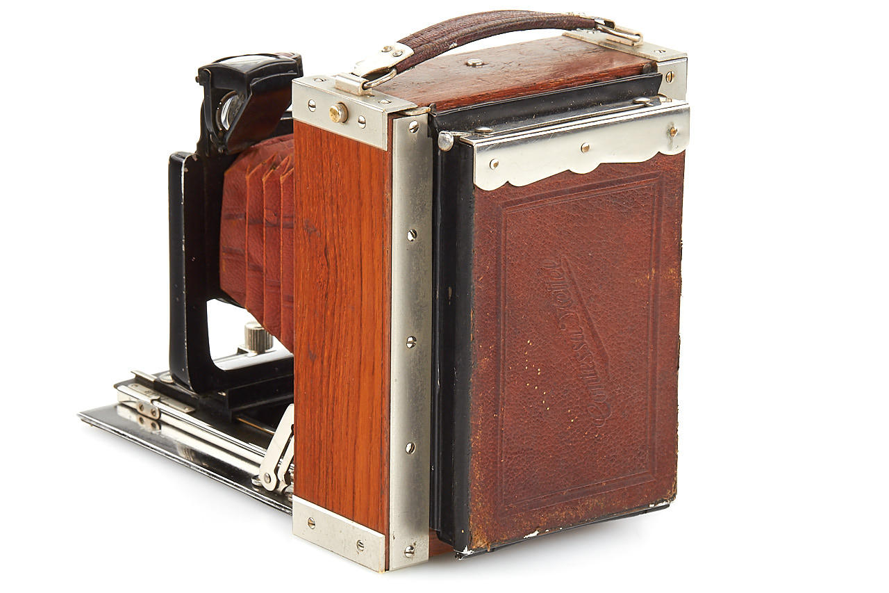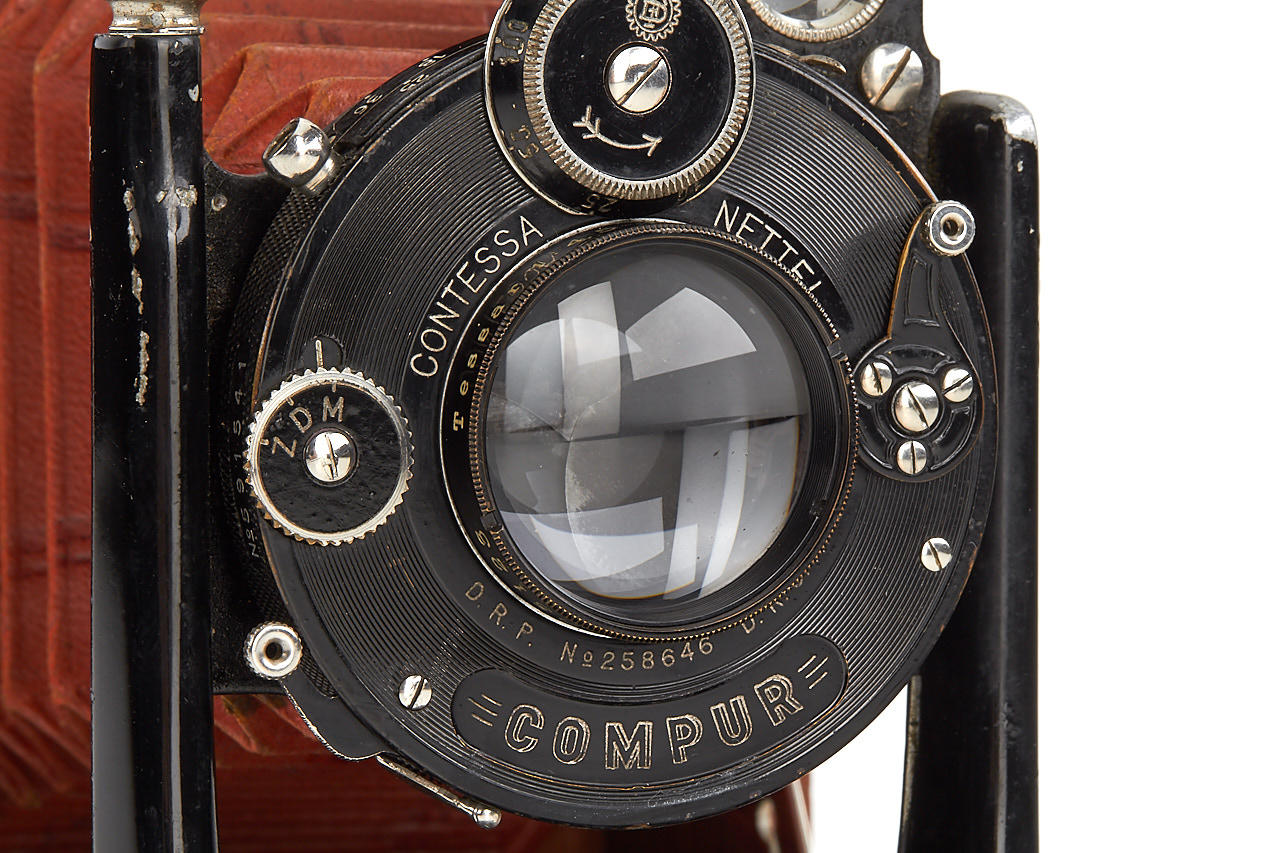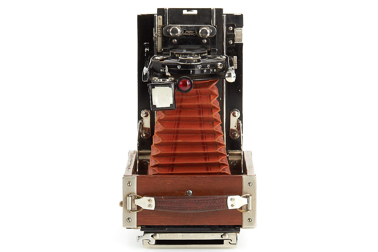 6.5x9cm version in good condition, original brown bellows, with Tessar 4.5/12cm no.505123, carrying case and a wooden tripod