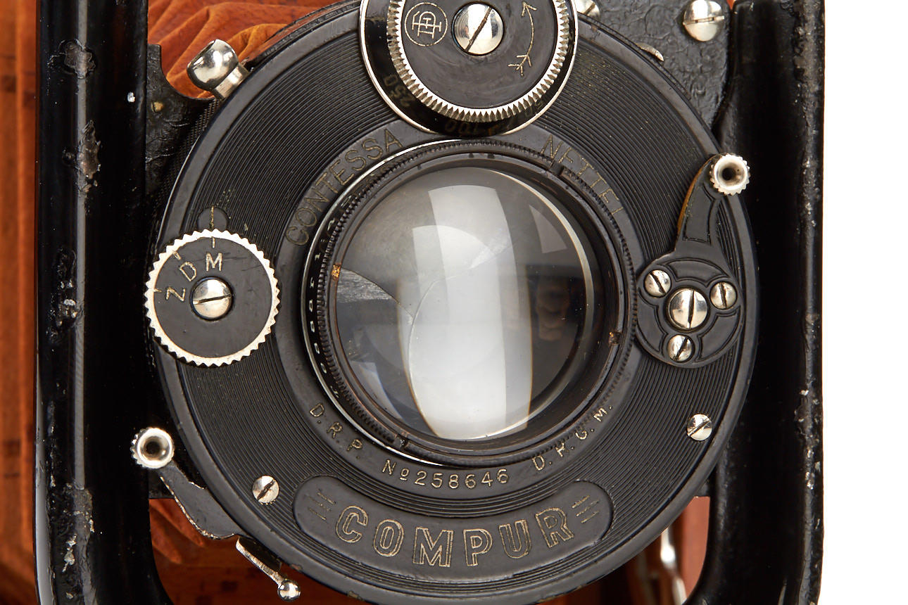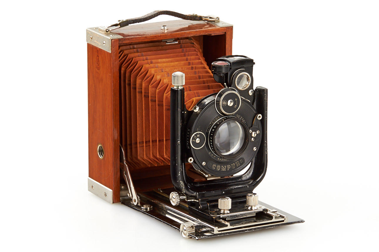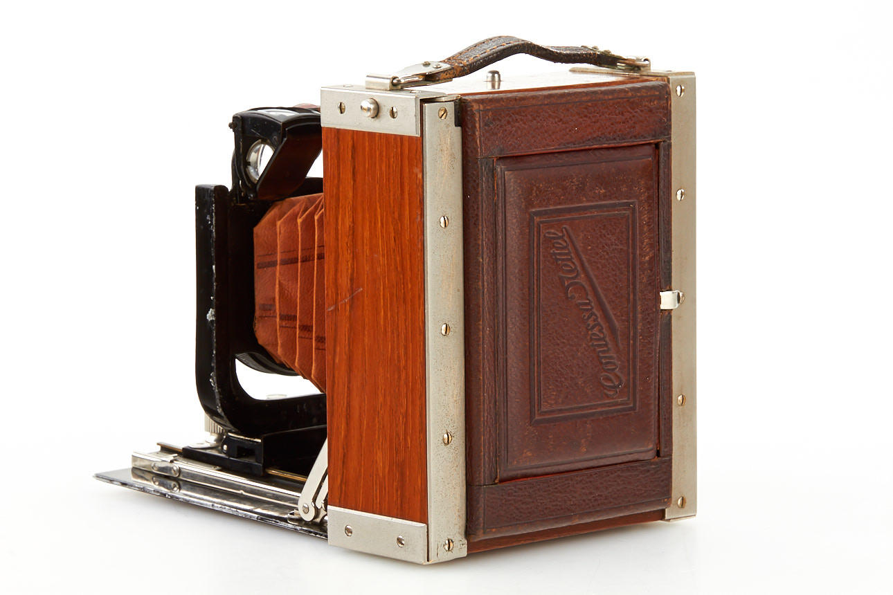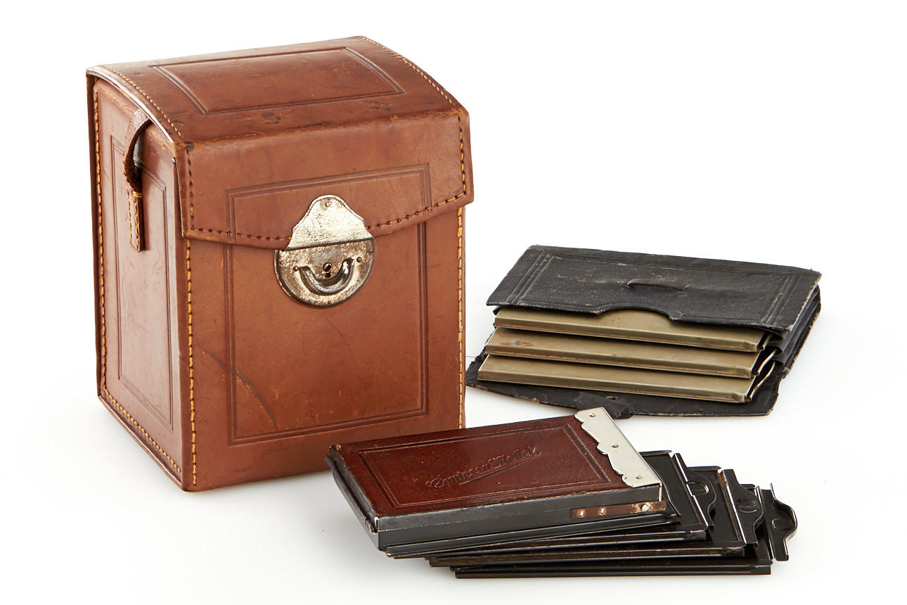 tropical camera for 6.5x9cm exposures, in very good condition, with Tessar 4.5/12cm no.555911 in Compur shutter, matching filmpack holder, 6 single plate holders, original case
