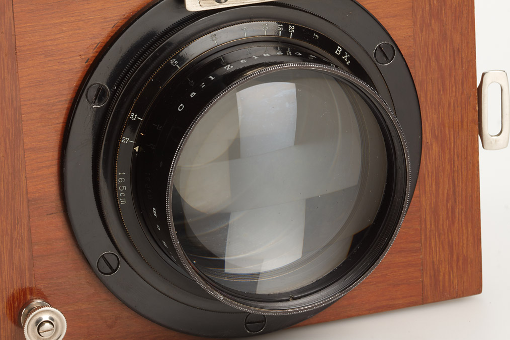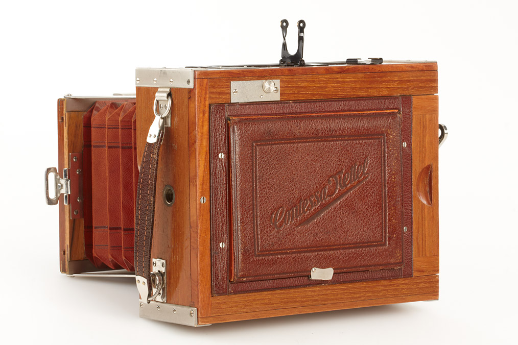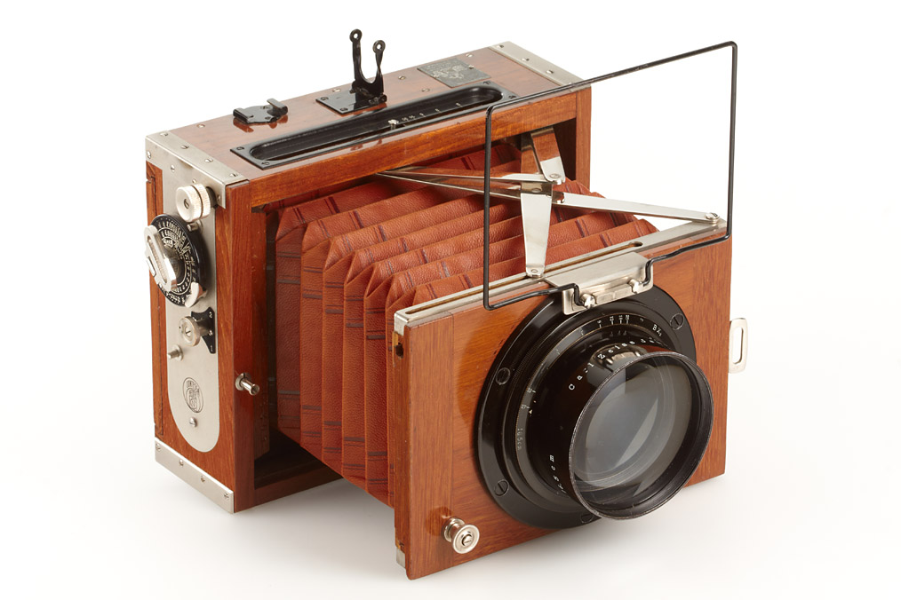 9x12cm, in near mint original condition, brown bellows, rare with fast Tessar 2.7/16.5cm no.641986 (clean lenses, cap), focal plane shutter (not working accurate), frame finder, focusing screen adapter, film pack holder, two original film holders, compendium, case