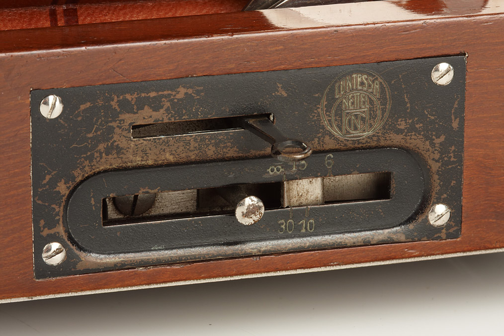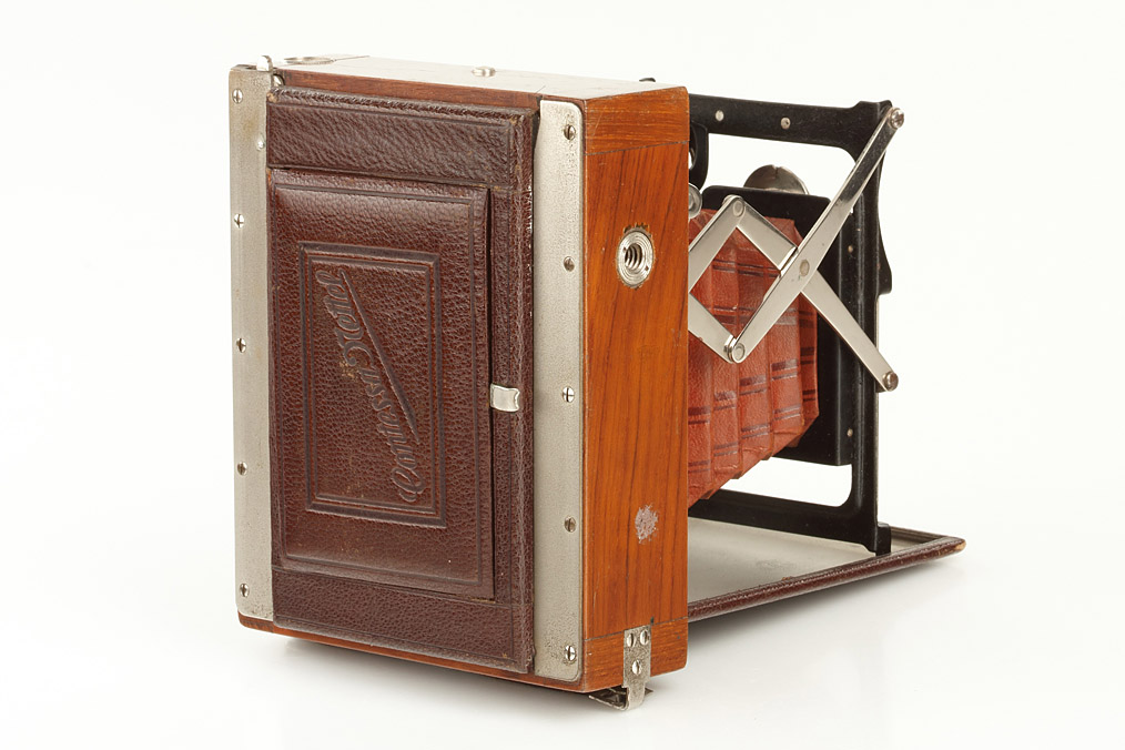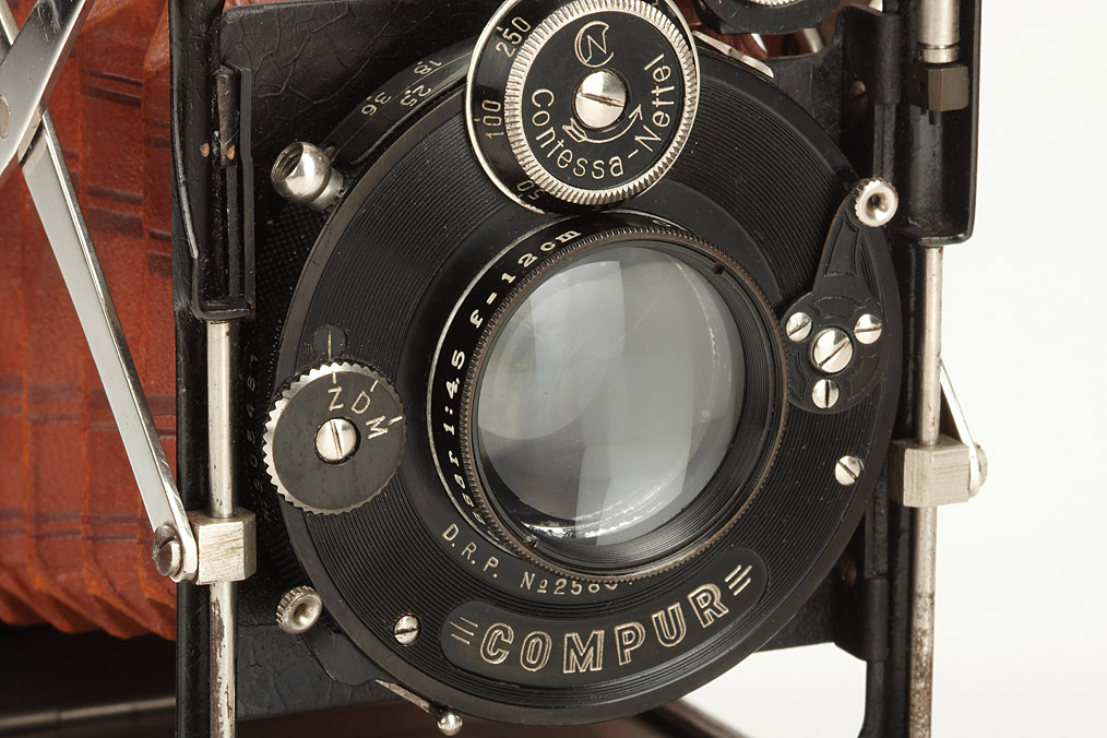 6.5x9cm, very fine camera with teakwood body, brown bellows, Tessar 4.5/12cm no.635239 in Compur shutter, brown leather back door with focusing screen