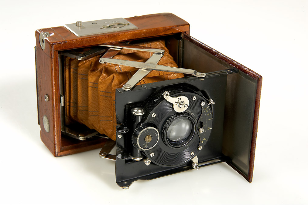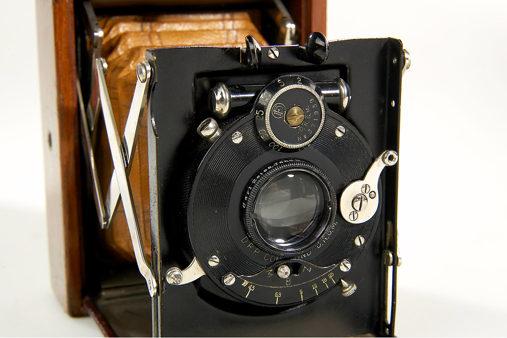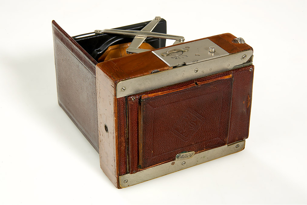 4.5x6cm, very rare camera in good working order, brown leather bellows, nickel fittings, original focusing screen, Tessar 4.5/7.5cm no.286658 in Compound shutter