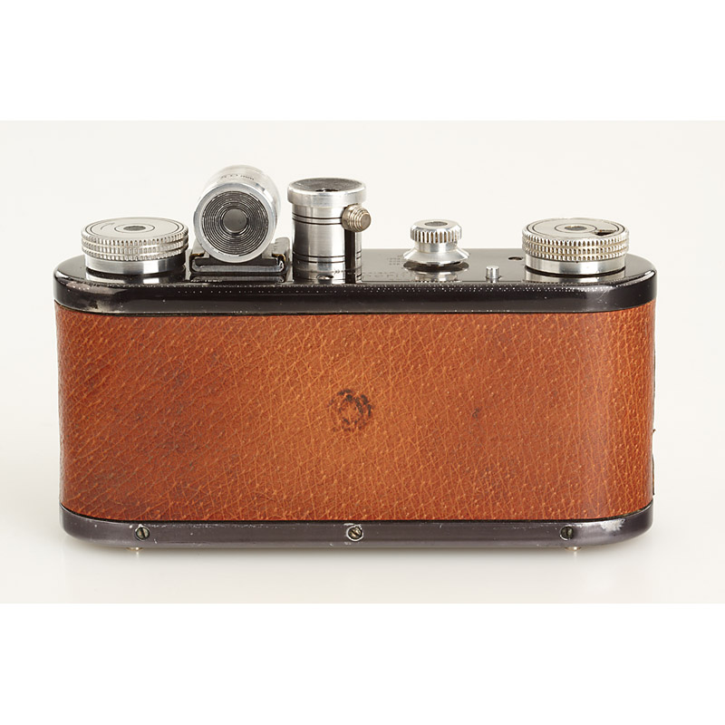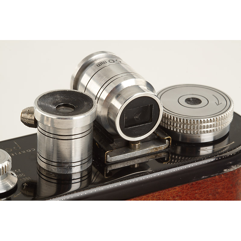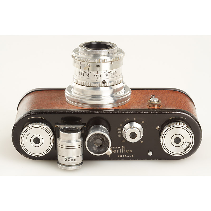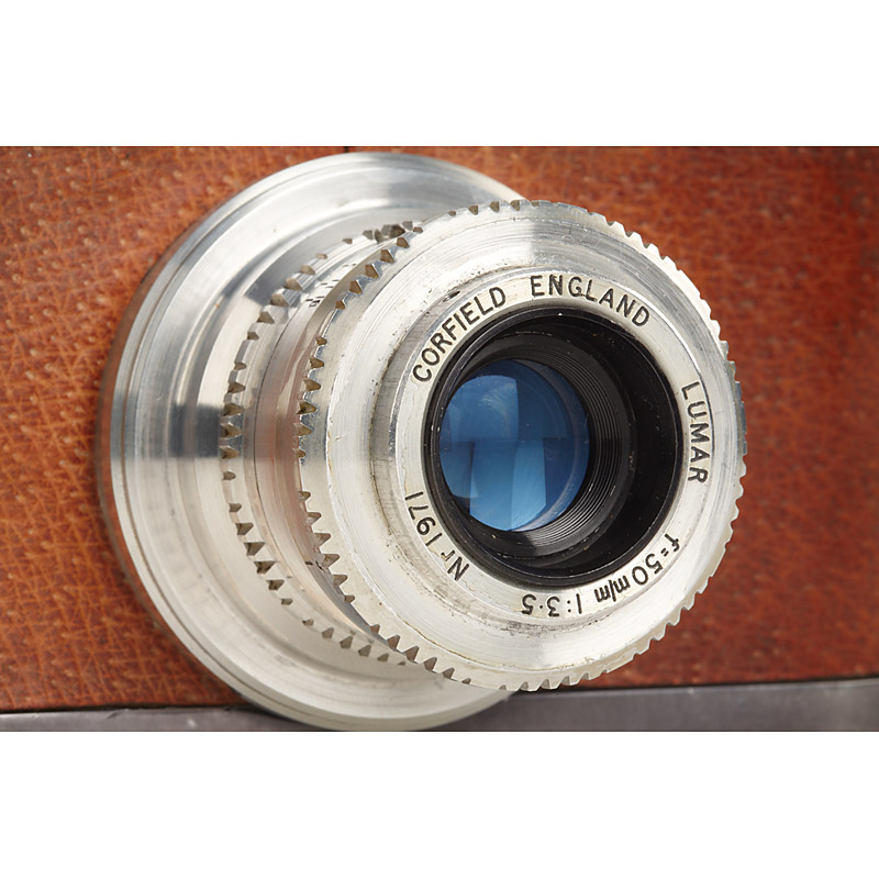 black-enamelled and brown pigskin-covered body, alloy-fittings, Corfield Lumar 3.5/50mm no.1971, (cap), everready case, very rare original Periflex (only 200 cameras were produced with pigskin body)