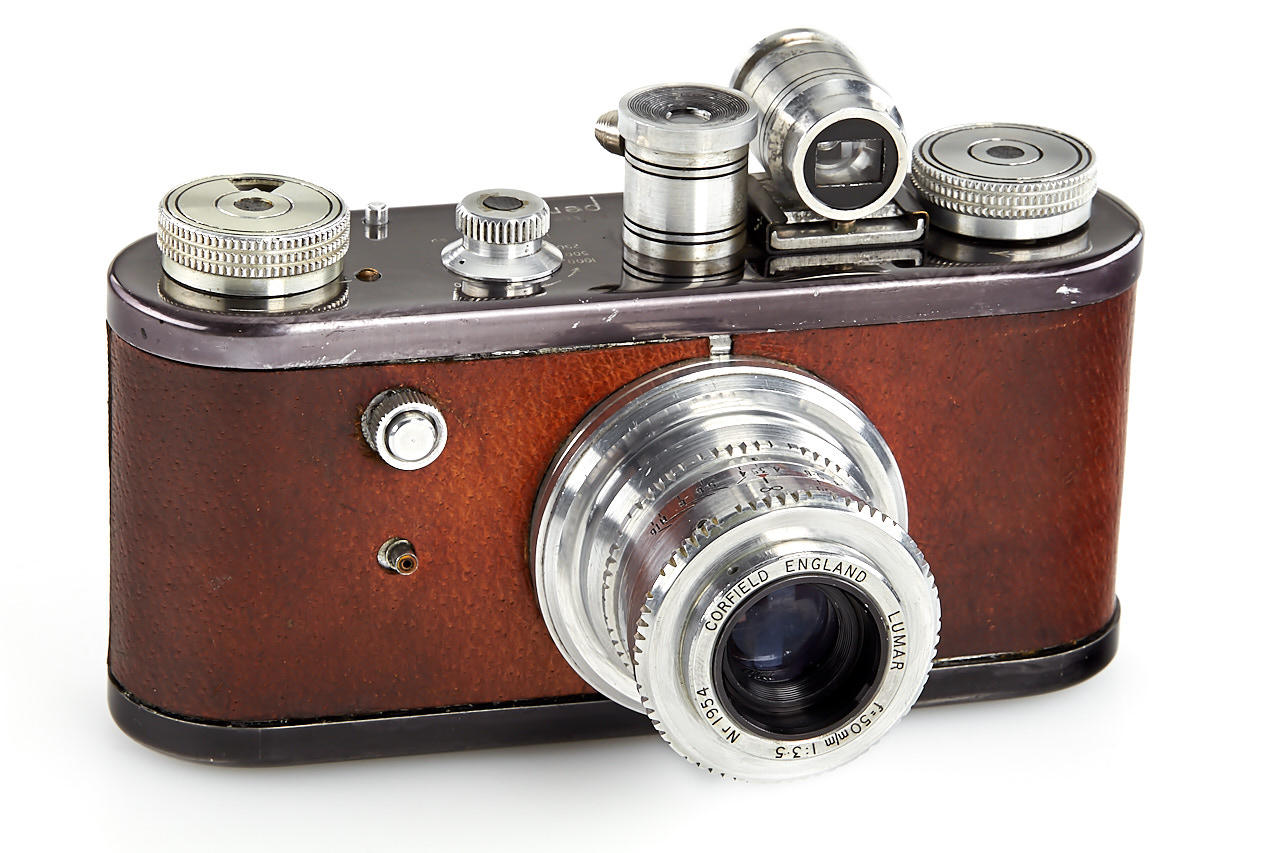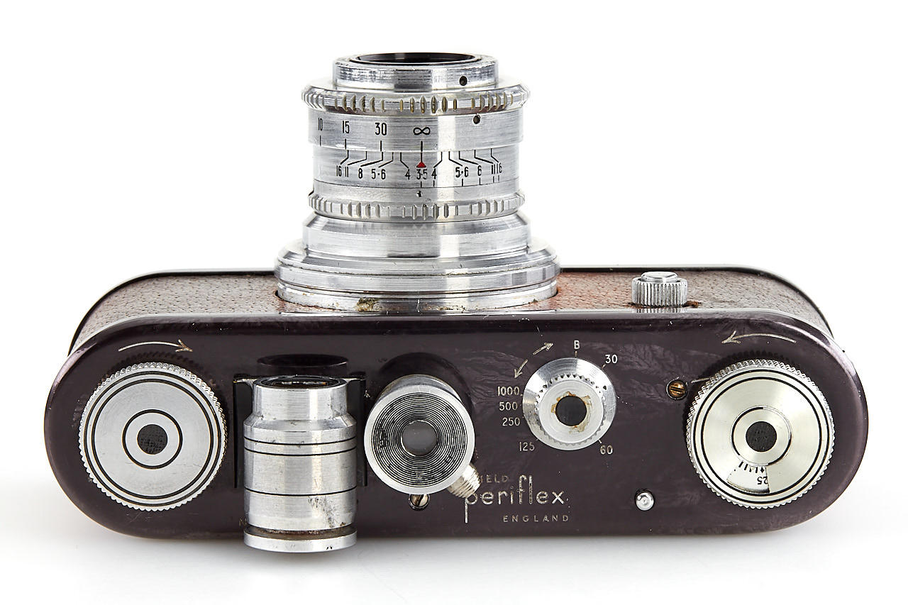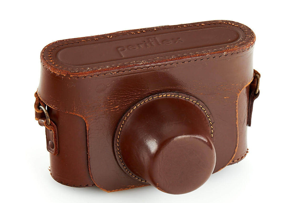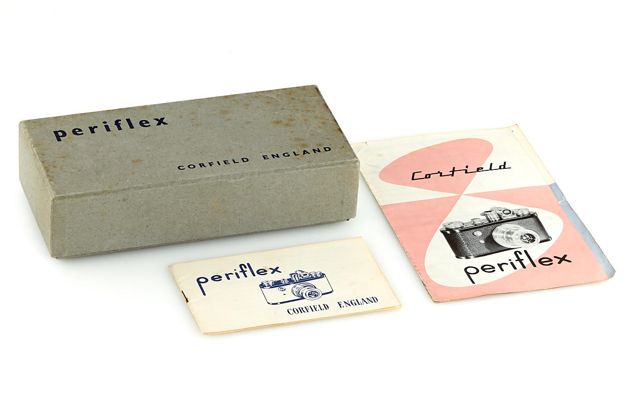 rare first version Periflex with black-enamelled and pigskin-covered body, aluminium fittings, Corfield Lumar 3.5/50mm no.1954, 5cm finder, angle finder, leather case, instructions and original brochure, in maker's box, only around 200 cameras were produced with pigskin-covered body - in this condition it is extremely hard to find