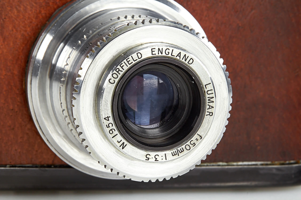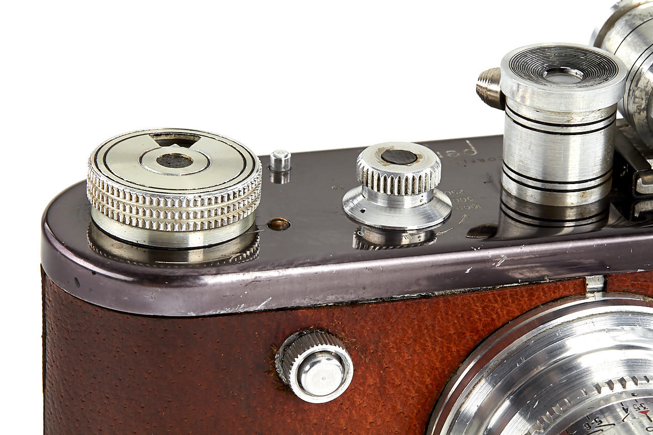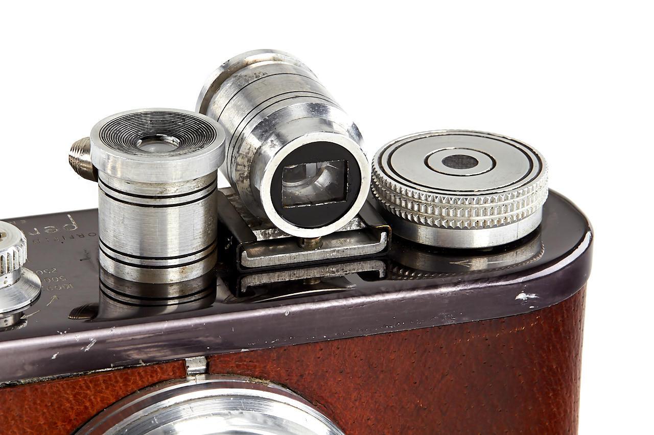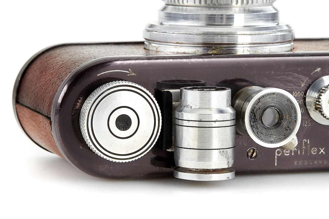 rare first version Periflex with black-enamelled and pigskin-covered body, aluminium fittings, Corfield Lumar 3.5/50mm no.1954, 5cm finder, angle finder, leather case, instructions and original brochure, in maker's box, only around 200 cameras were produced with pigskin-covered body - in this condition it is extremely hard to find