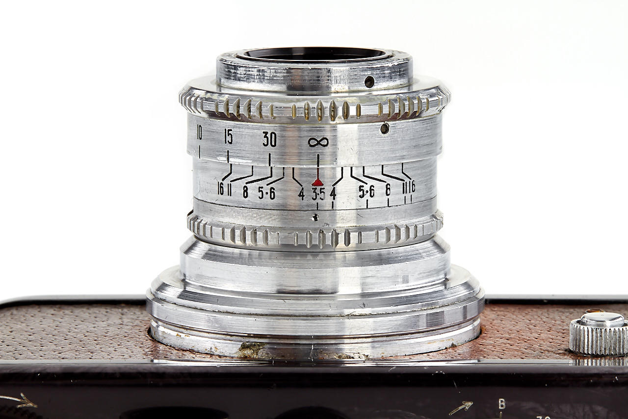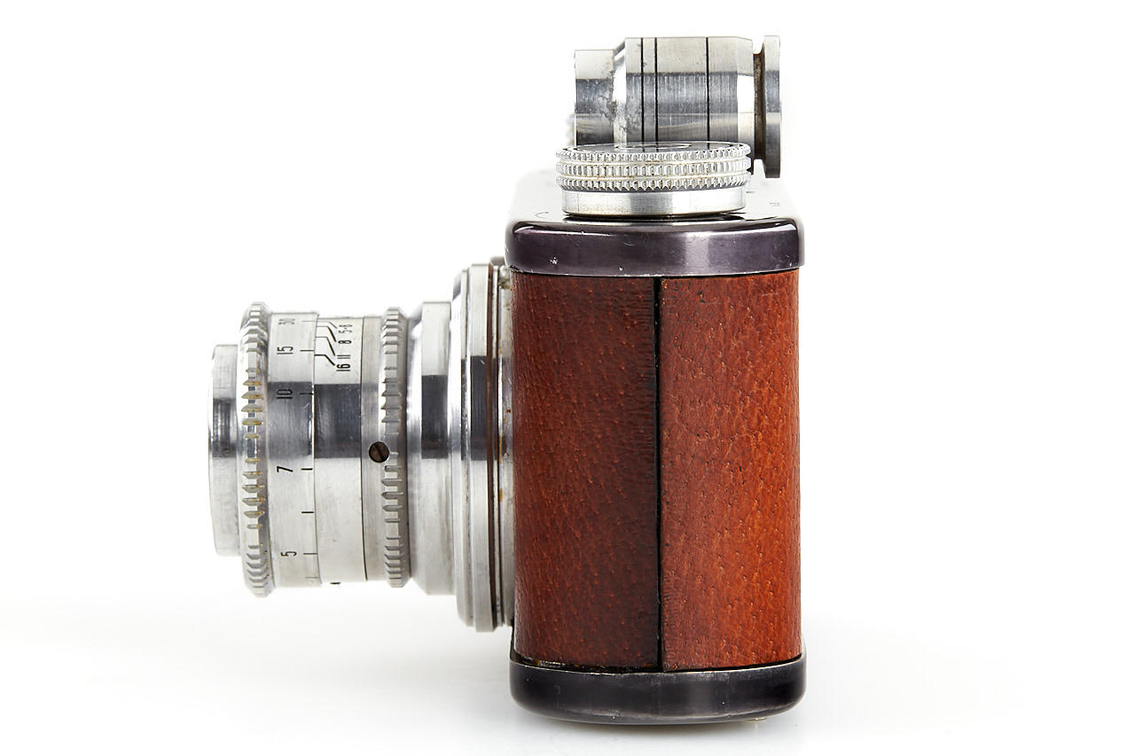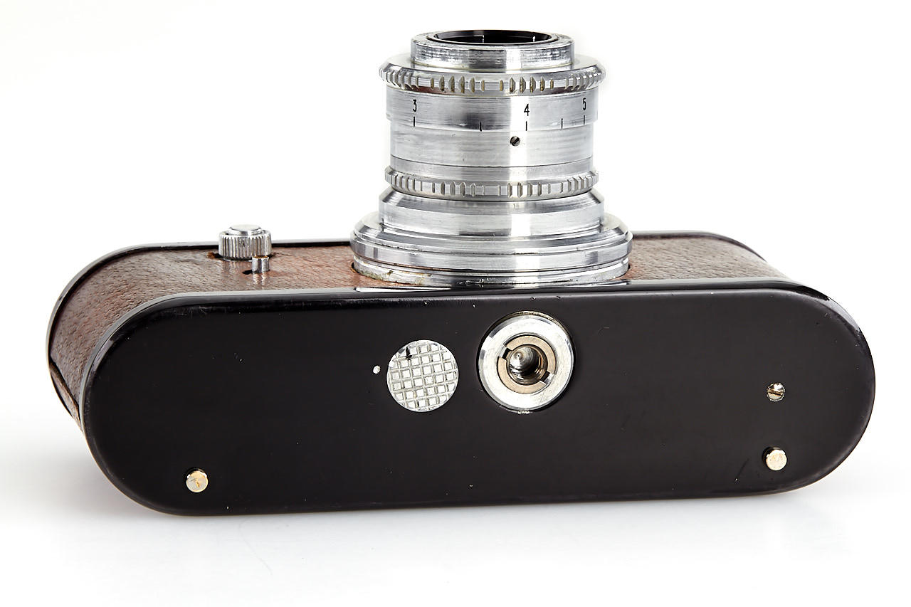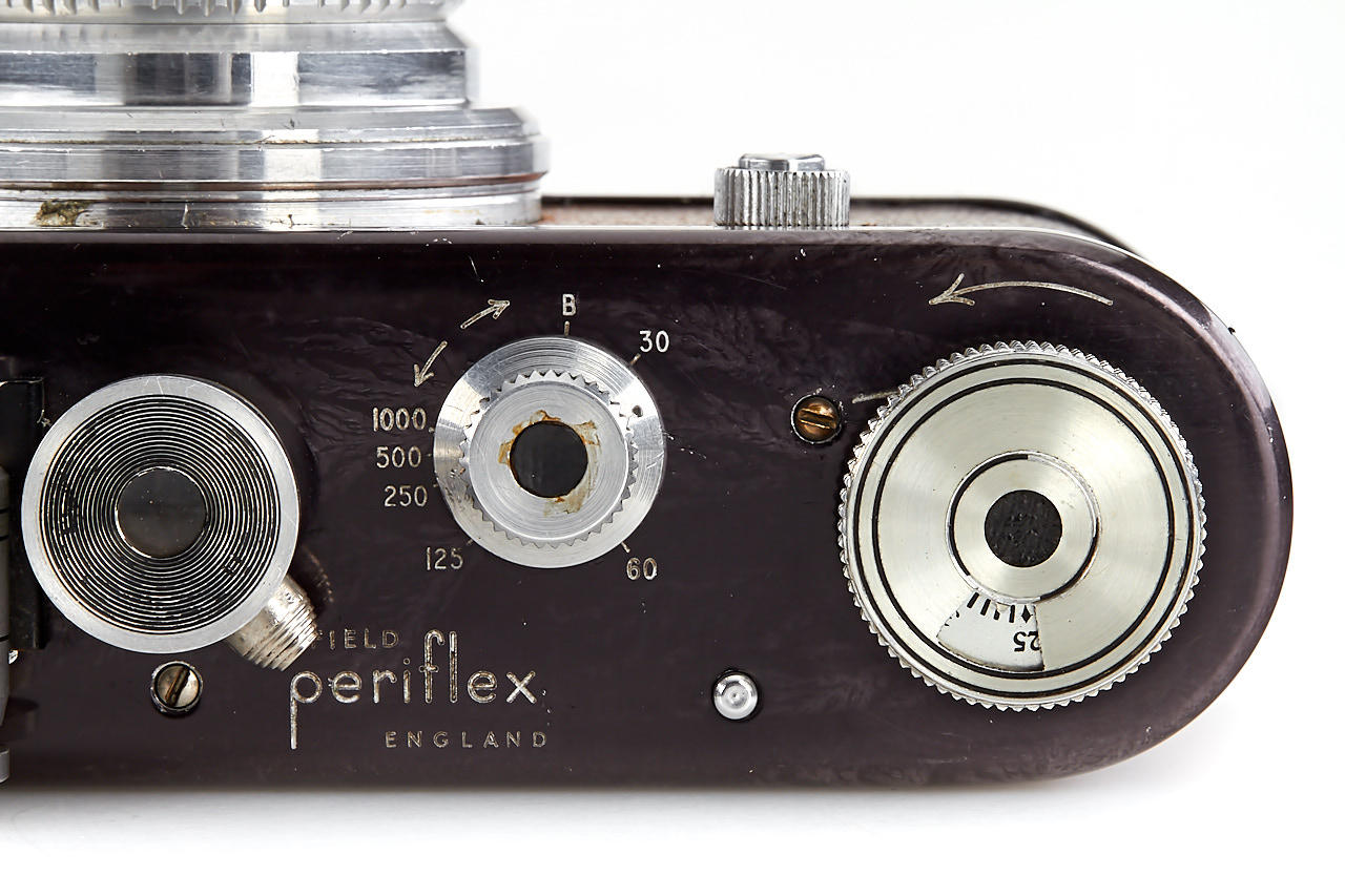 rare first version Periflex with black-enamelled and pigskin-covered body, aluminium fittings, Corfield Lumar 3.5/50mm no.1954, 5cm finder, angle finder, leather case, instructions and original brochure, in maker's box, only around 200 cameras were produced with pigskin-covered body - in this condition it is extremely hard to find