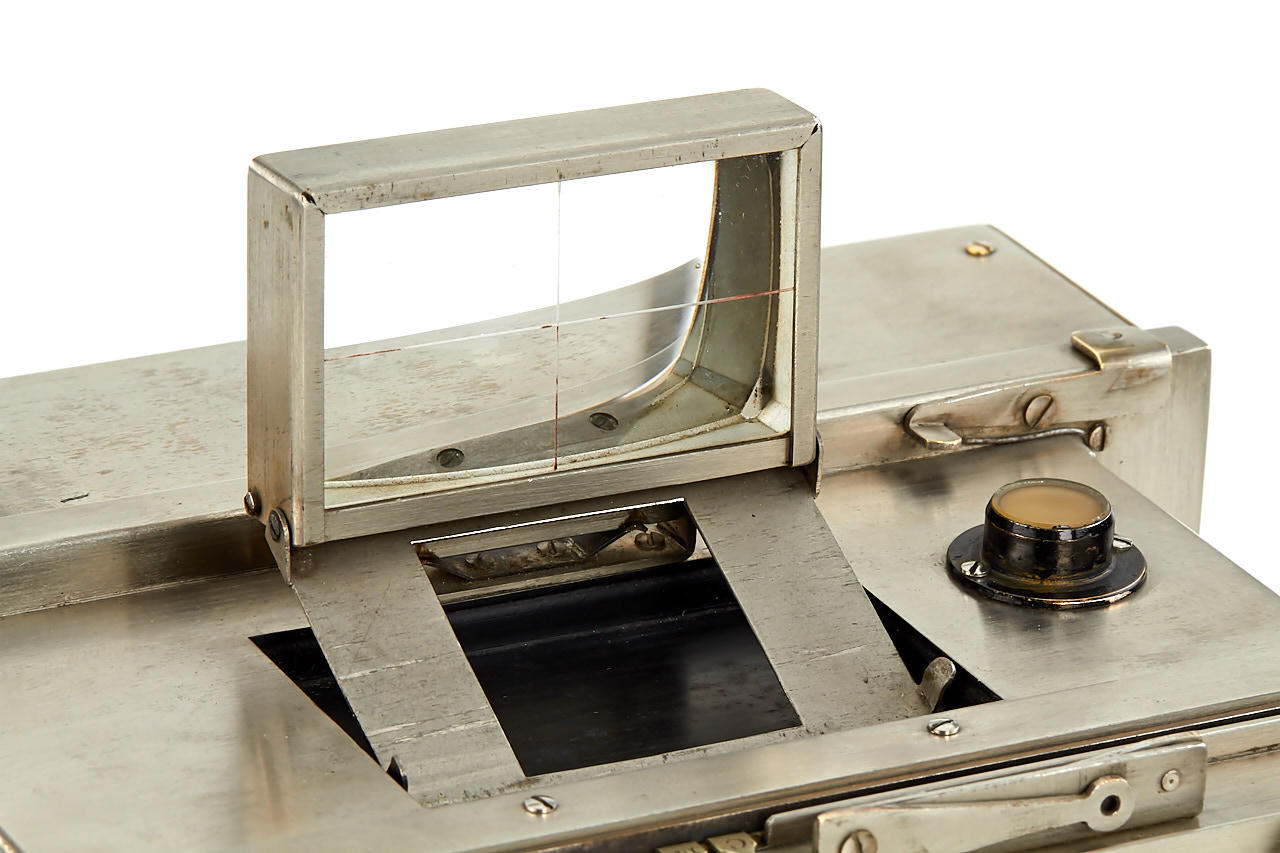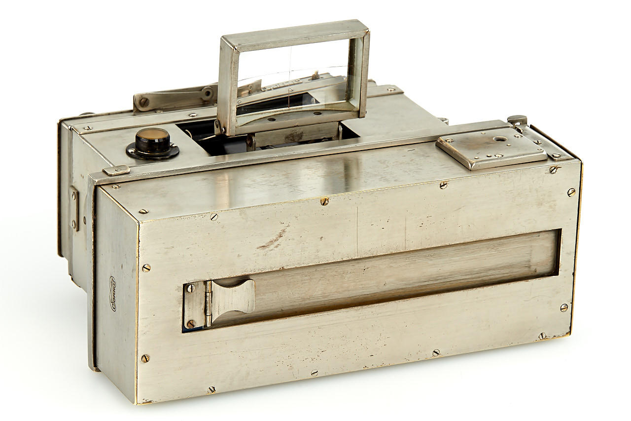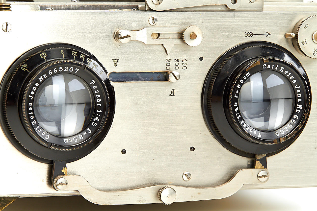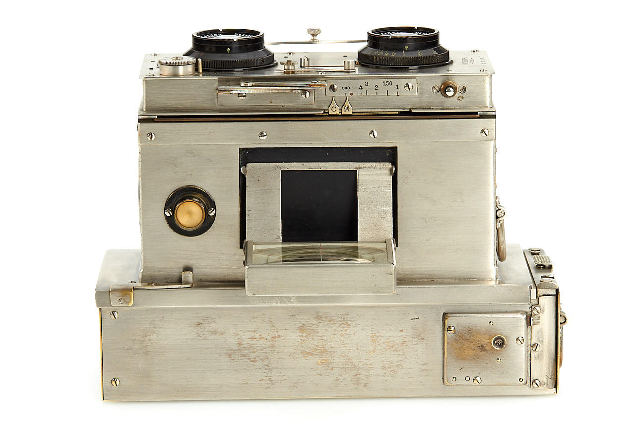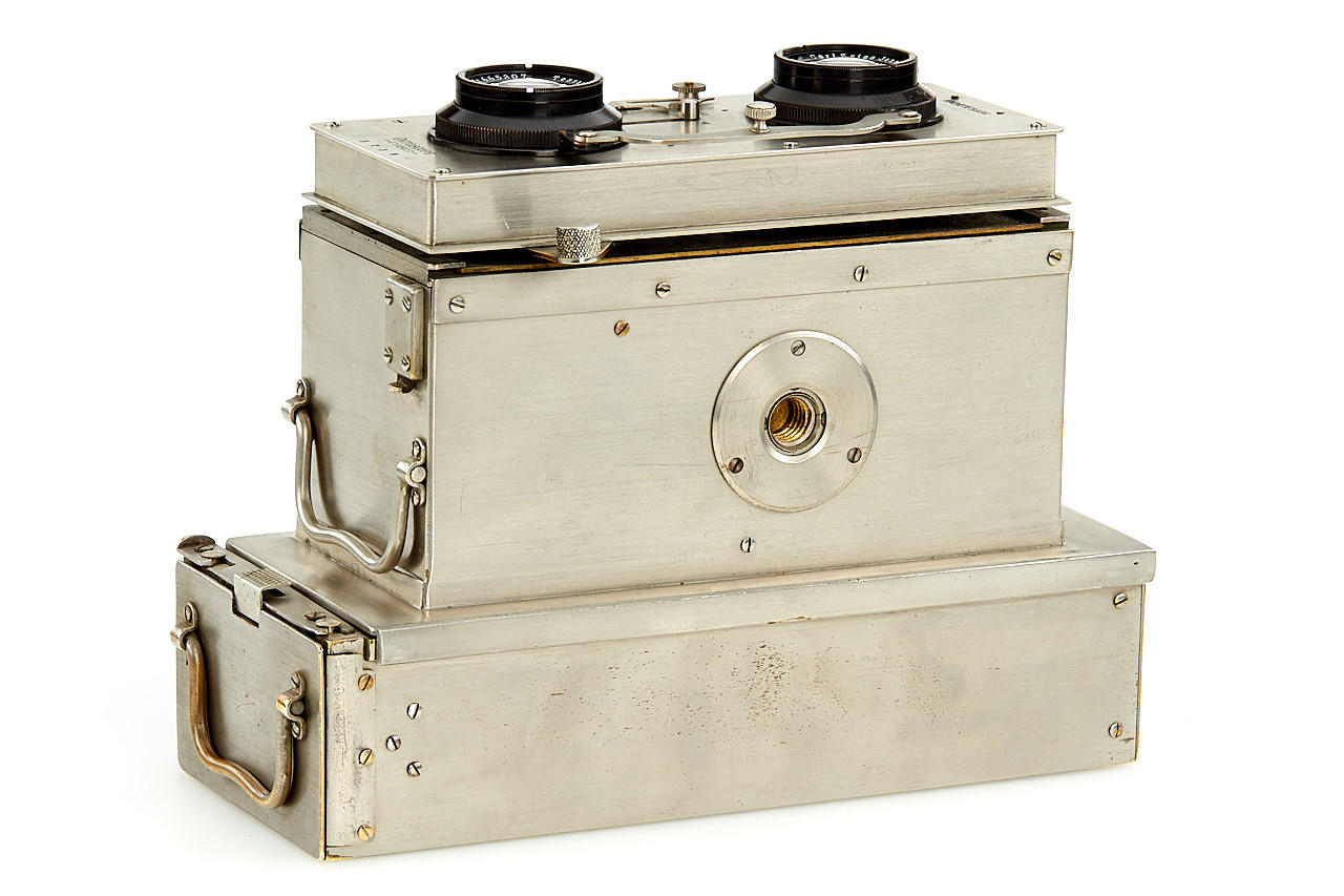 all-metal French stereo camera, late advanced version with shifting front for stereo and panoramic exposures on 6x13cm plates, with dual Tessar 4.5/8.5cm no.665208 and 665207, Cornu magazine back and (worn) leather case