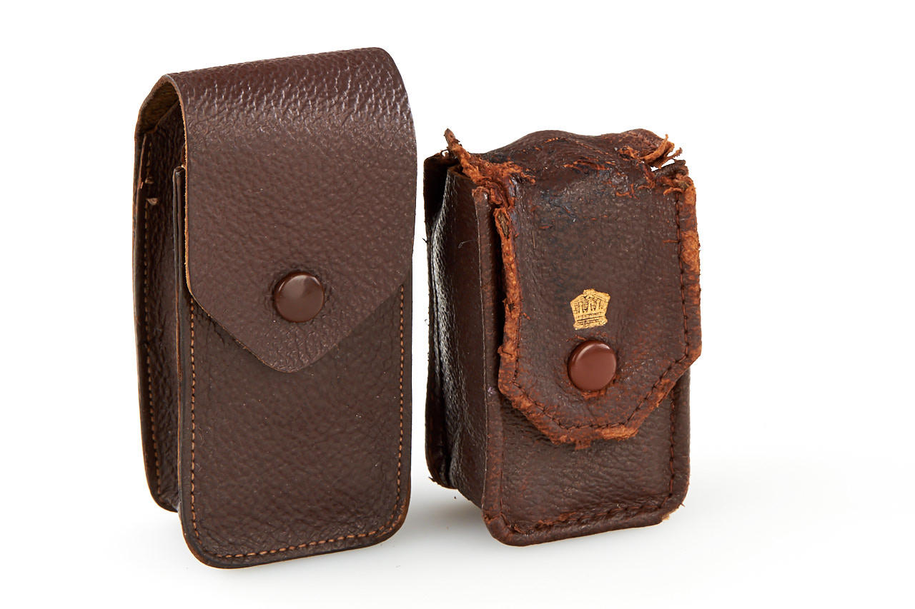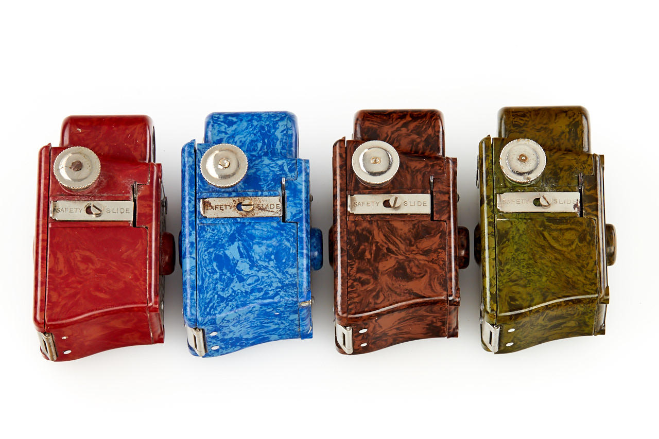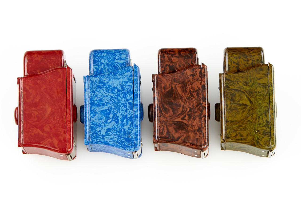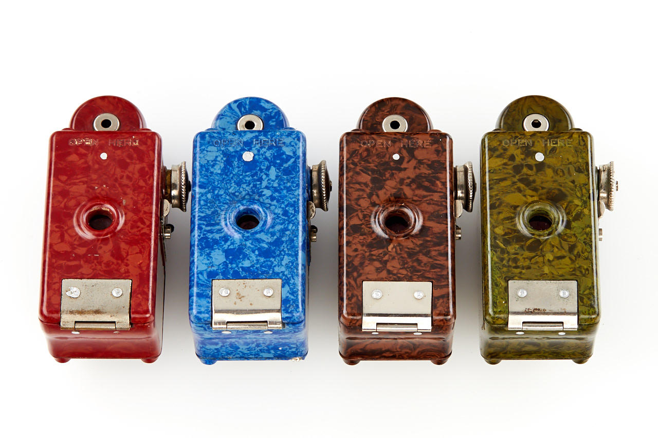 four different colours (red, brown, olive-green and the rare blue version) of this classic 16mm bakelite camera, all in very good condition, no chips or cracks, incl. two leather cases