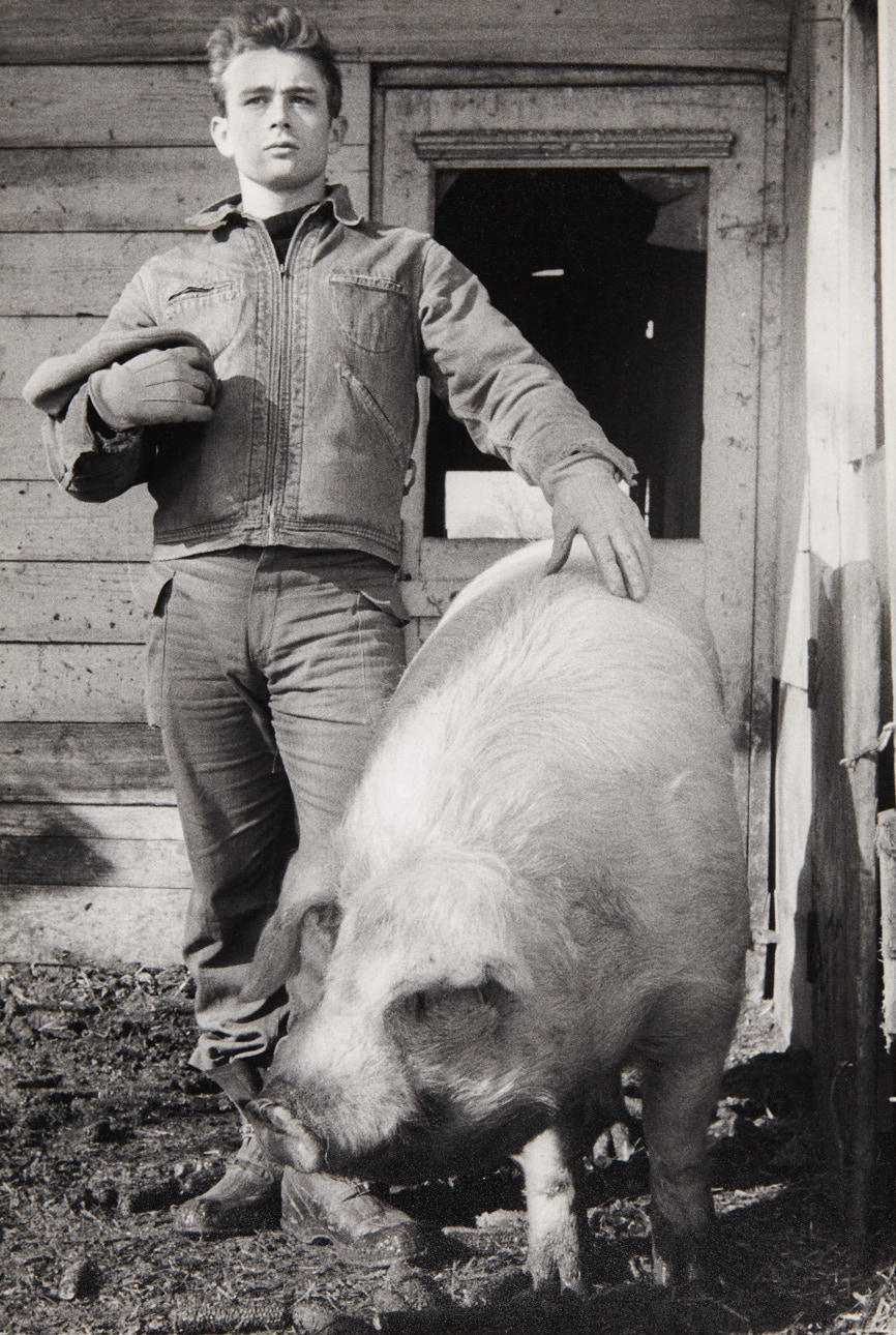 Vintage silver print 34,7 x 23,5 cm Photographer's agency stamp and various notations in pencil and ink on the reverse James Dean posiert auf der Farm seines Onkels Winslow mit einem Schwein; publiziert am 7. März 1955 in Life als Teil von Stocks Fotostory ‘Moody New Star’ (‘Newcomer mit Launen’) / James Dean on the farm of his uncle Marcus Winslow, posing with a pig; the image was published in Life on March 7th, 1955 as part of Stock's photo story ‘Moody New Star’.