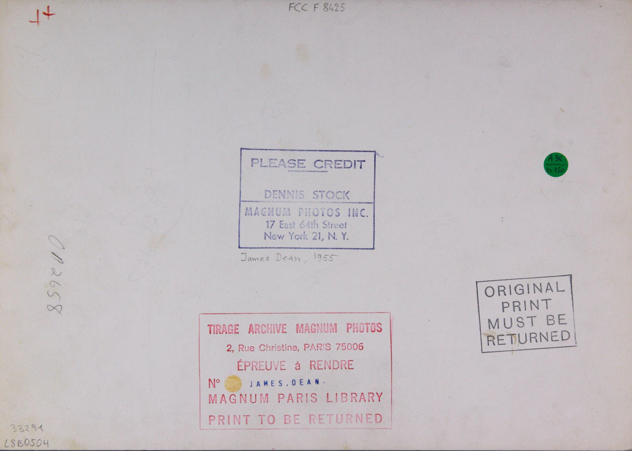Vintage silver print 23,9 x 33,8 cm Photographer's agency credit stamp and Magnum archive stamp on the reverse, handwritten notations in pencil on the reverse LITERATURE Dennis Stock, James Dean, Editions de la Martinière 2005, p. 106-107.