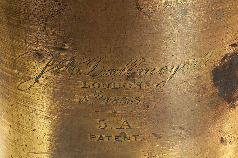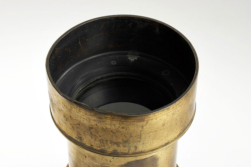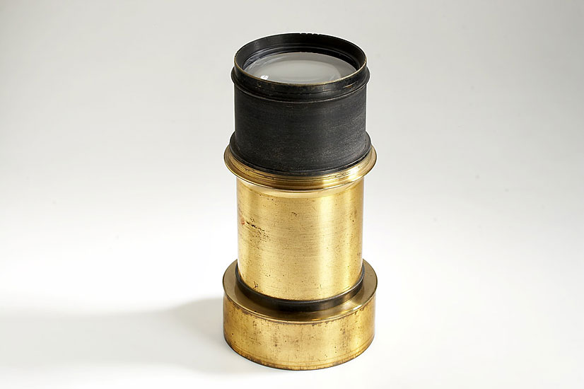 large brass lens with waterhouse slot, height 34cm, diameter 18cm, engraved: 'J.H. Dallmeyer London' No.5.A. Patent, very clean lenses