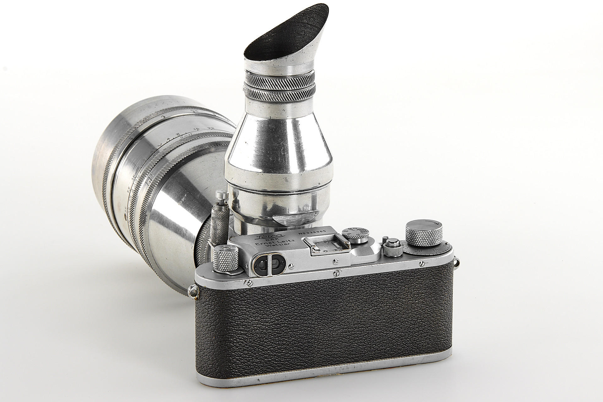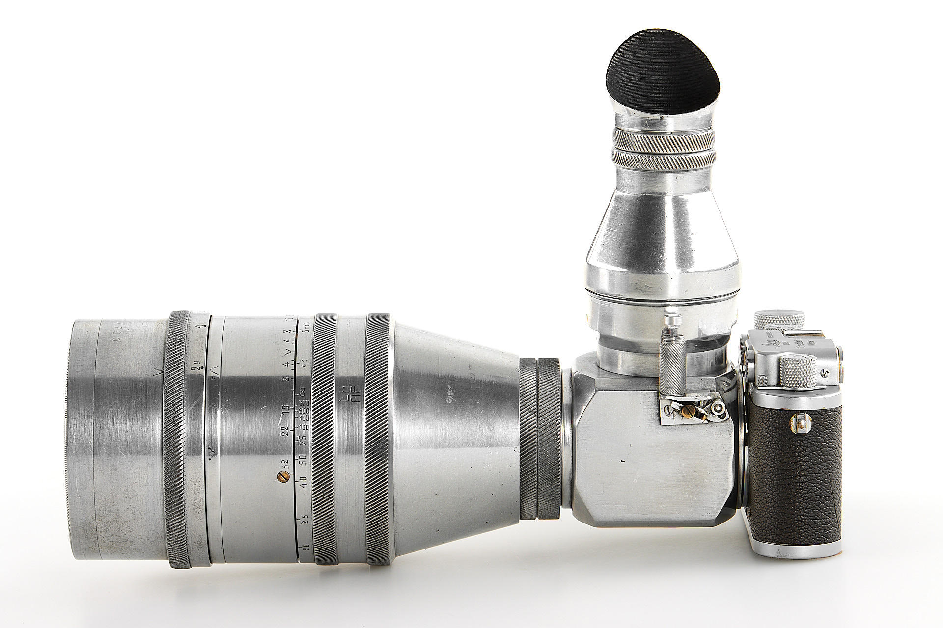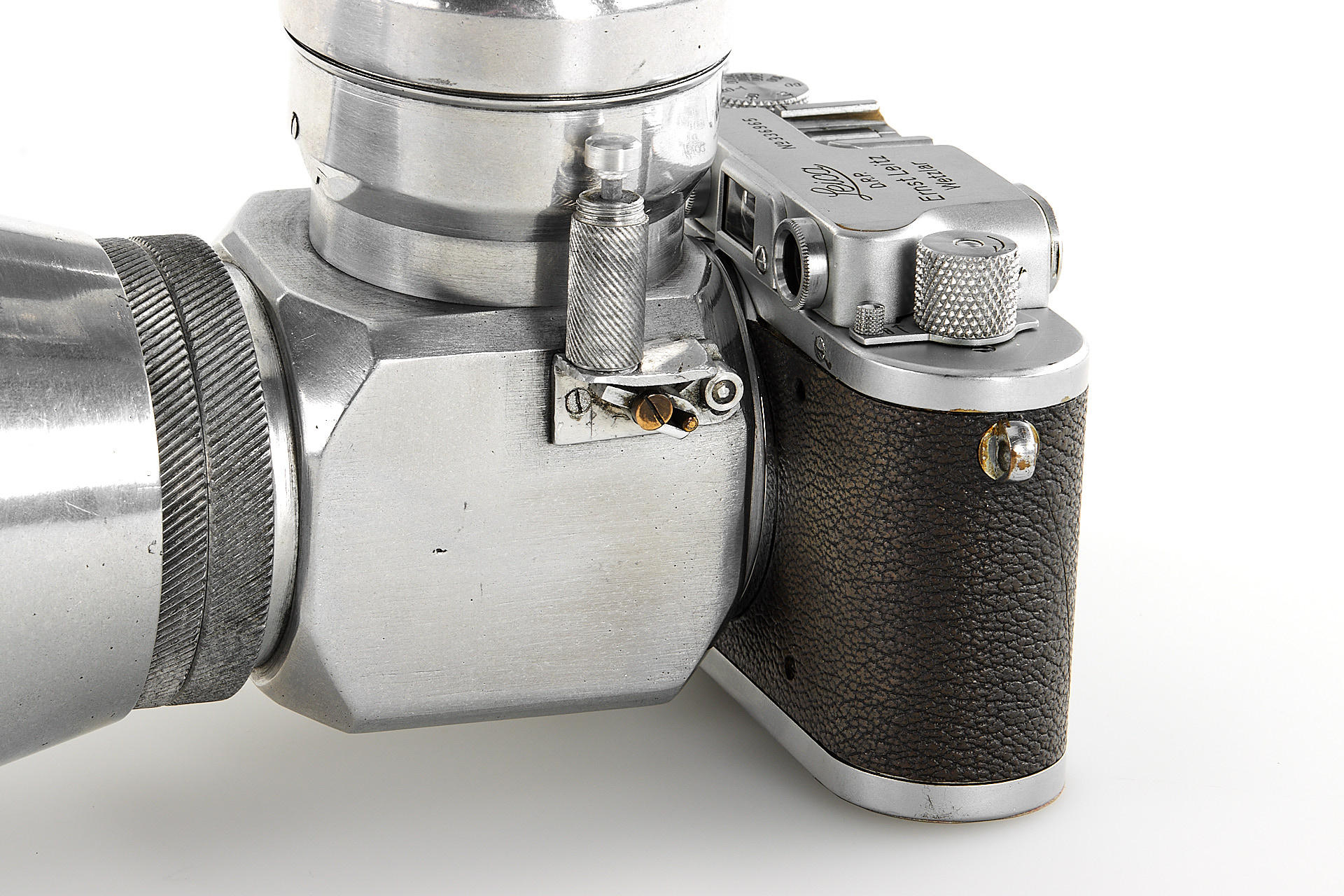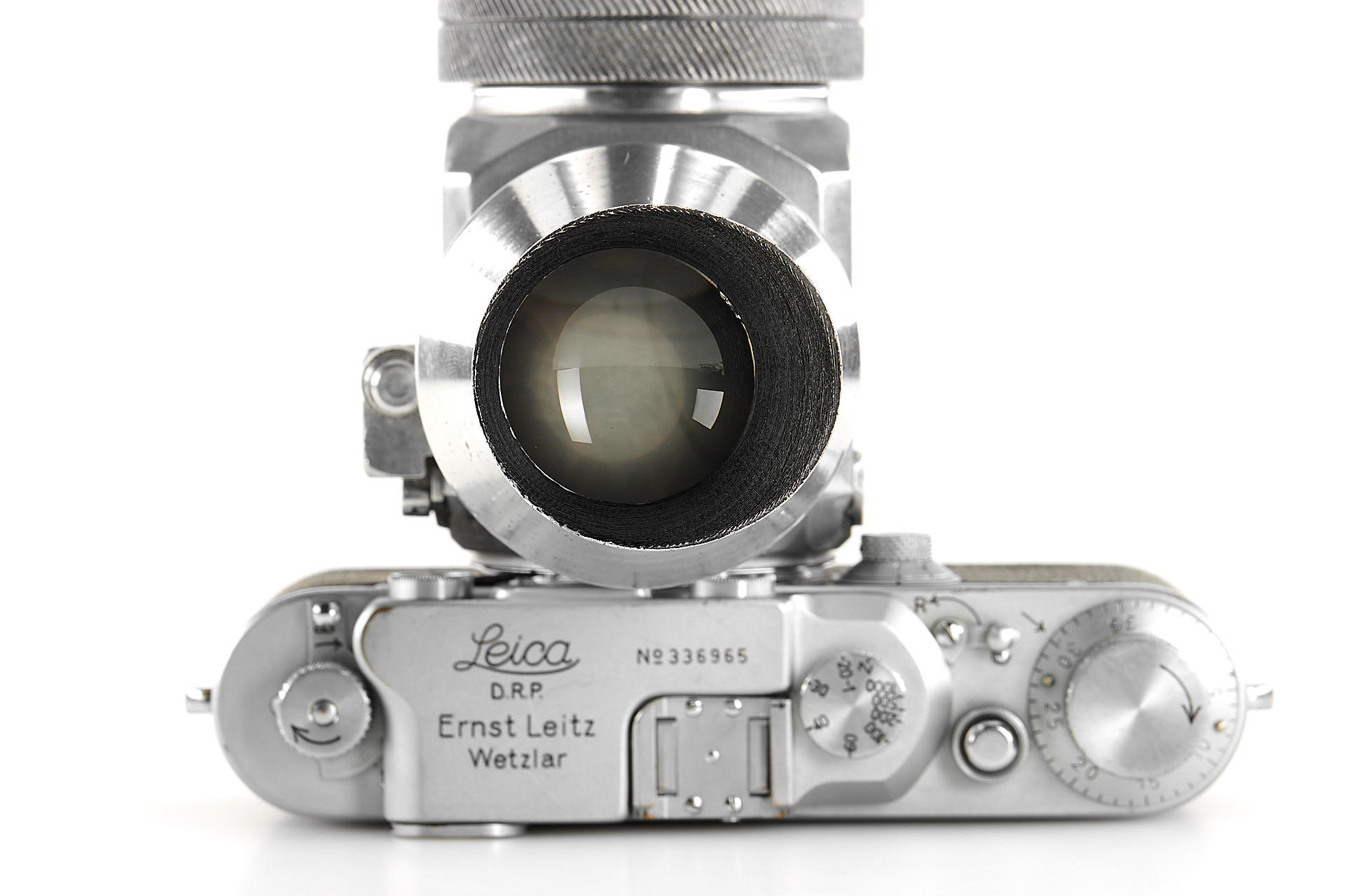 fast telephoto lens, finished in polished aluminium, engraved on the barrel with: '14A/780 A.M.' and a British crown, with chrome mirror reflex housing (copy of Leitz PLOOT), original chrome metal cap, including a Leica IIIb body no.336965