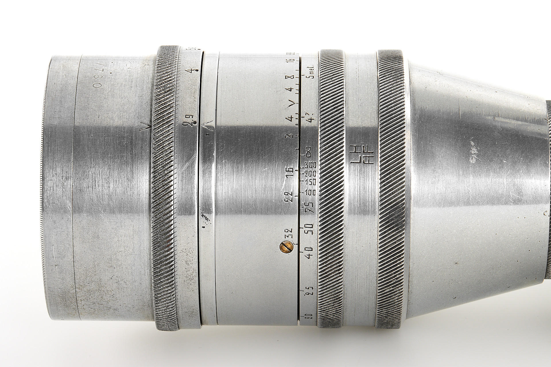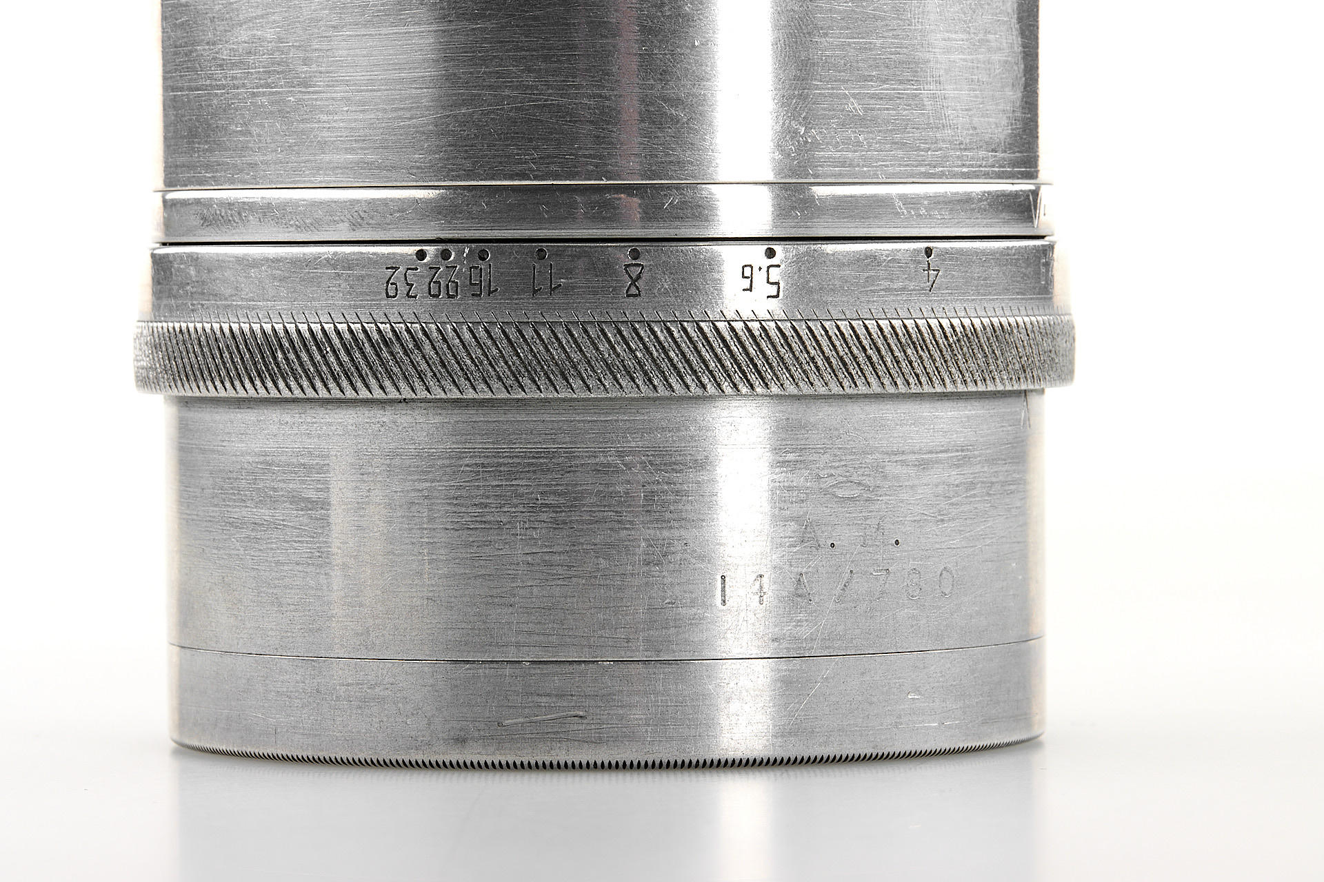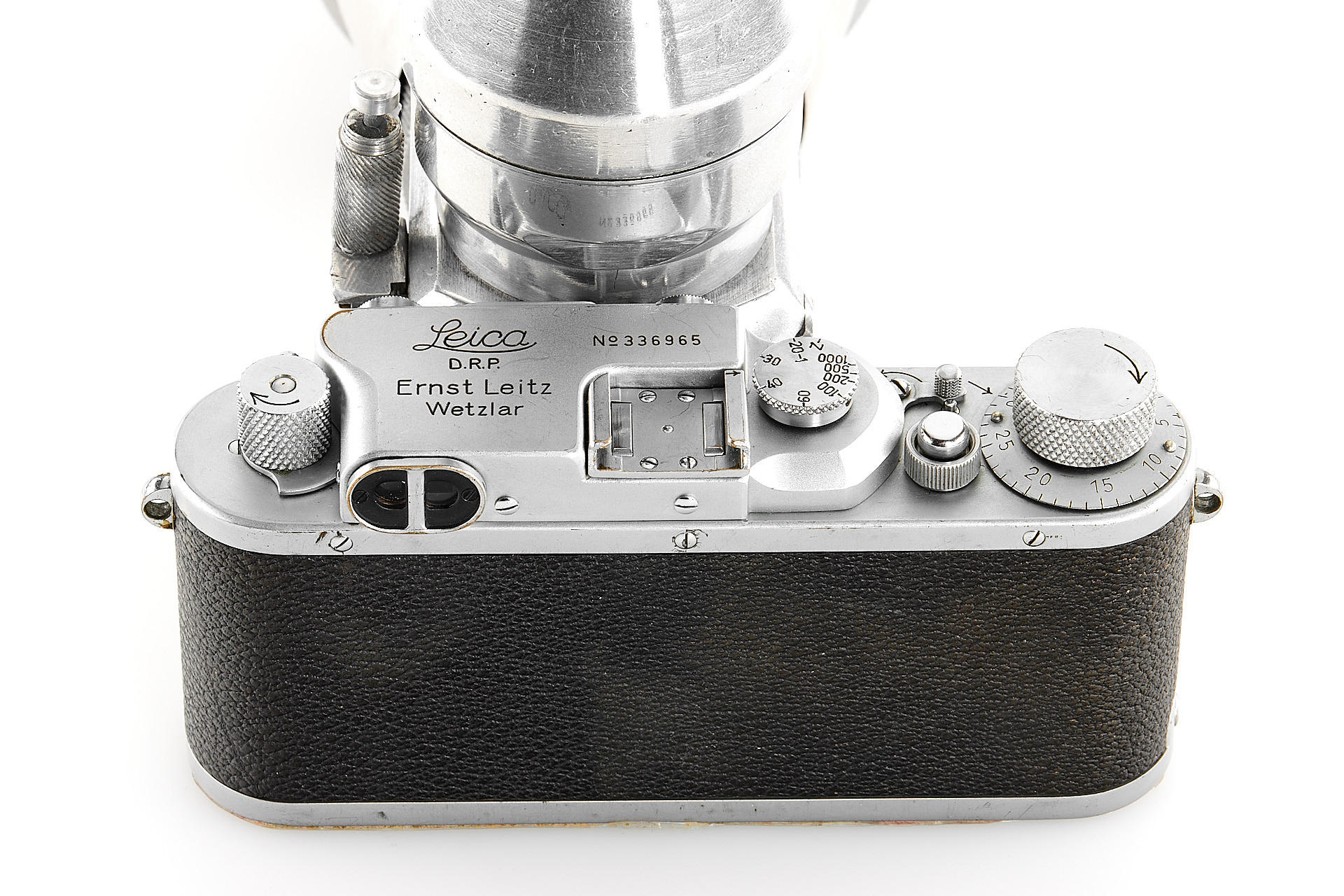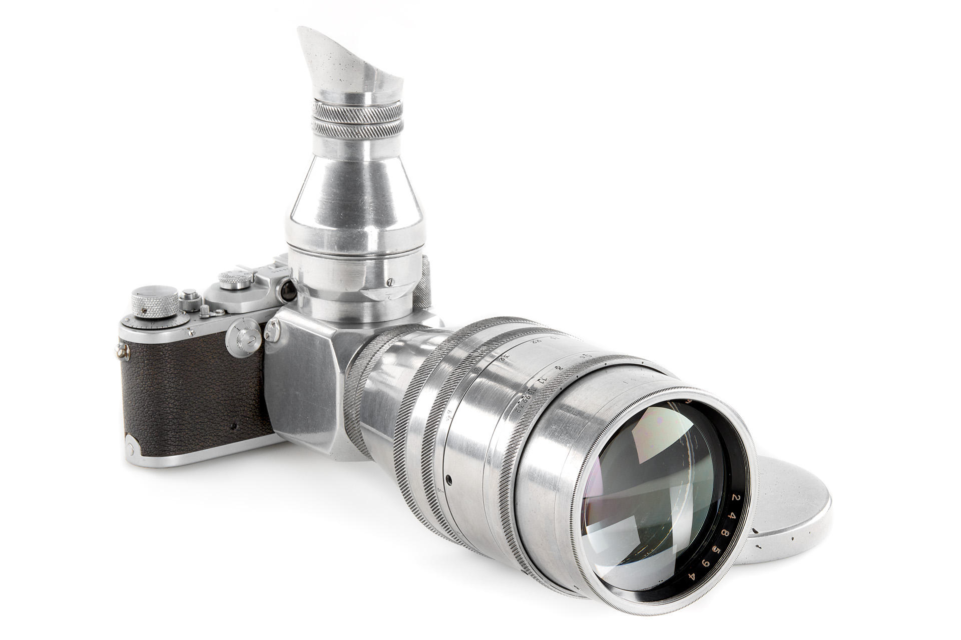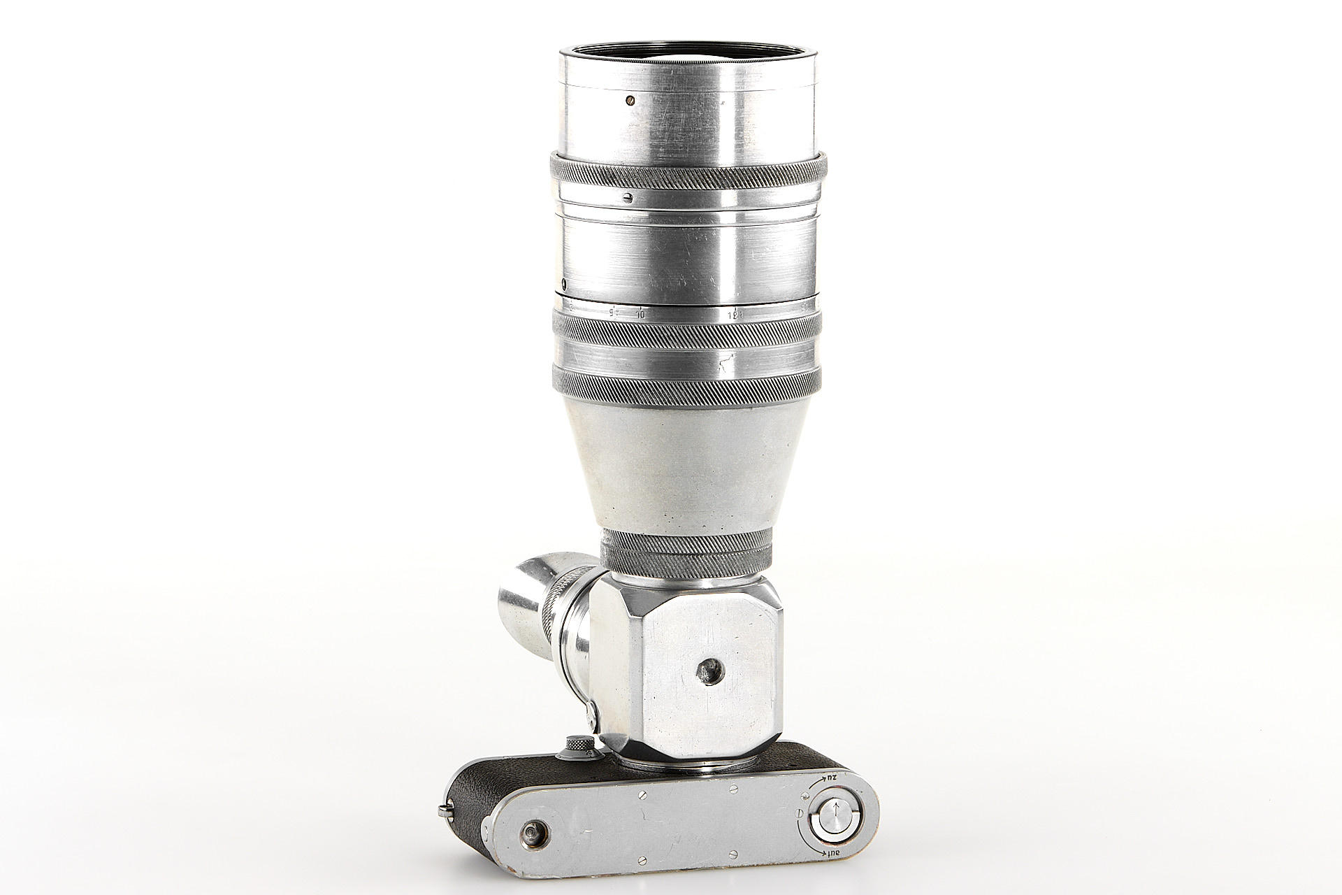 fast telephoto lens, finished in polished aluminium, engraved on the barrel with: '14A/780 A.M.' and a British crown, with chrome mirror reflex housing (copy of Leitz PLOOT), original chrome metal cap, including a Leica IIIb body no.336965