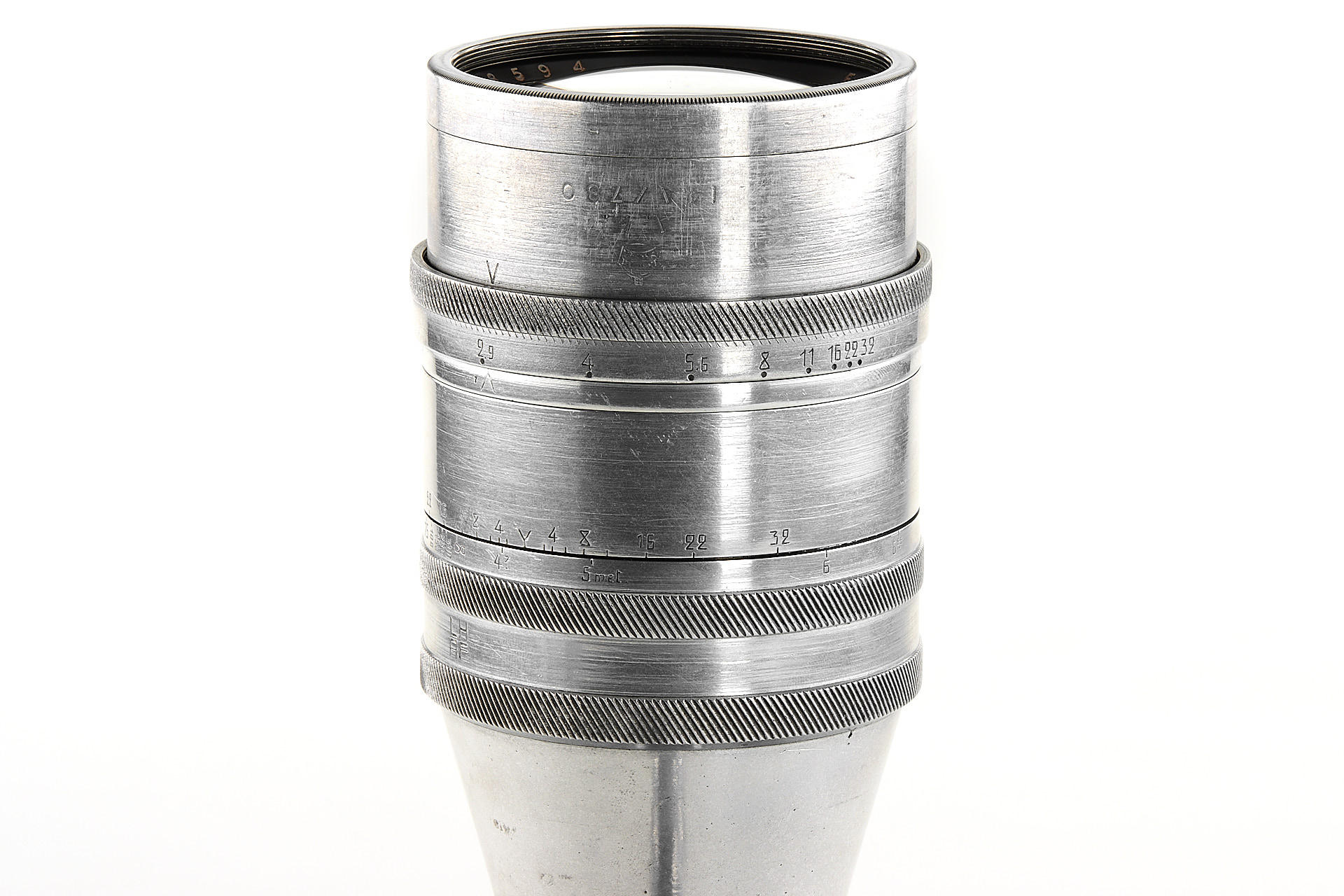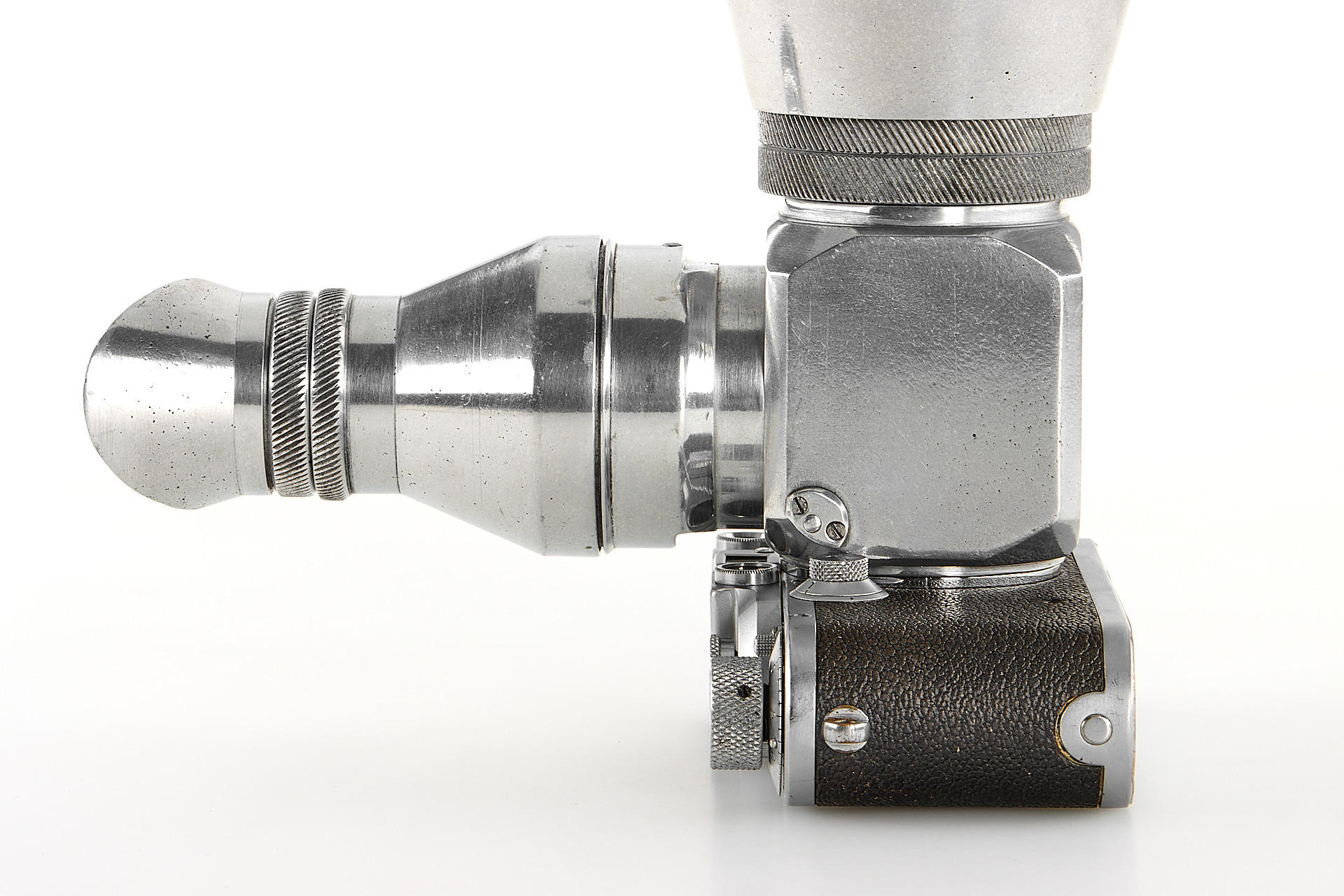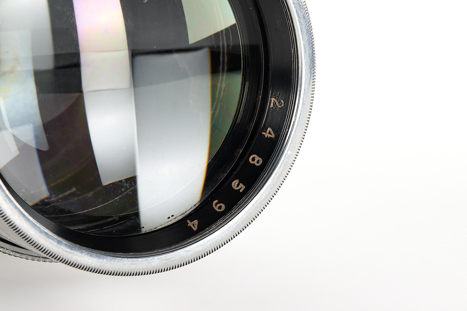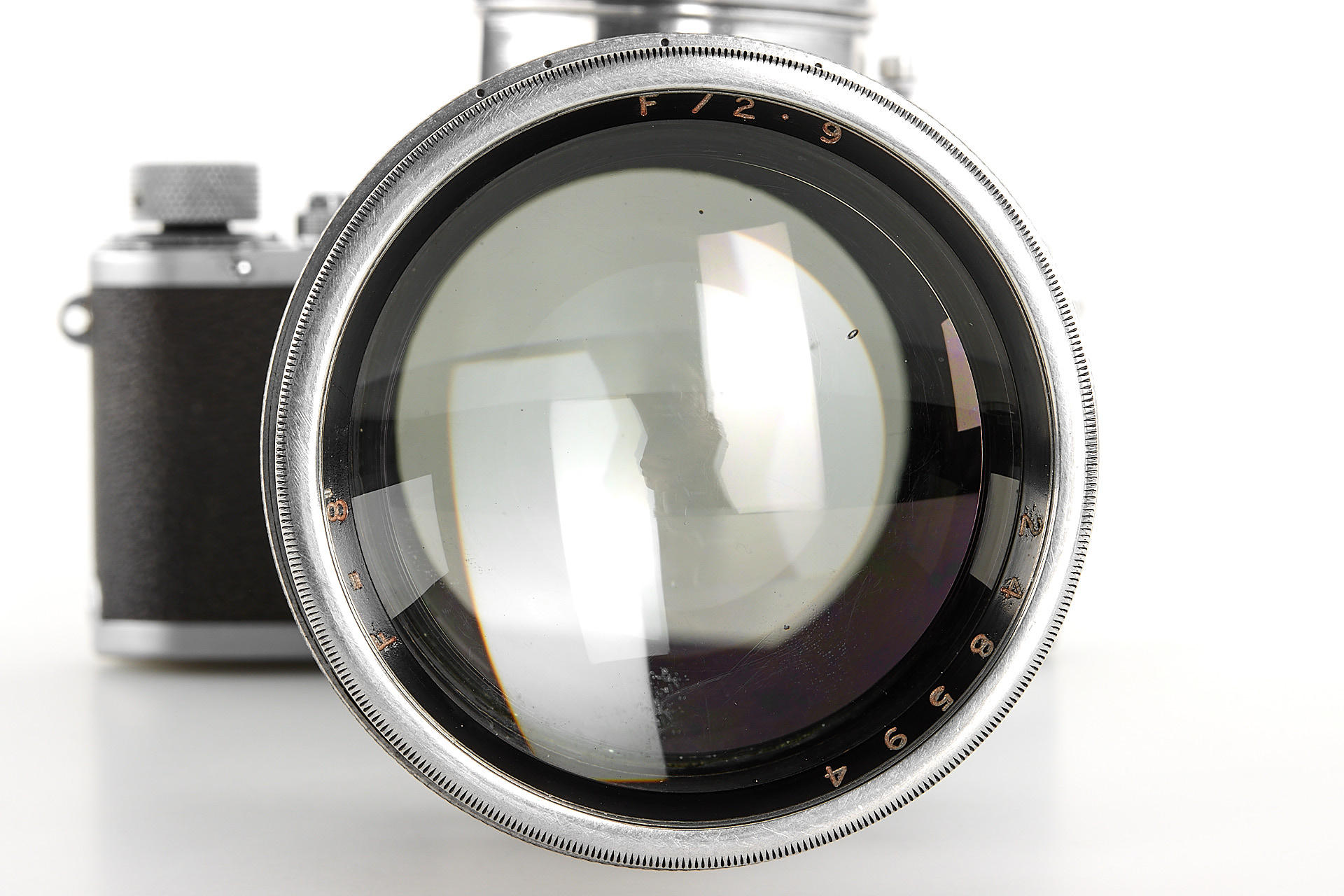 fast telephoto lens, finished in polished aluminium, engraved on the barrel with: '14A/780 A.M.' and a British crown, with chrome mirror reflex housing (copy of Leitz PLOOT), original chrome metal cap, including a Leica IIIb body no.336965