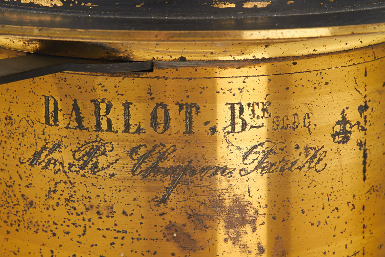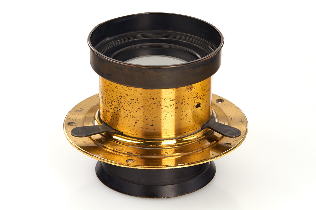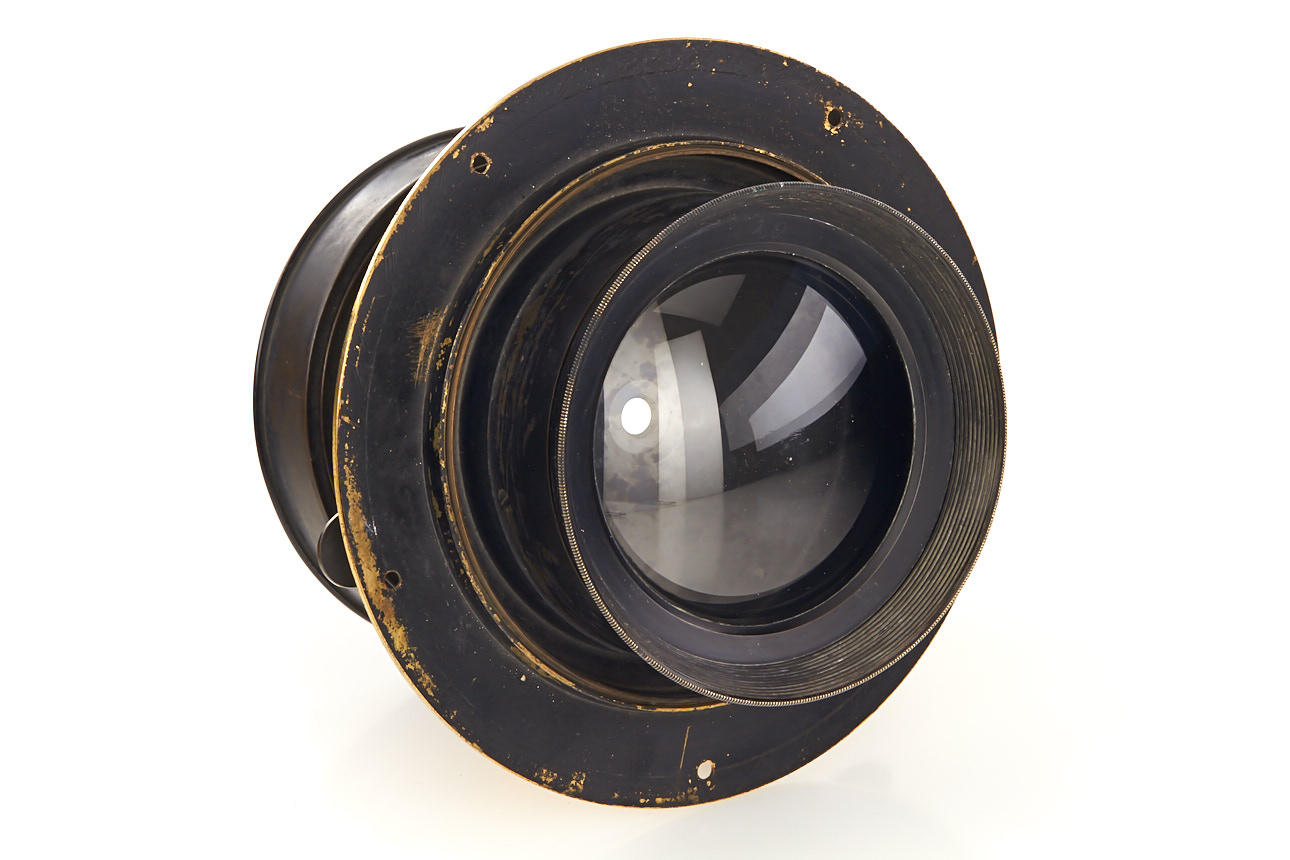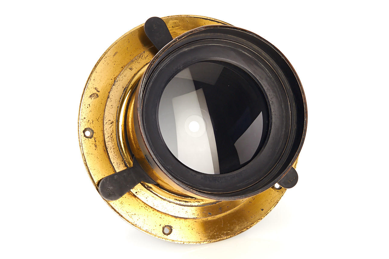 early wide angle large format brass lens, focal length c.50cm (!), total height 13cm, with three swing-out stops marked 7, 9 and 12, the design derives from Harrison's Globe and improves it by using different lens curvatures for front and rear element, the lens is in very good condition, optics with only minimal flaws, extremely rare in this large size