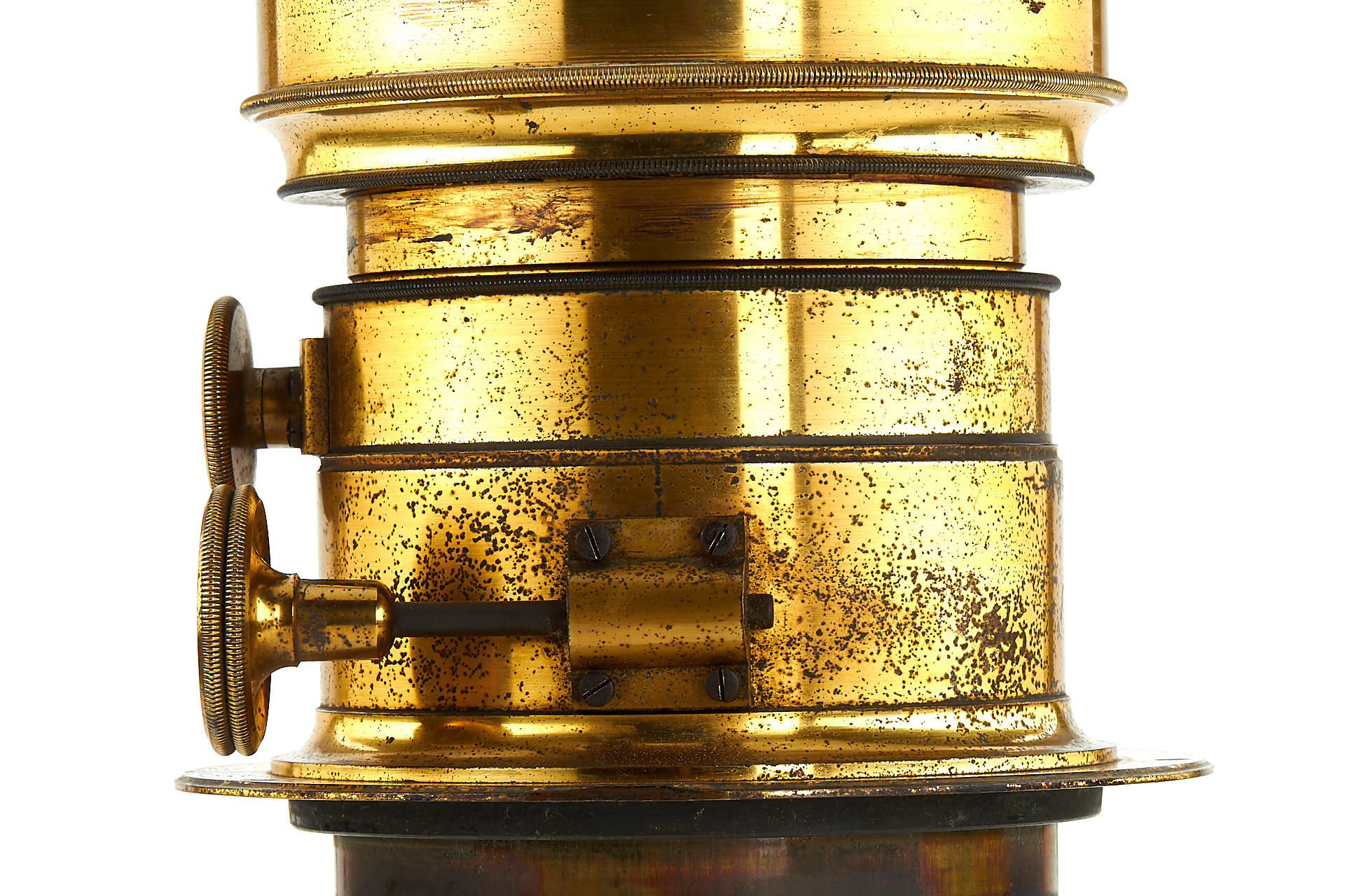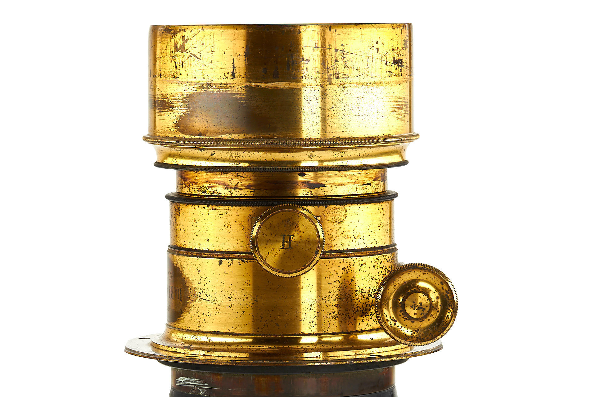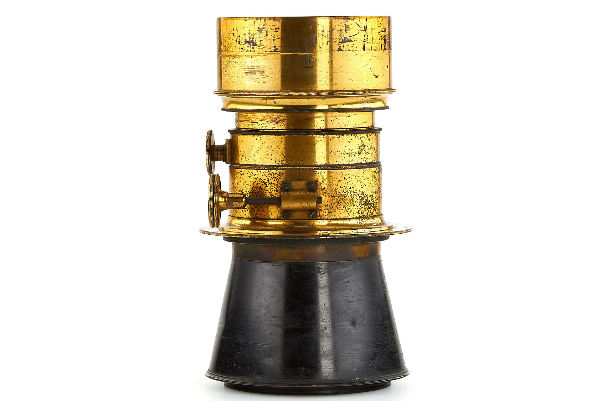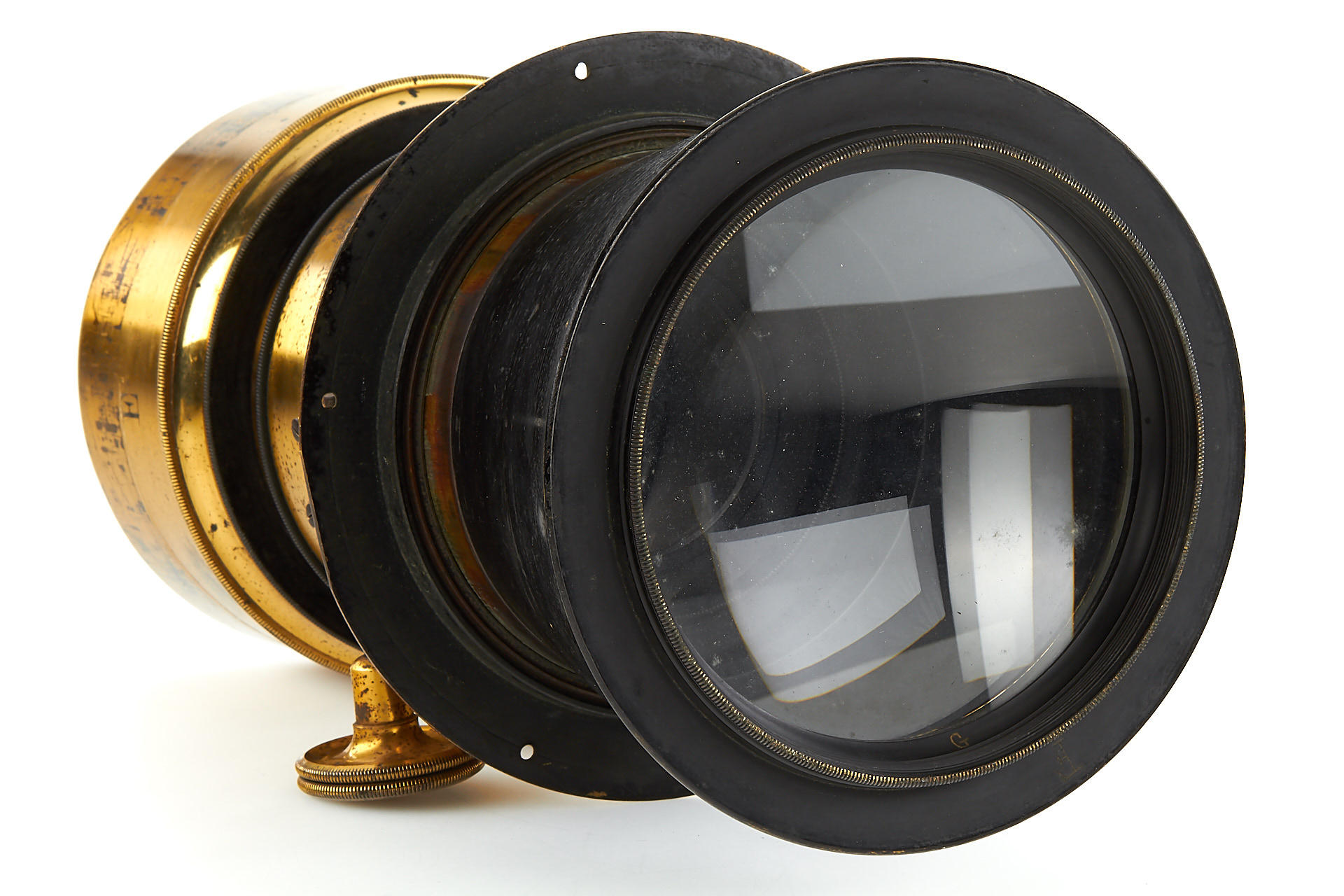 impressive brass lens for portraits and landscape, it has been designed to work as a landscape lens by unscrewing the rear group completely and mounting the lens reversed (with front-facing aperture) on the camera, total height with hood 33cm, in fine condition, no missing parts, very good optics, with original front cap, in this large size very hard to find