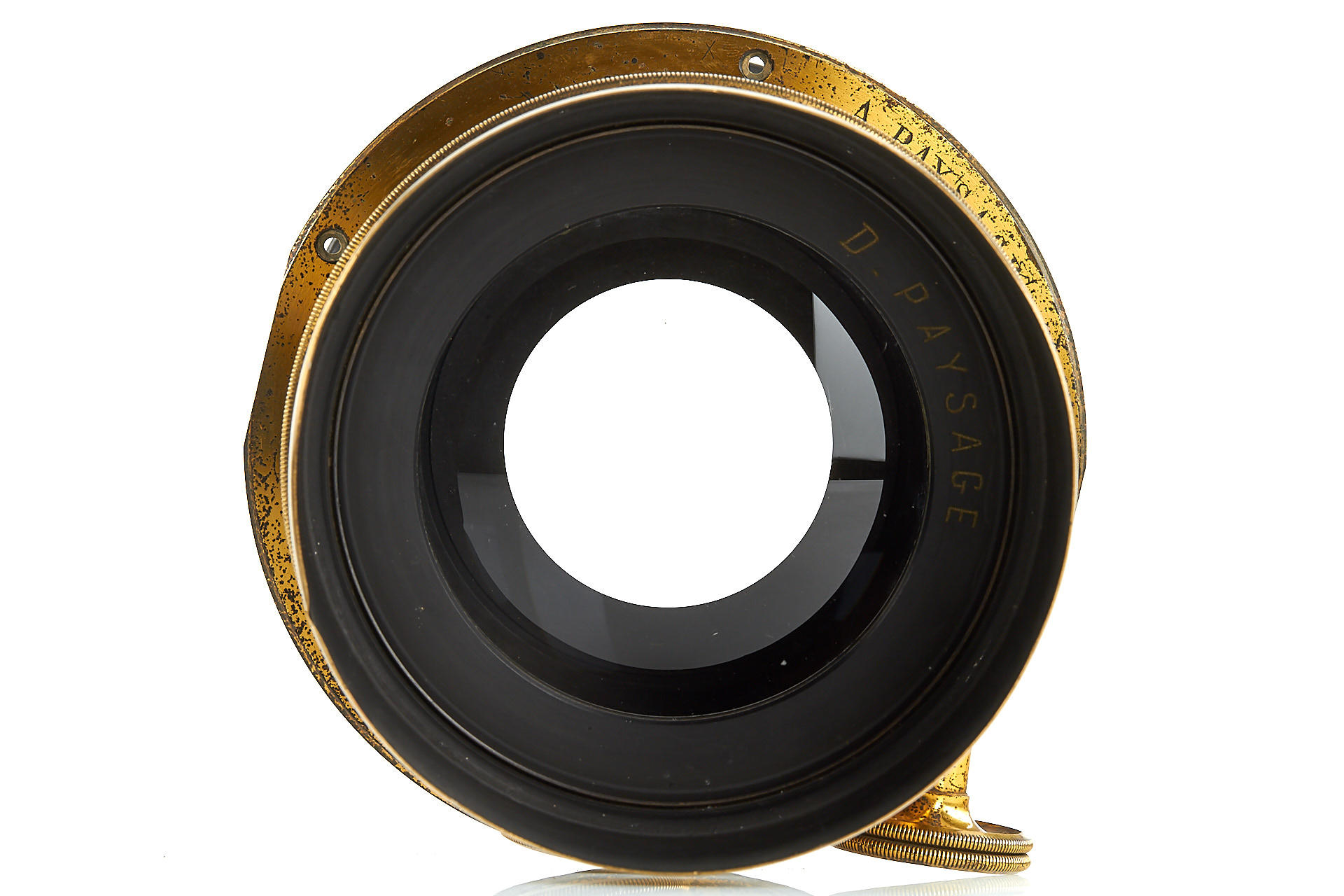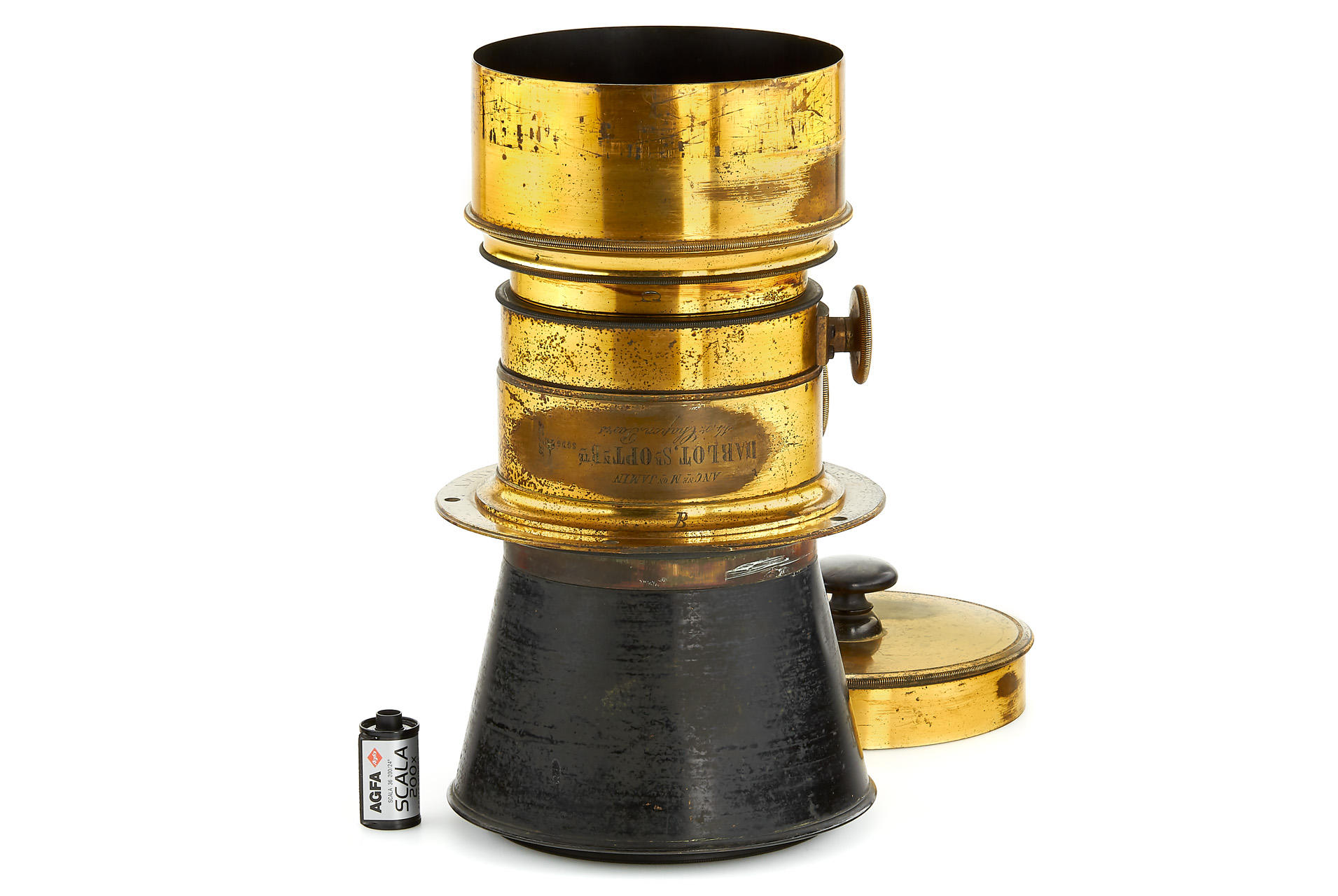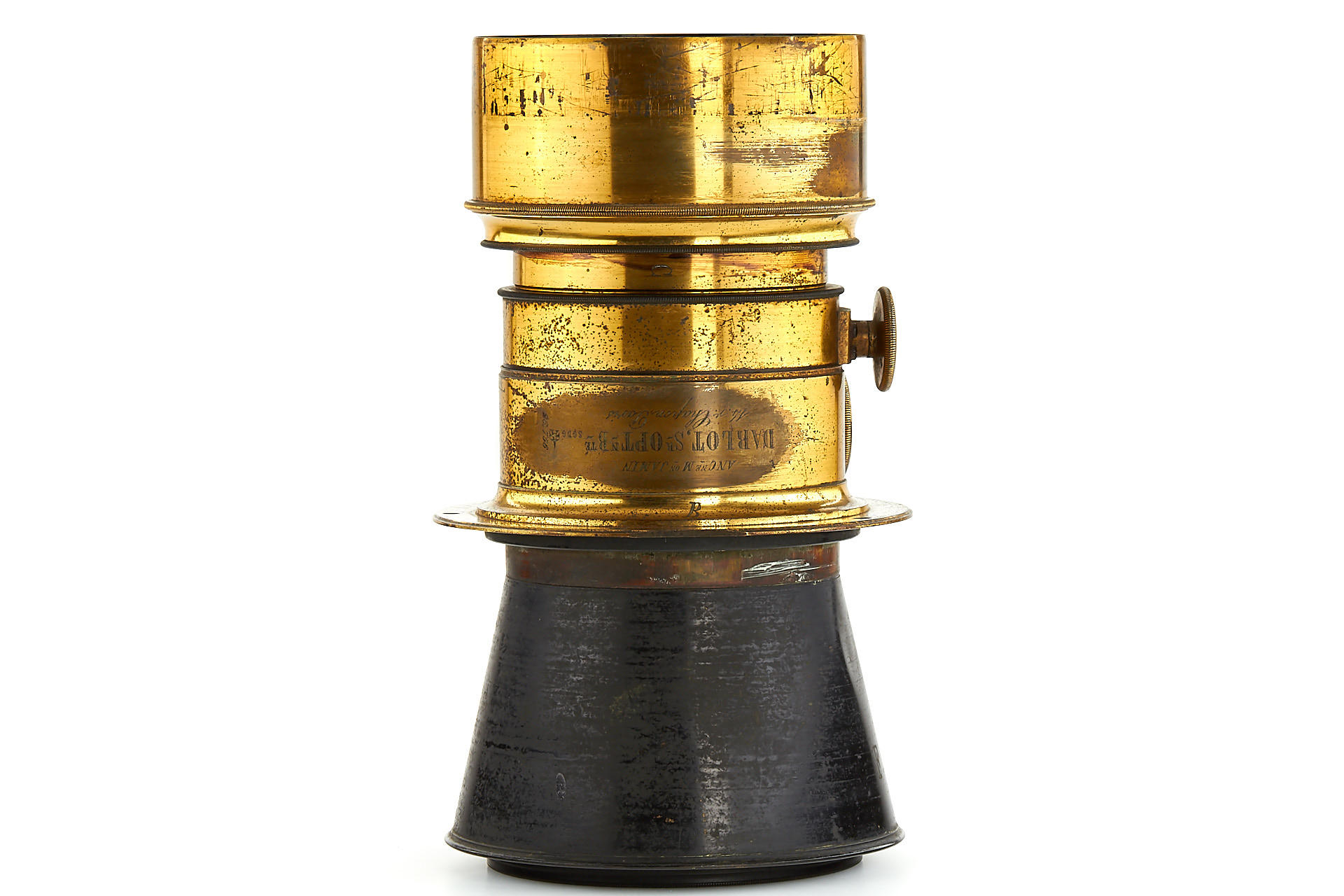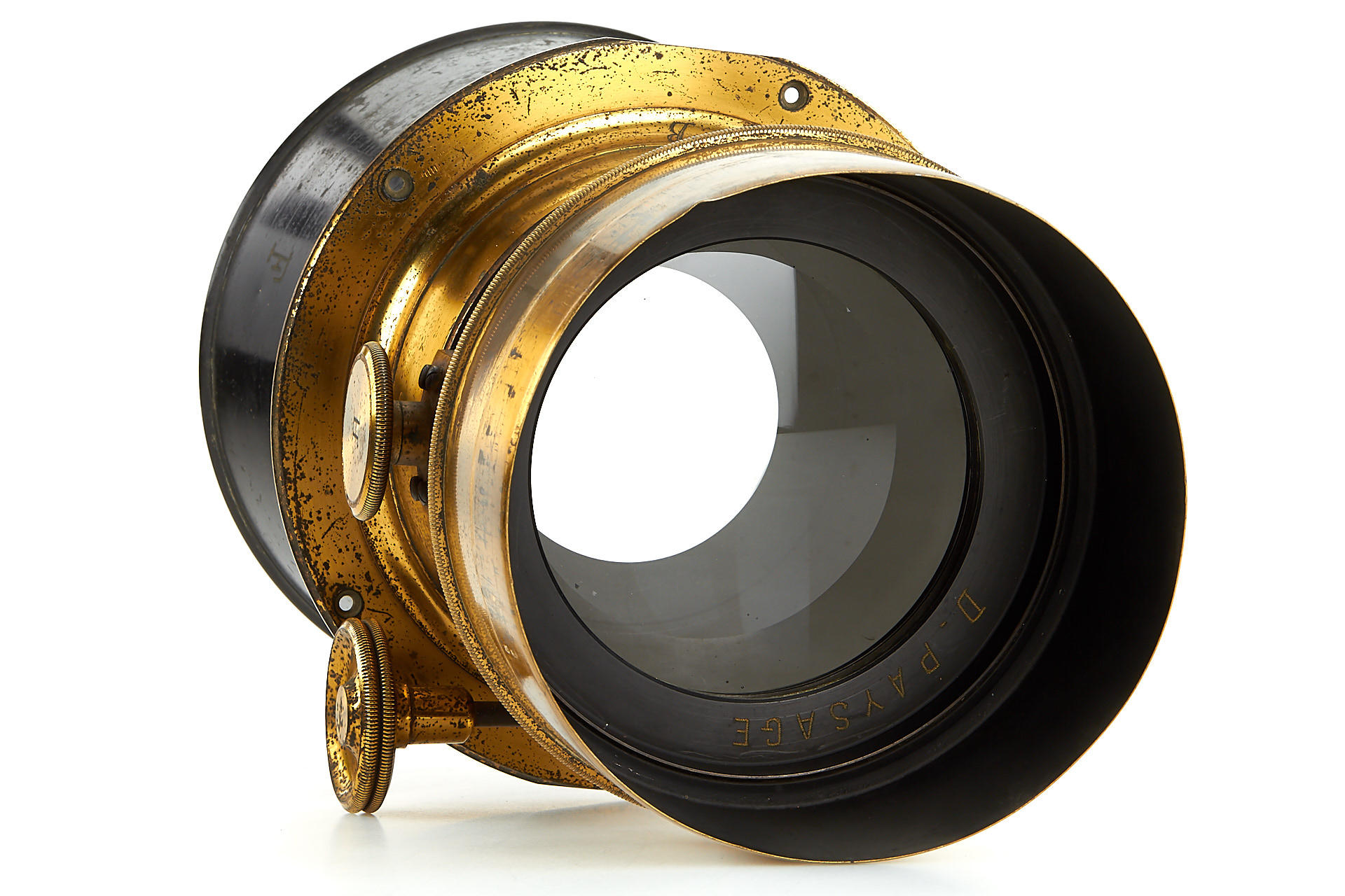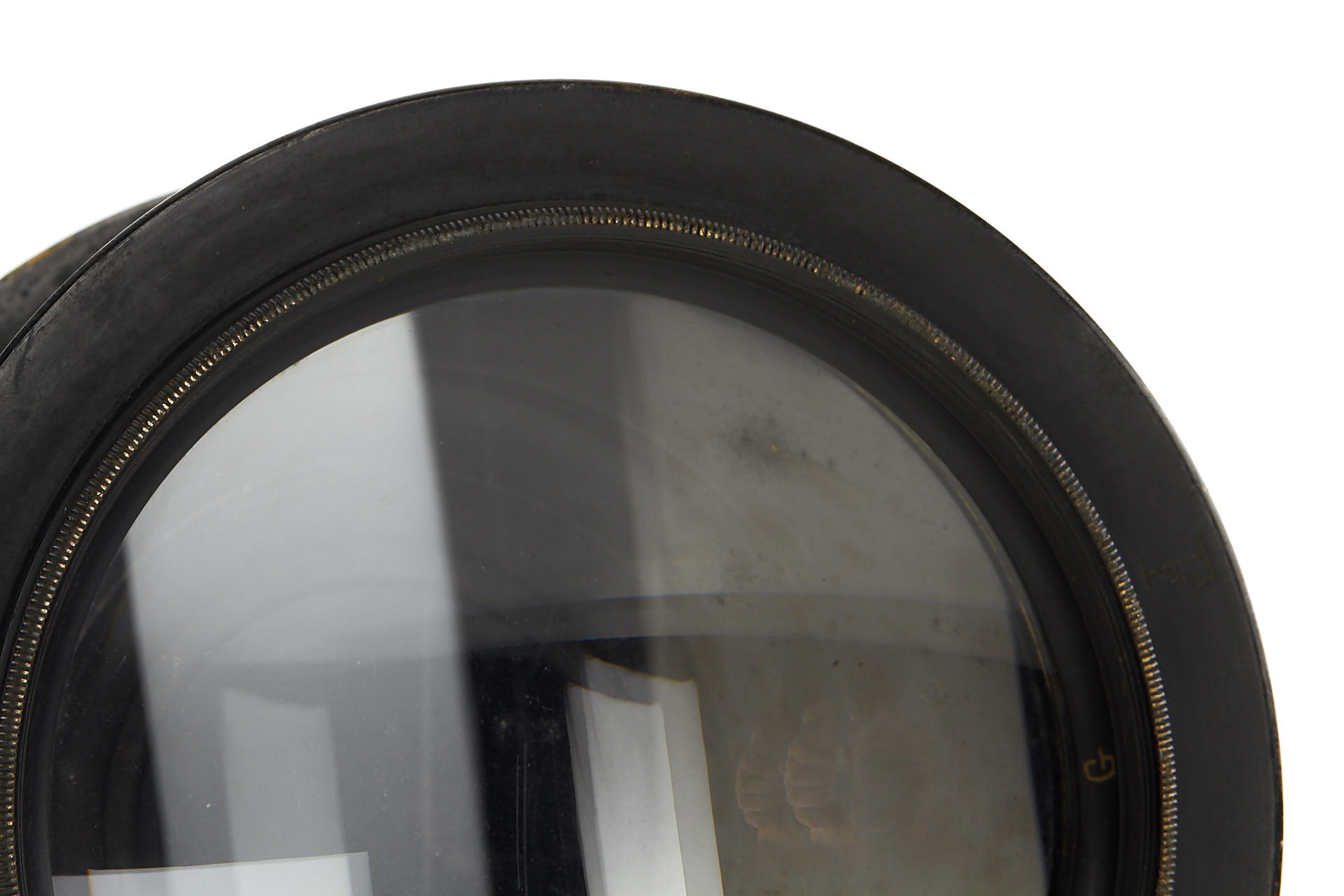 impressive brass lens for portraits and landscape, it has been designed to work as a landscape lens by unscrewing the rear group completely and mounting the lens reversed (with front-facing aperture) on the camera, total height with hood 33cm, in fine condition, no missing parts, very good optics, with original front cap, in this large size very hard to find