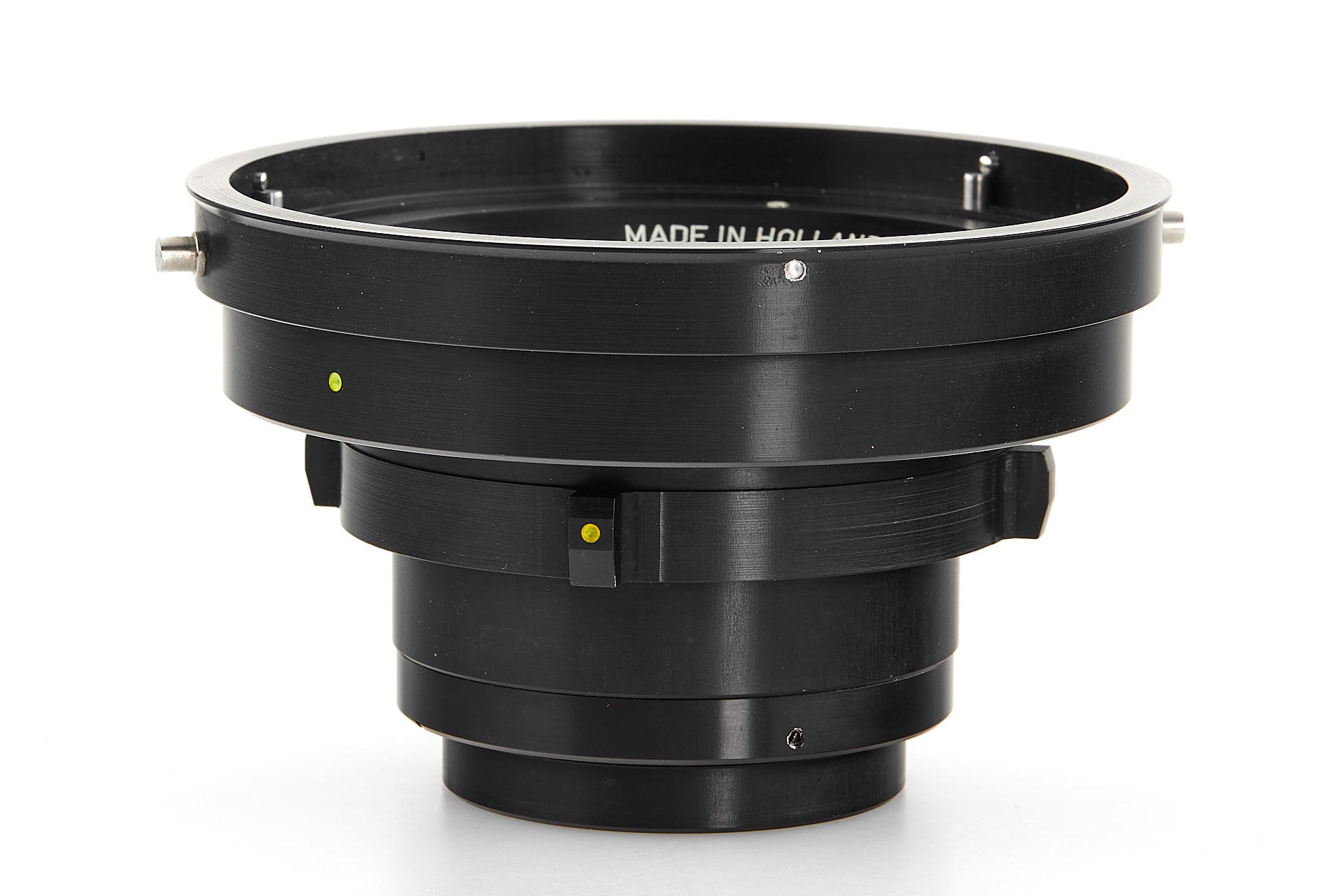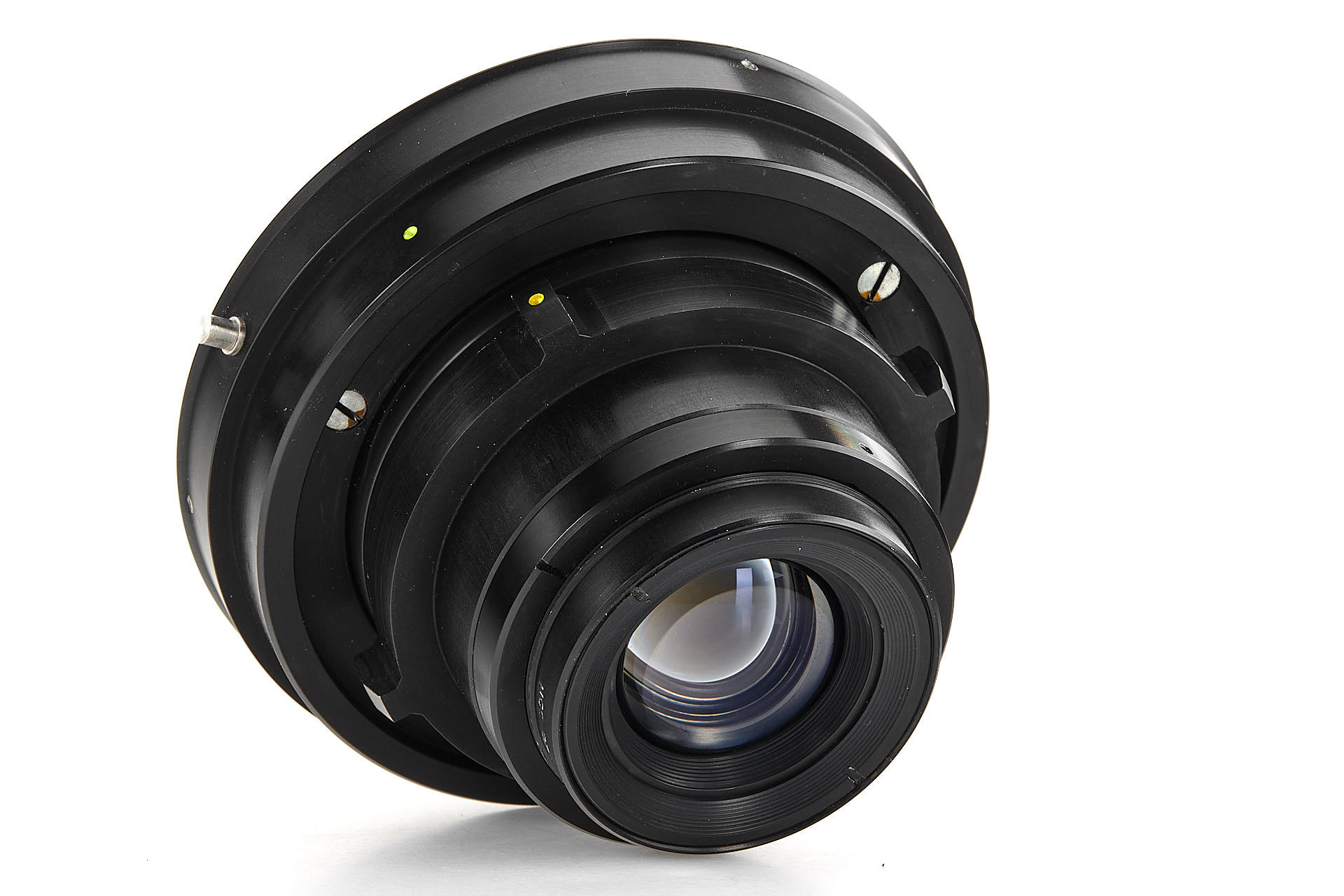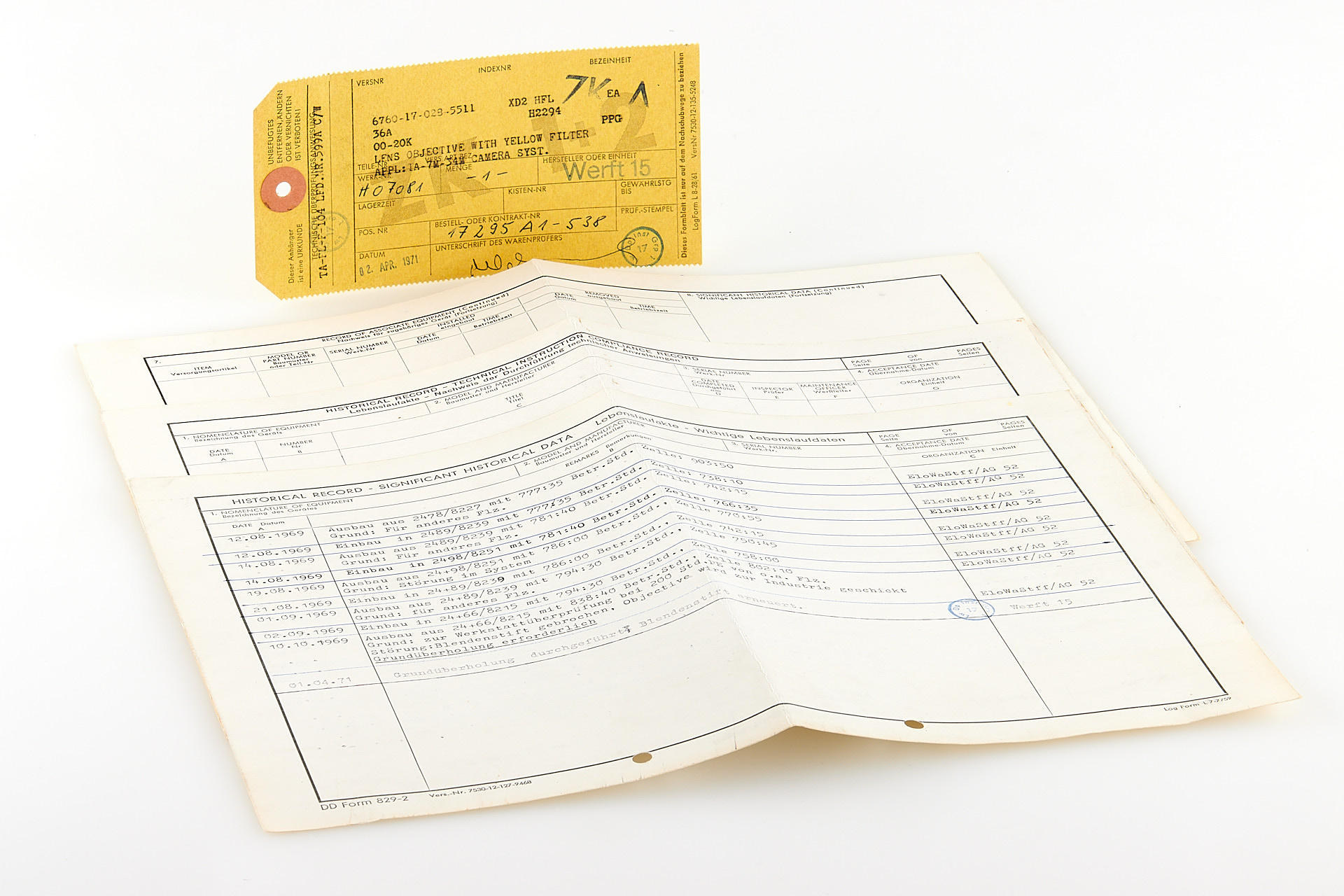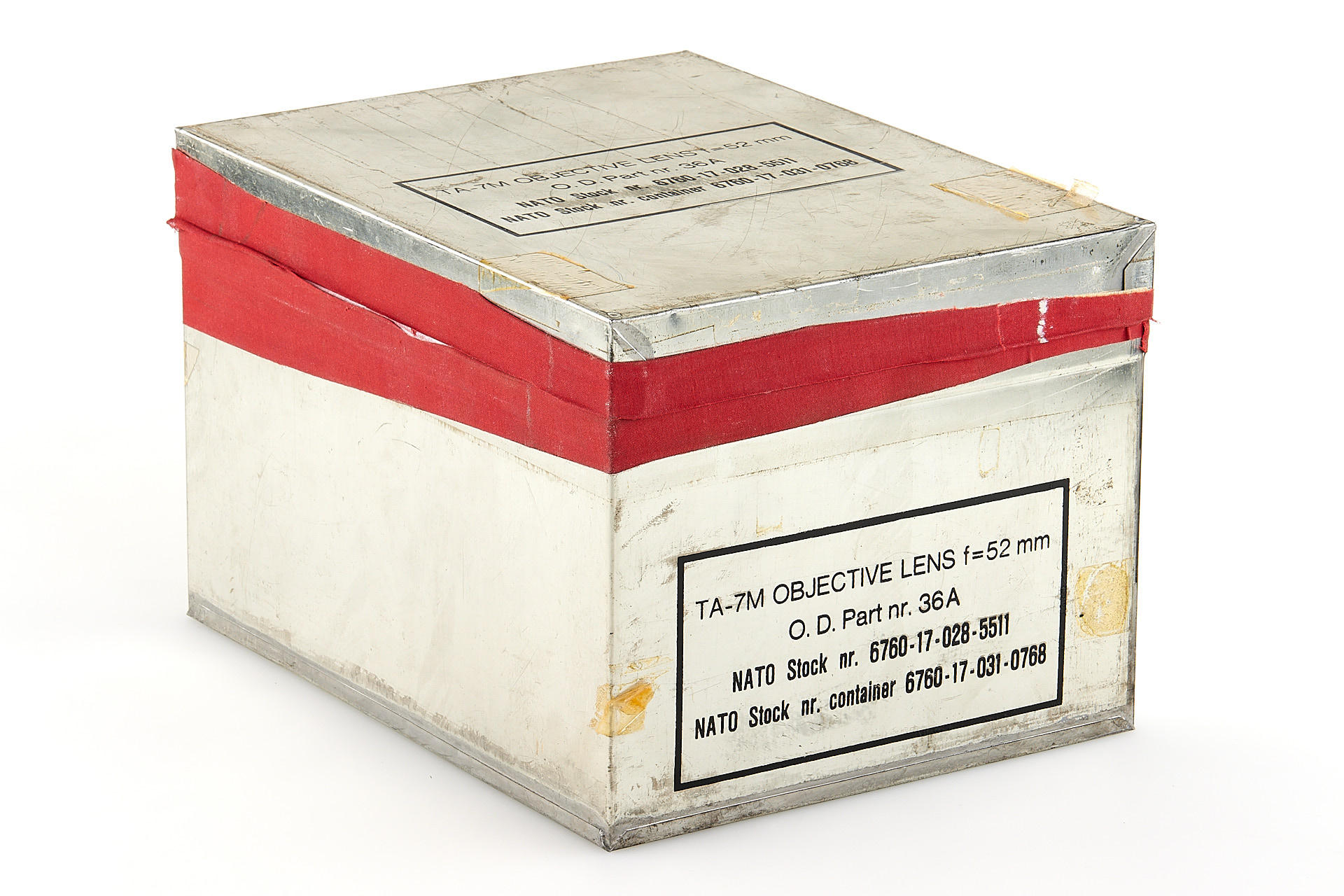 Rare high resolution aerial lens made in the Netherlands for TA-7M 70x70mm cameras used by the NATO, mounted on F-104 to F-16 aircrafts, in mint condition, NATO stock number '6760-17-028-5511' with yellow filter Y2, silica gel bags, plastic keepers and original NATO tin stock container (rear element thread diameter: 52mm)