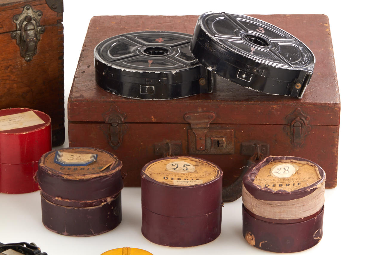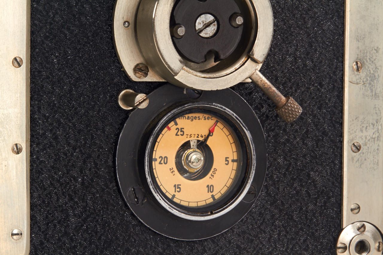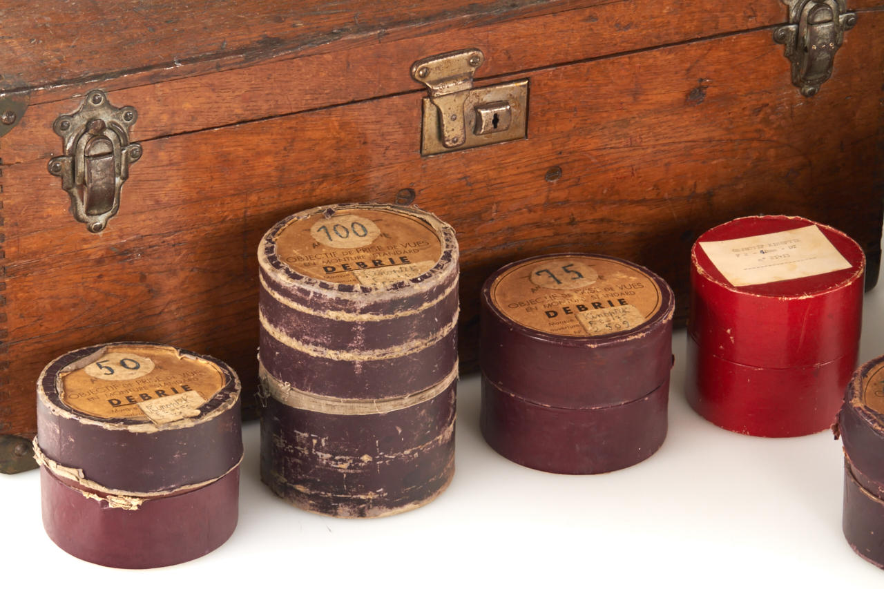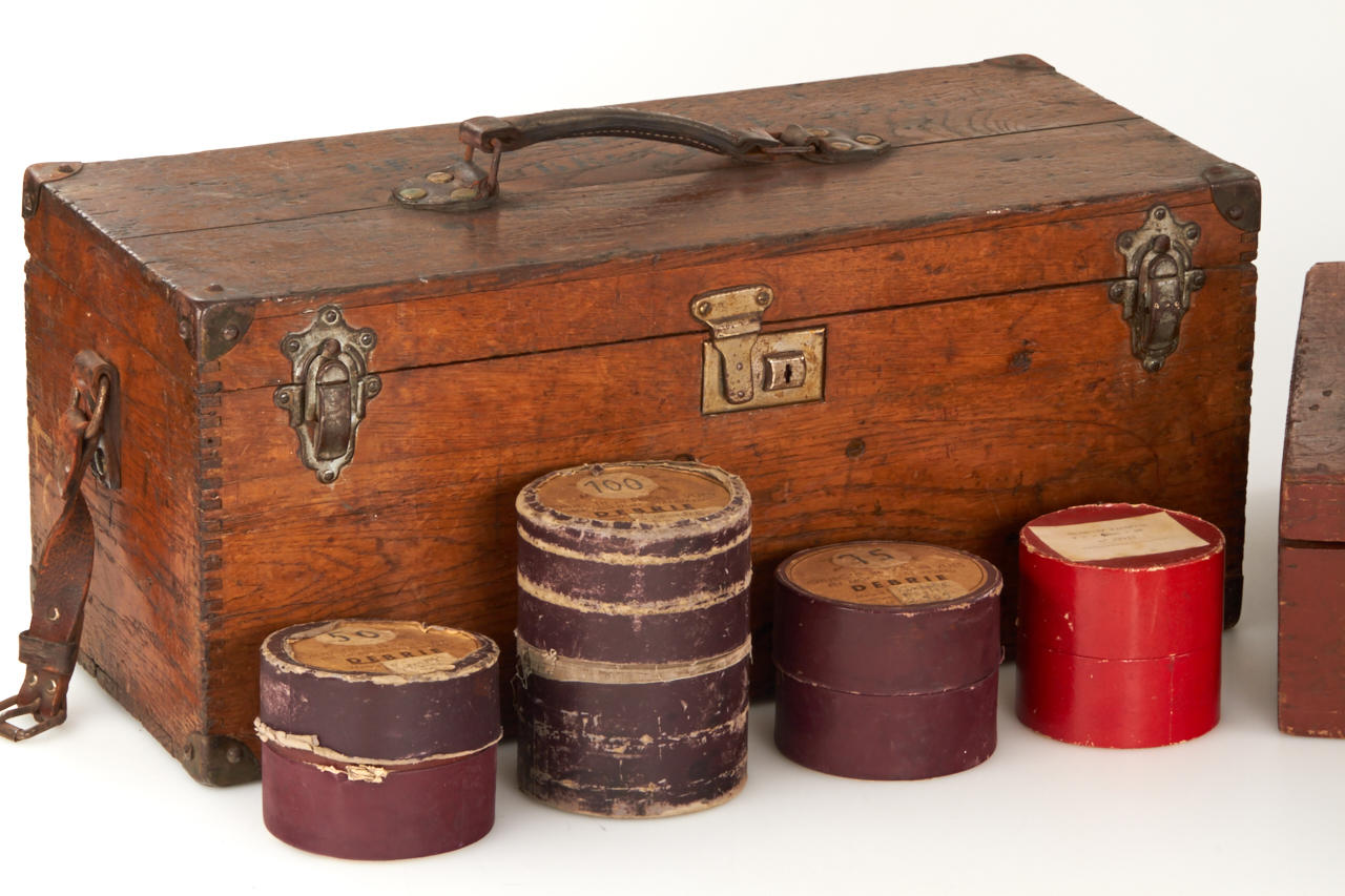 professional hand-cranked 35mm motion picture camera, outfit with one Kinoptik 2/50mm no.21413 and seven sought after, high quality Kinoptik Apochromat f.2 lenses: 25mm, 28mm, 35mm, 40mm, 50mm, 75mm and 100mm, all lenses in good condition with clean optics, all Apochromat lenses with maker's boxes, the set also includes wooden carrying cases for the camera and for the lenses, two film spools, two cranks and hood with filter slots