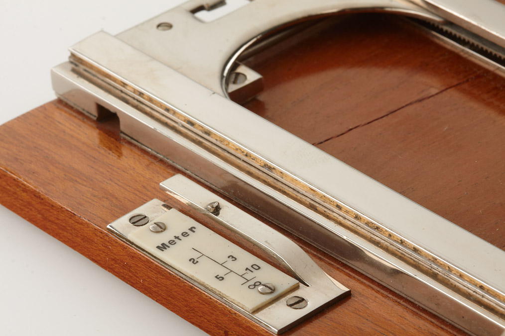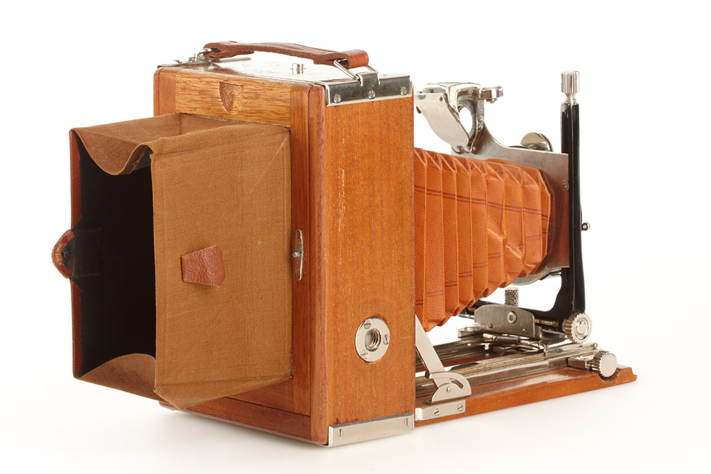 unidentified German wooden camera with nickel fittings, brown bellows (similar to Contessa Nettel), Rodenstock Trinar-Anastigmat 4.5/13.5cm no.246695 in Ibsor shutter, 4 platefilm holders and filmpack holder, case
