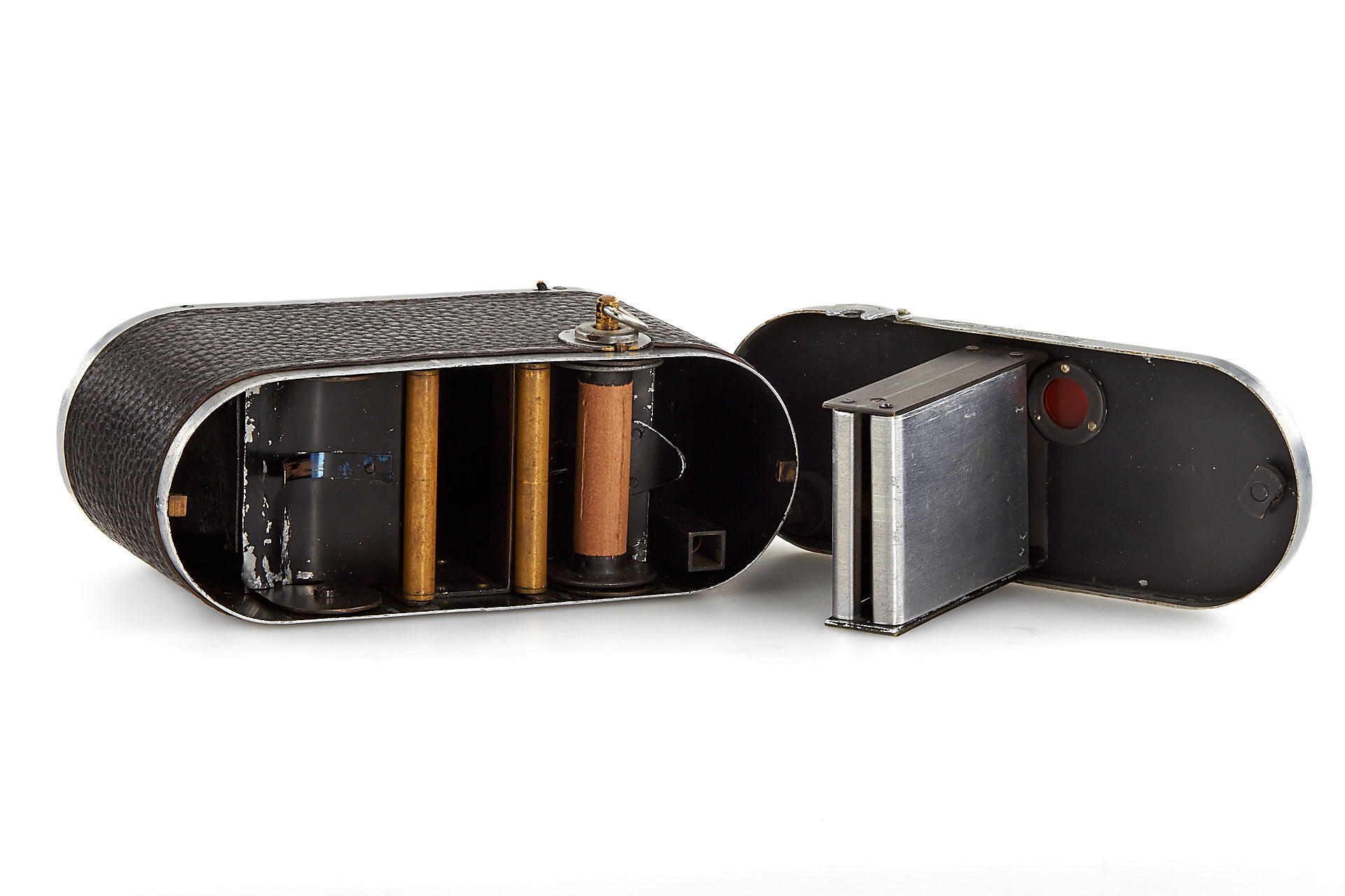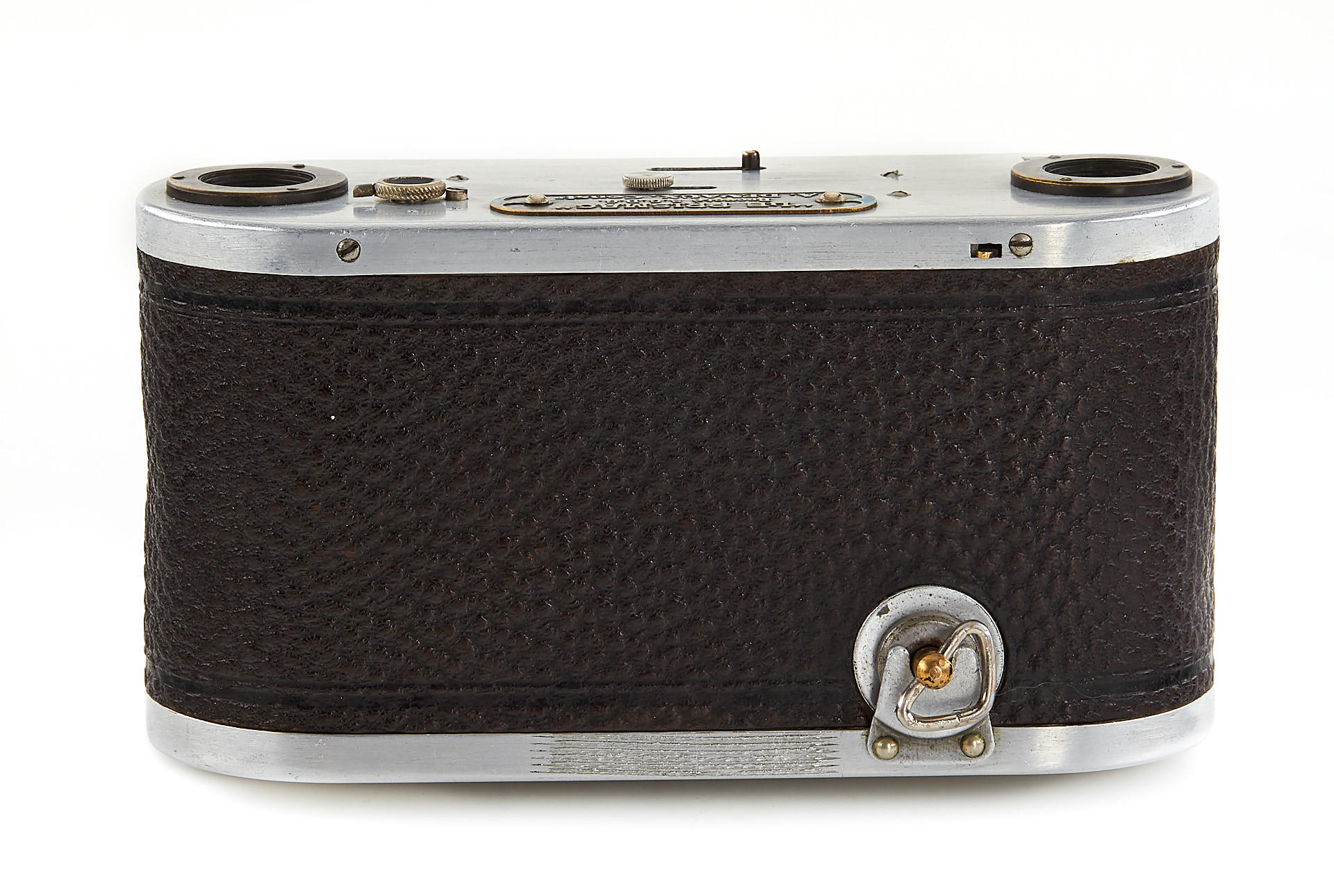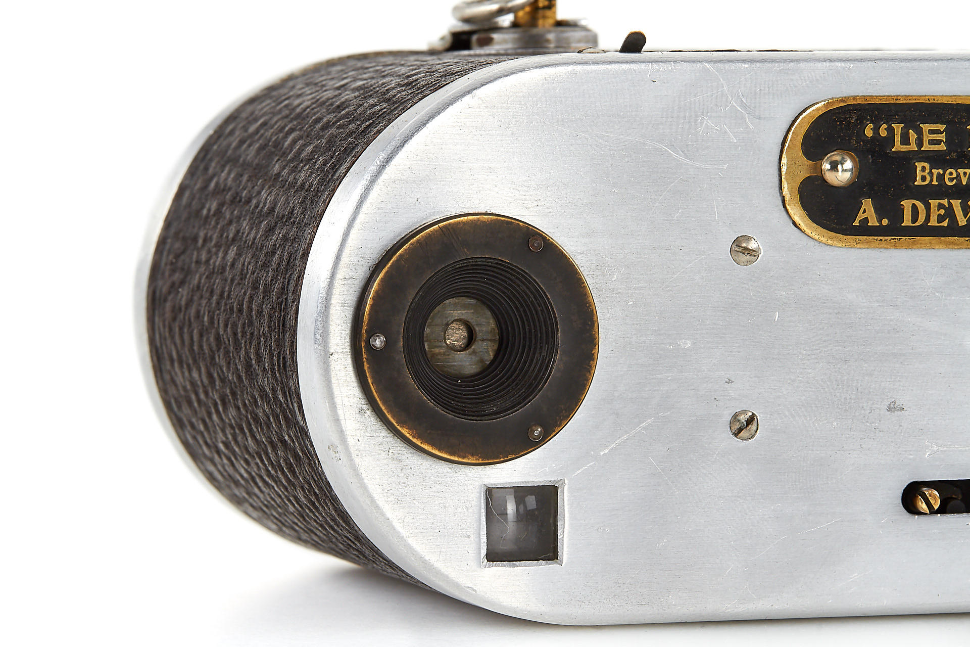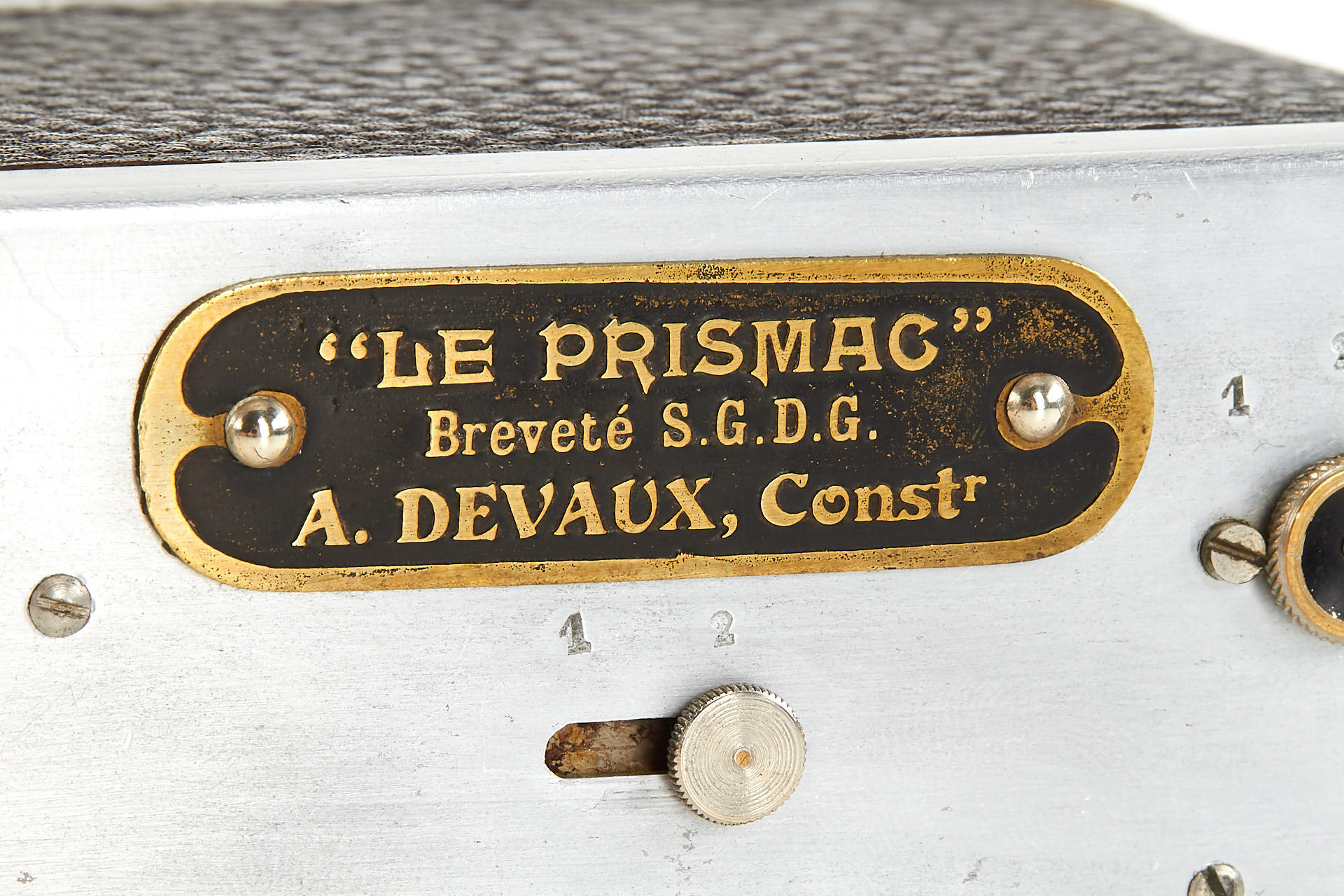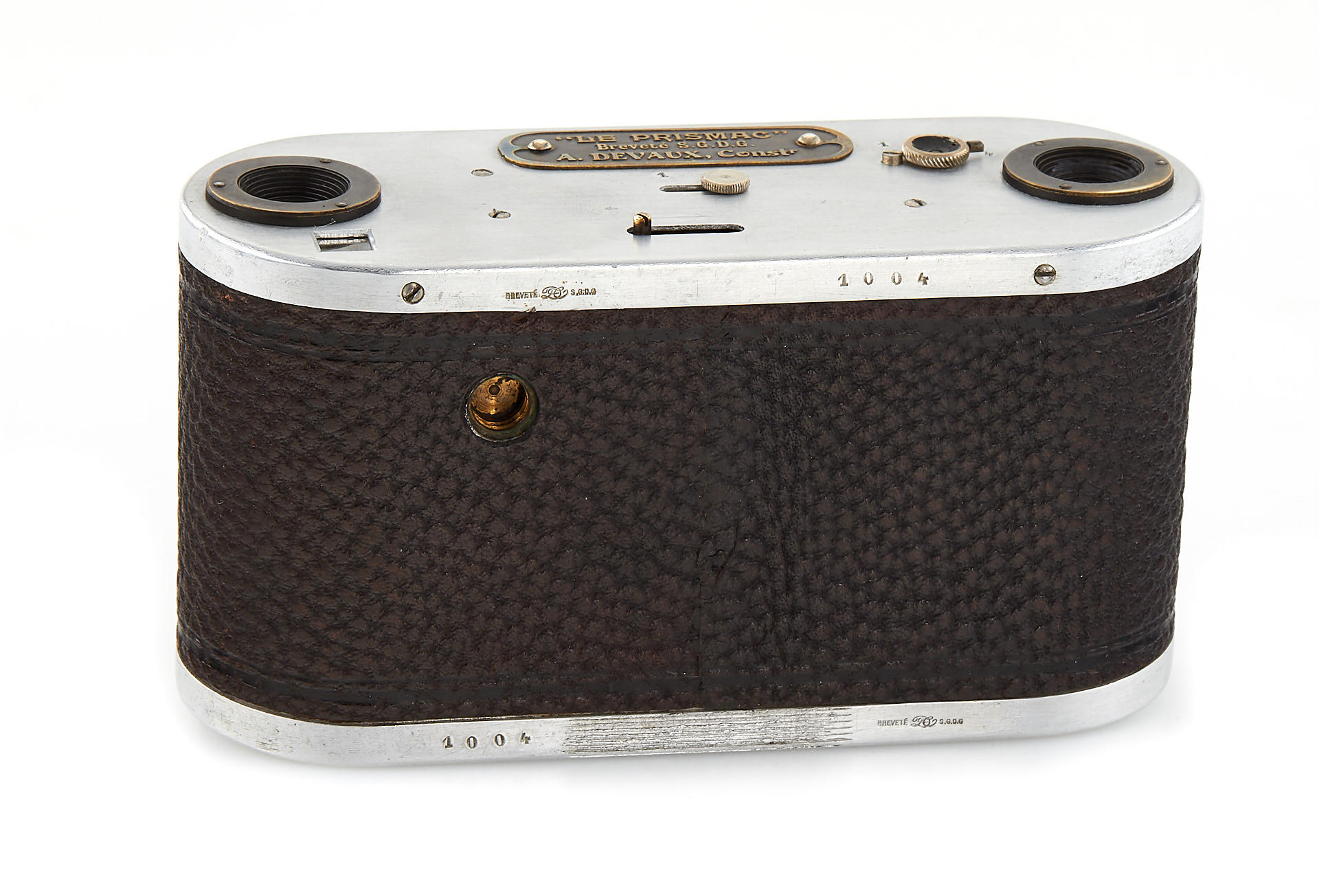 Small version Prismac for 4x4,5cm exposures on rollfilm, leather-covered aluminum body (15cm wide compared to 16.2cm on later version), 4-speed guillotine shutter, a pair of unmarked lenses; invented by Deloye and built by Devaux (maker's plaque on front bears only the Devaux name), unique construction with two internal 90 degree prisms to reflect the image at right angles from the lenses onto the film. Serial number 1004, in excellent condition, with leather case. So far, this is the only known example to exist.
