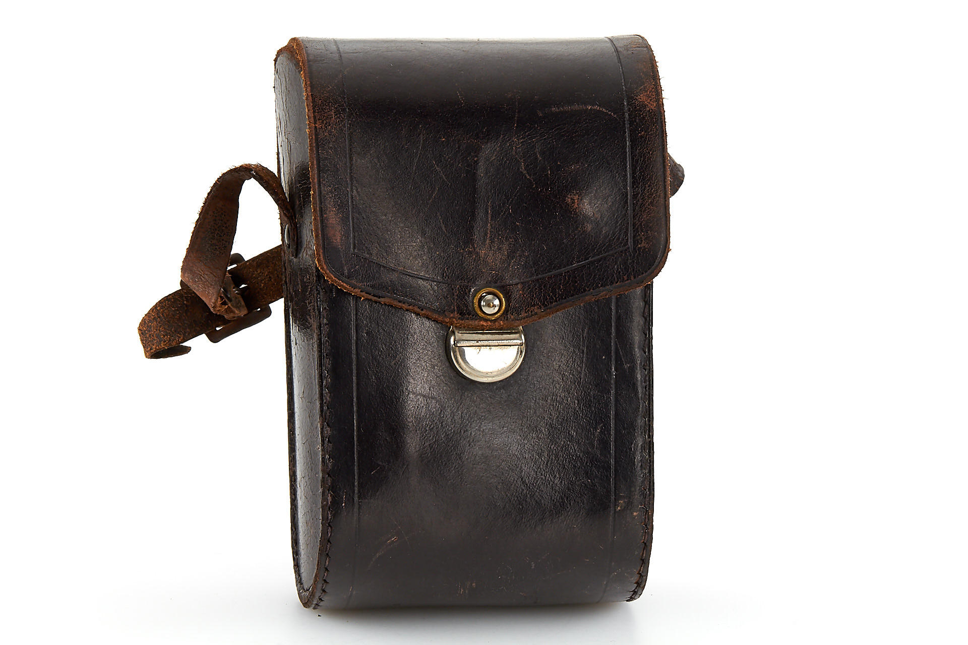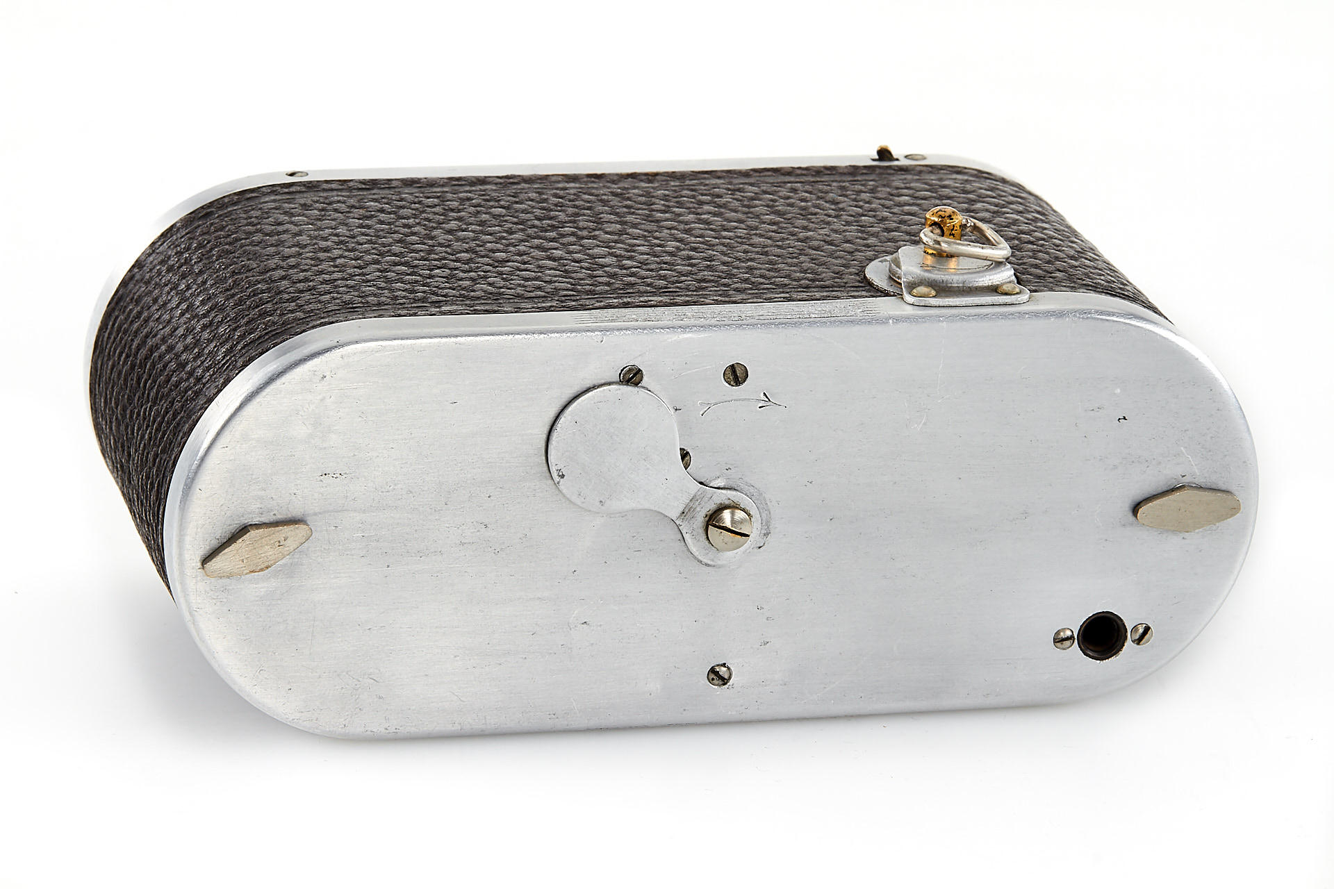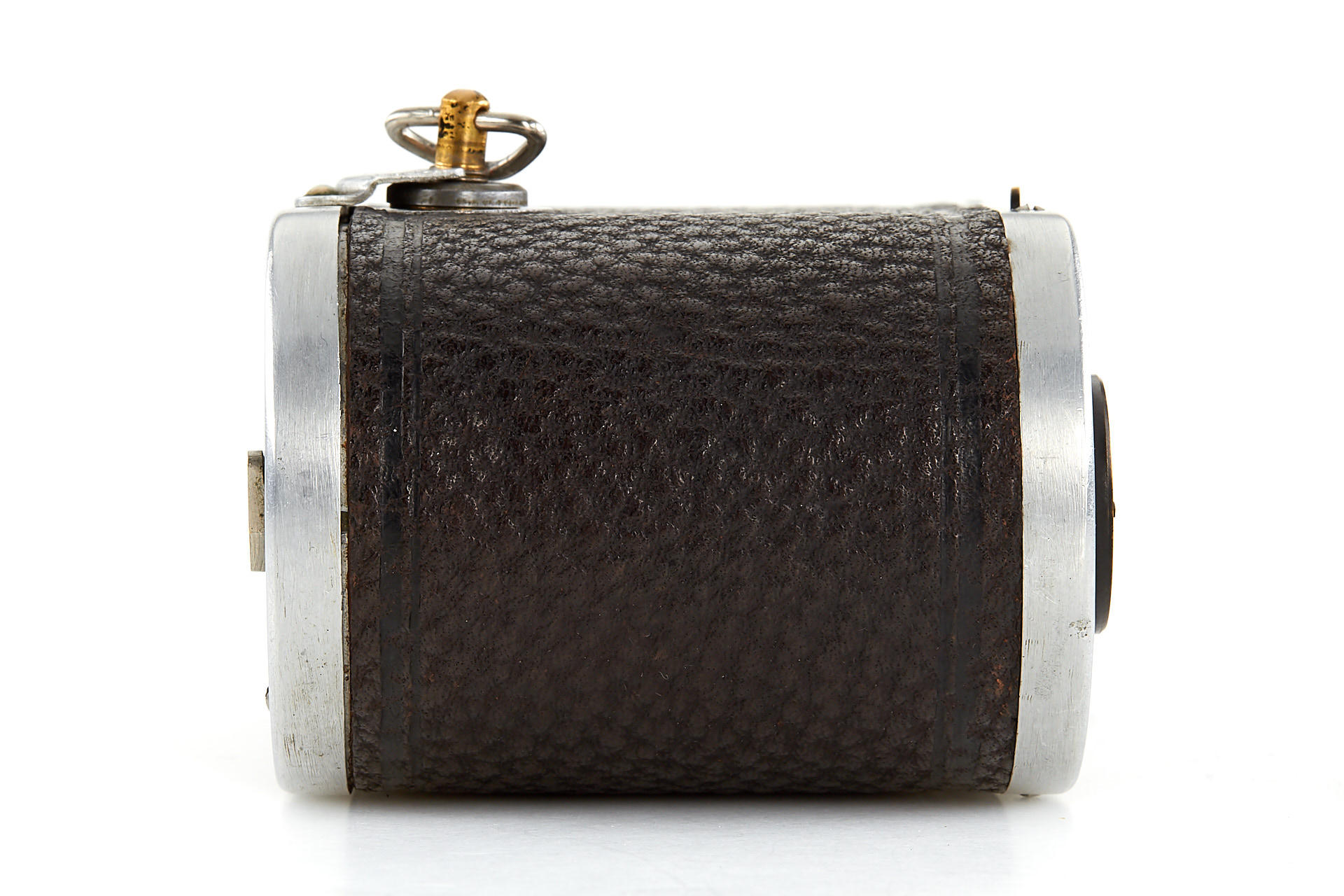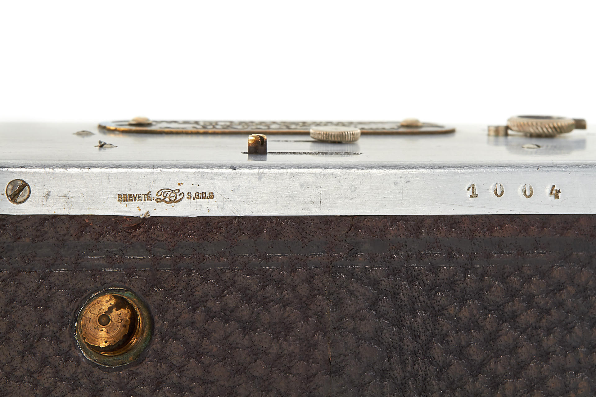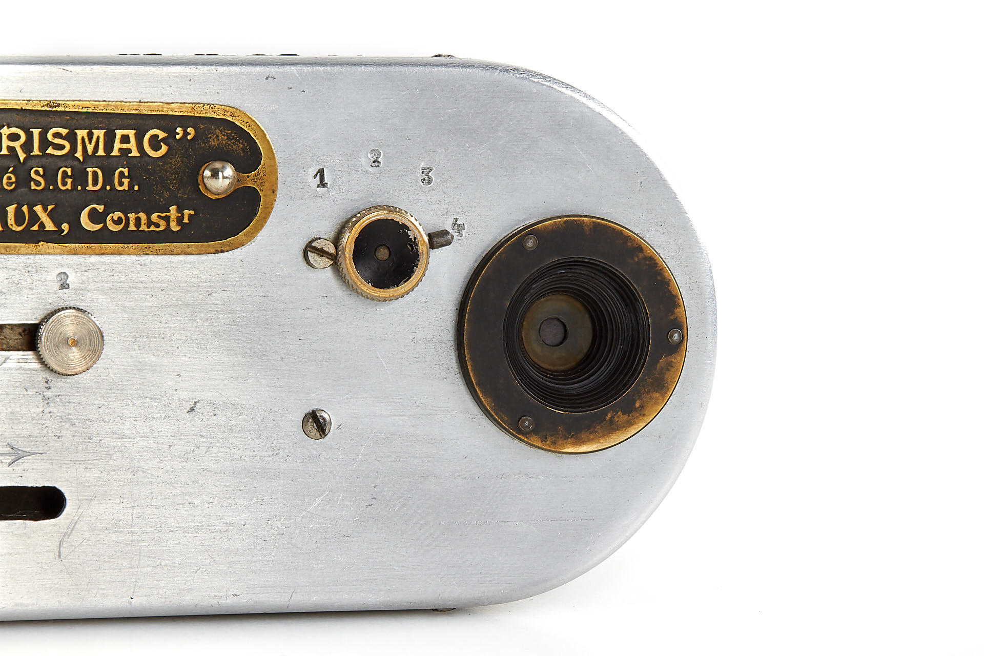 Small version Prismac for 4x4,5cm exposures on rollfilm, leather-covered aluminum body (15cm wide compared to 16.2cm on later version), 4-speed guillotine shutter, a pair of unmarked lenses; invented by Deloye and built by Devaux (maker's plaque on front bears only the Devaux name), unique construction with two internal 90 degree prisms to reflect the image at right angles from the lenses onto the film. Serial number 1004, in excellent condition, with leather case. So far, this is the only known example to exist.